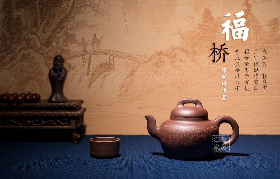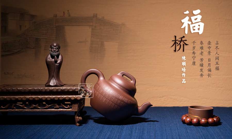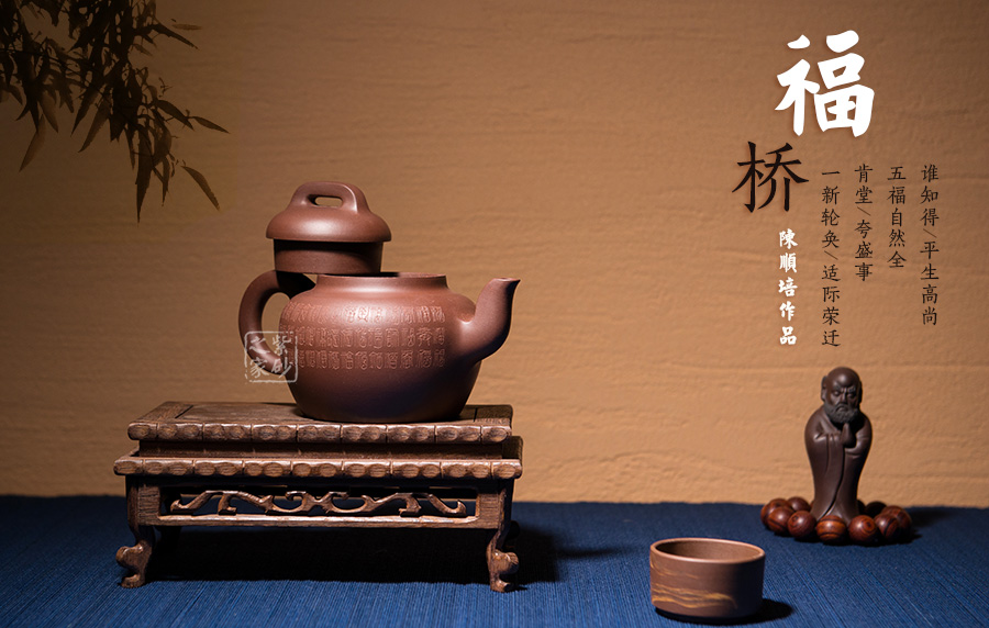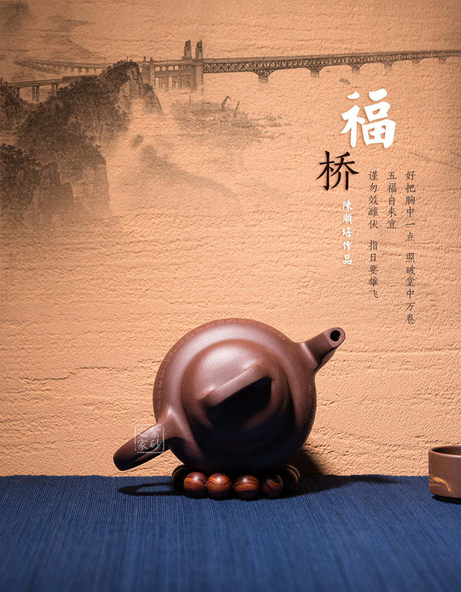 陳順培老師此款福橋壺身圓潤很有福相,底至腹若碗底,一道棱線相接,倒是增添了幾分骨骼清奇的味道。壺流圓孔方形上方下圓,耳形把外方內(nèi)圓,剛?cè)岵?jì),壺蓋之上的壺鈕似橋梁連接兩端,壺身篆刻不同字體的“福”字,福橋之意由此而生,整器簡潔大方,實用性佳!