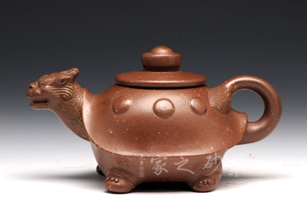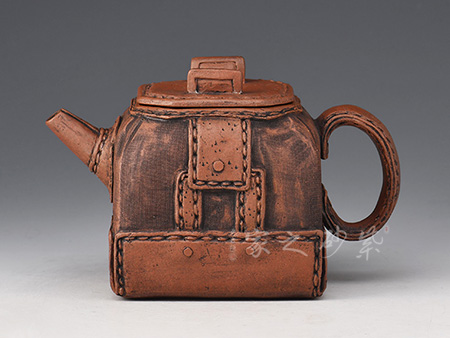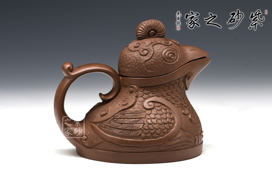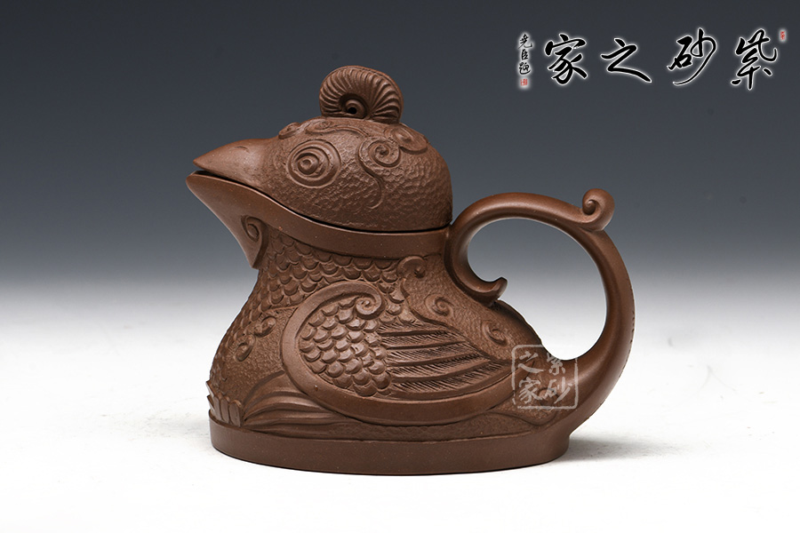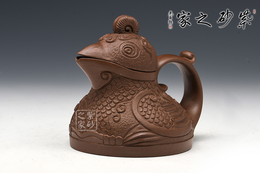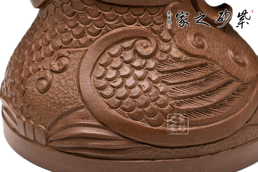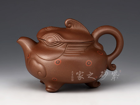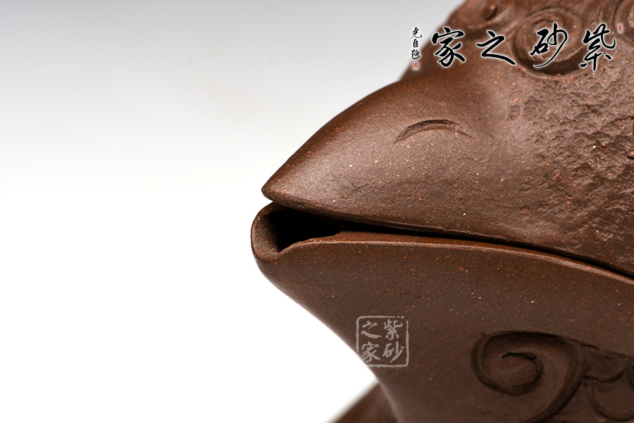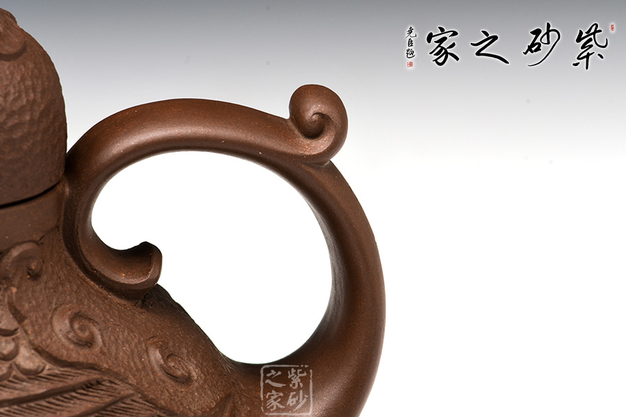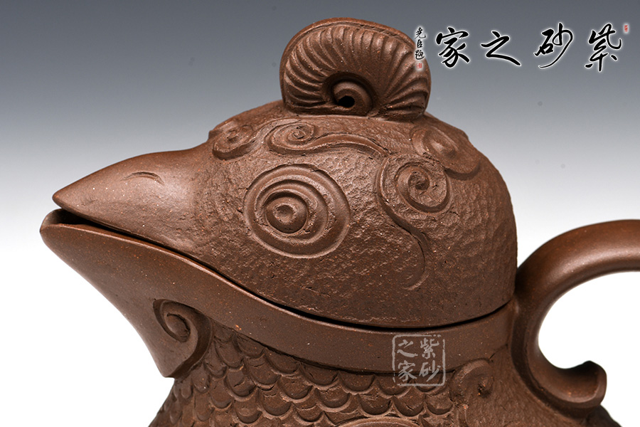 這款“天雞壺”造型生動,色澤凝重,作品以壺嘴作成雞首狀,壺把作雞尾,前后對稱,還有雞冠壺鈕,設(shè)計別致精巧。老師發(fā)揮雕鏤之長,采用多種紋飾,工藝精細(xì),使其成為紫砂史上一件難得的精品。