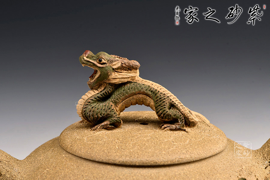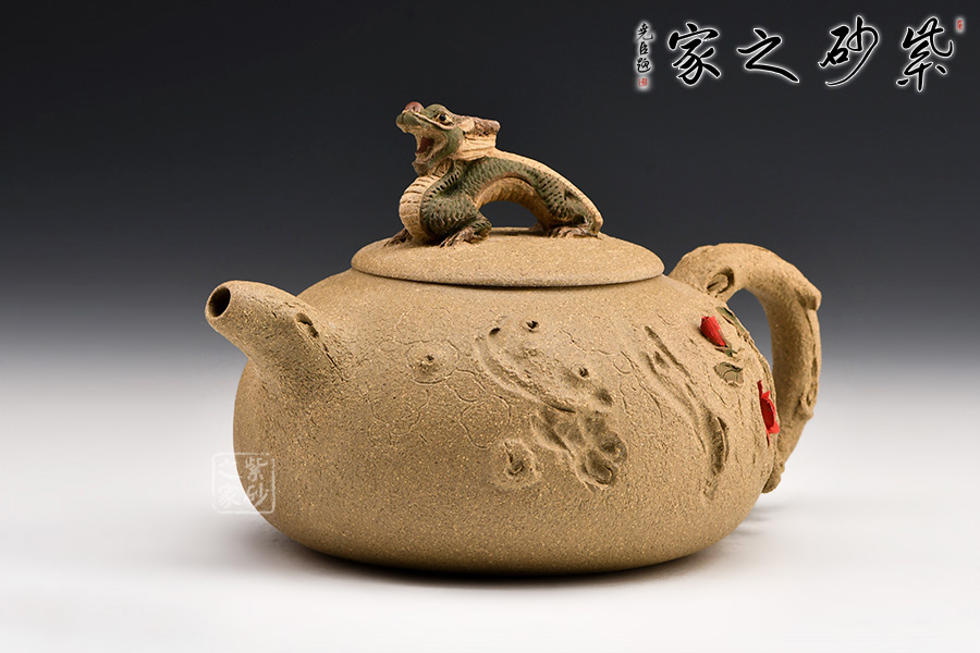 此壺以十二生肖中的龍為壺鈕,生動形象,活靈活現(xiàn)。壺身圓潤,有凹點、溝壑點綴其上,營造出滄桑的樹皮質(zhì)感。枝干作壺嘴和壺把:彎嘴出水暢快,圓把彎曲有力。令人嘖嘖稱奇之處在于把一側(cè)胥出枝丫,長出嫩葉,開出紅花。花朵嬌嫩艷麗,栩栩如生,奪人眼球。不得不感嘆倪順金老師實在構(gòu)思巧妙!