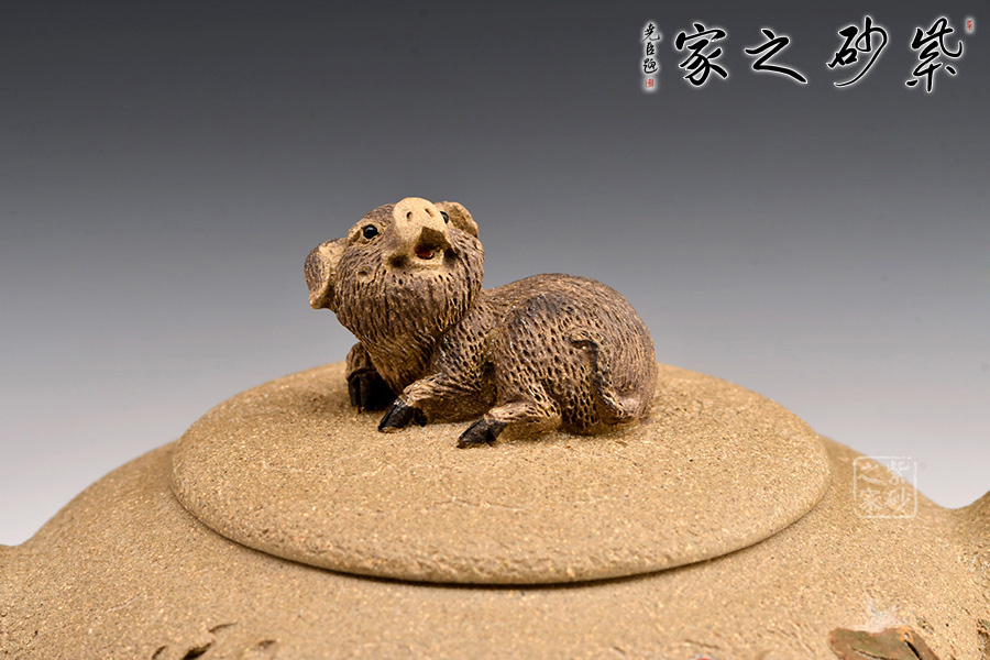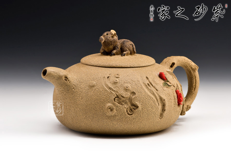 此壺以十二生肖中的豬為壺鈕,生動形象,活靈活現。壺身圓潤,有凹點、溝壑點綴其上,營造出滄桑的樹皮質感。枝干作壺嘴和壺把:彎嘴出水暢快,圓把彎曲有力。令人嘖嘖稱奇之處在于把一側胥出枝丫,長出嫩葉,開出紅花。花朵嬌嫩艷麗,栩栩如生,奪人眼球。不得不感嘆倪順金老師實在構思巧妙!