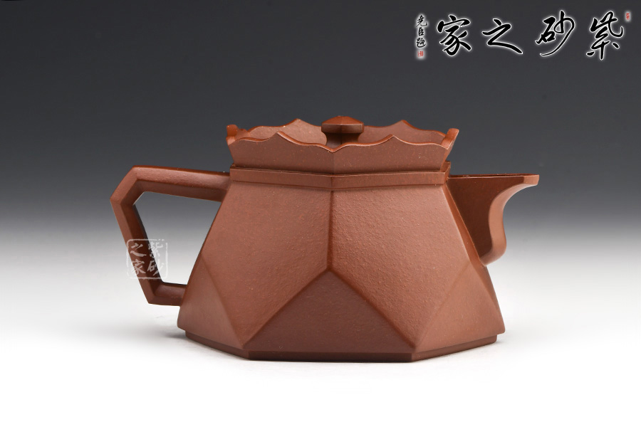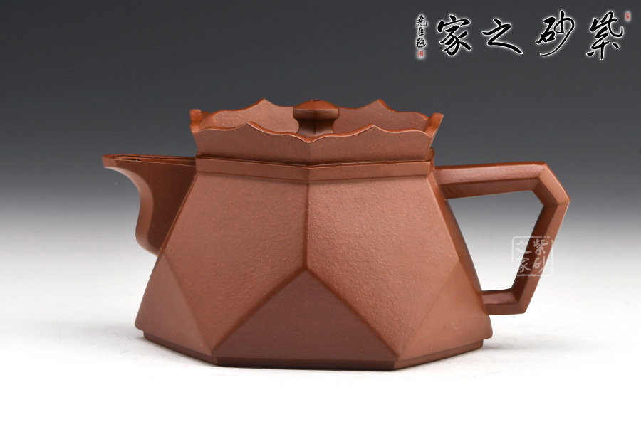 制作此壺的靈感來源于僧帽壺。壺體采用六方造型,壺身上下收斂,壺腹圓鼓卻可見弧度,壺口由六片相同形狀帽沿圍繞而成,如同一保護(hù)墻,壺蓋同樣以六方形出現(xiàn)與壺口相對應(yīng),兩者結(jié)合緊密,如同一體,壺把方中見圓,中間有一凸起作為點(diǎn)綴,壺嘴更具特色,如同一鴨嘴出水孔居于上,增加趣味性。壺的整體線面挺括平正,輪廓線條分明,美感十足。