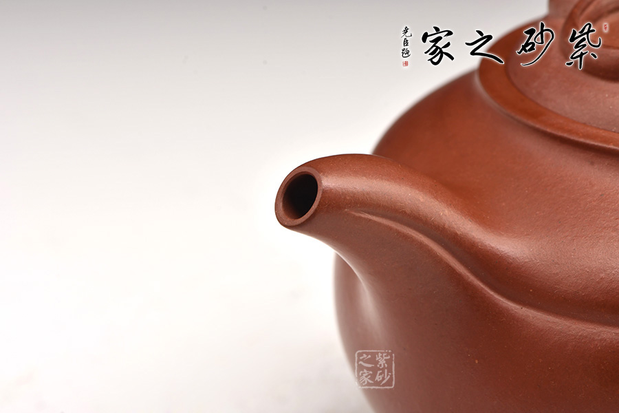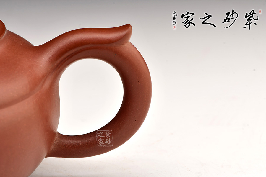 圈底,圓壺身。一條弧線貫穿壺嘴、壺身、壺把,通達(dá)順暢,一氣呵成。一彎嘴、耳型飛把制作精湛。