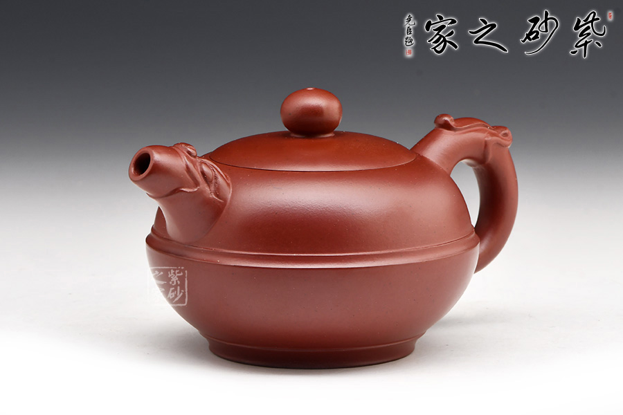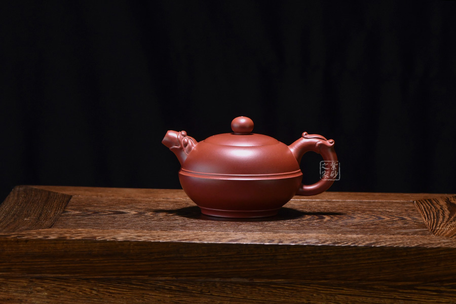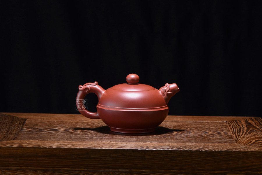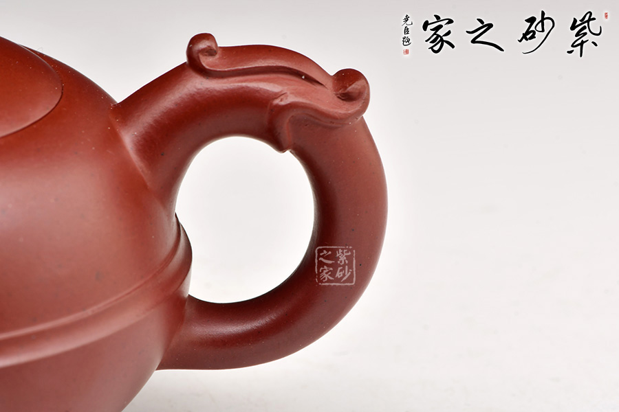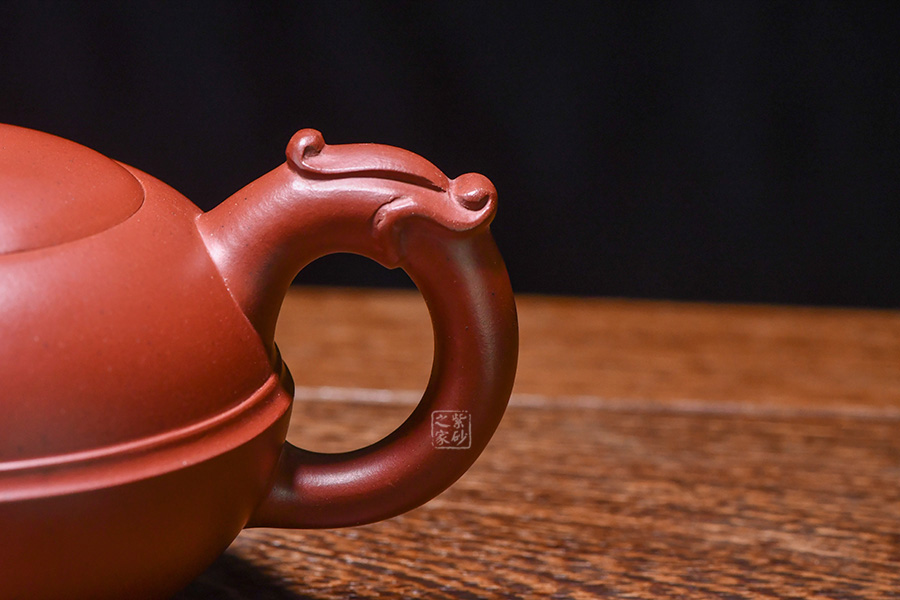 圈底,圓潤(rùn)的壺身,壺腹以兩棱線形成層次感,又好似纏上一條腰帶。截蓋,又圓又潤(rùn)的寶珠鈕亭亭玉立。彎嘴和耳把以龍為裝飾,搭配珠鈕,洽合“雙龍嬉寶”壺名。
