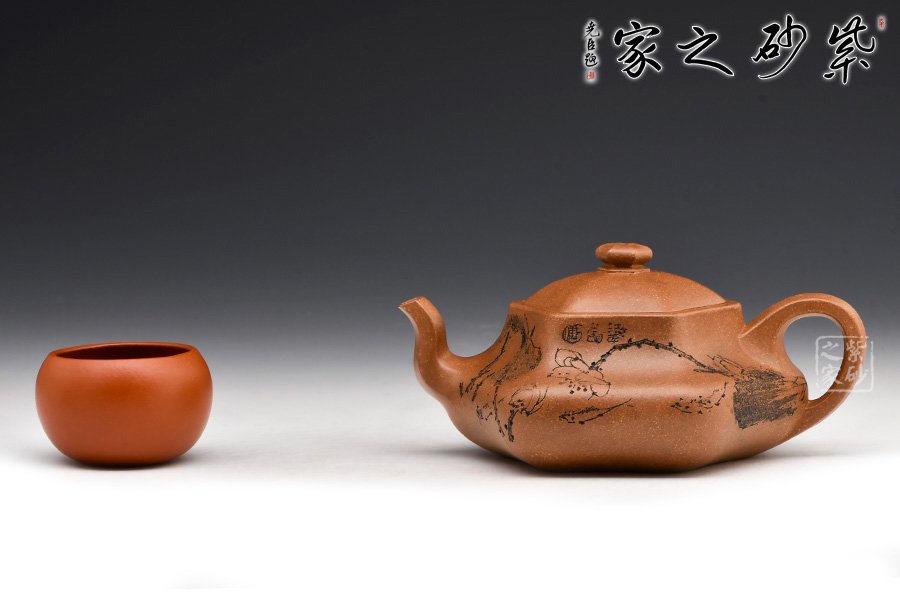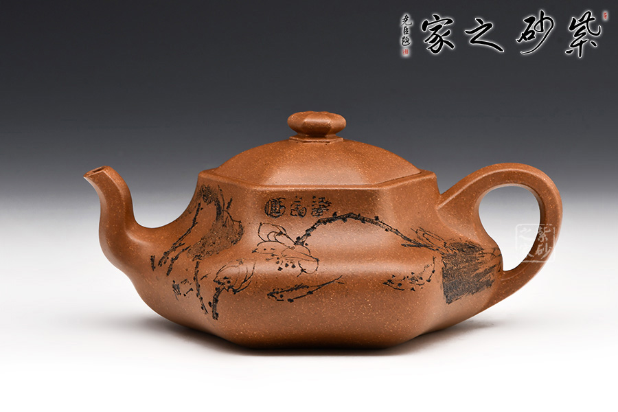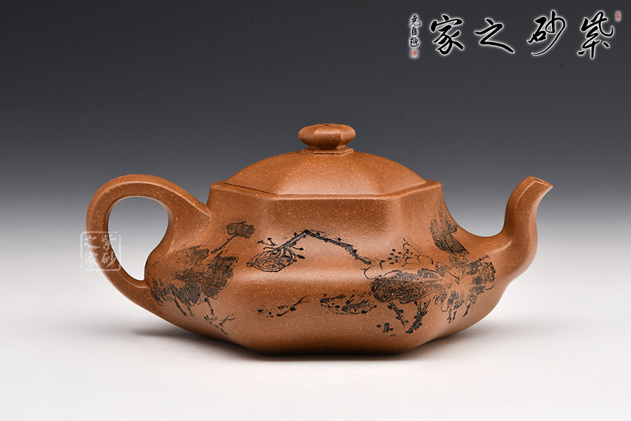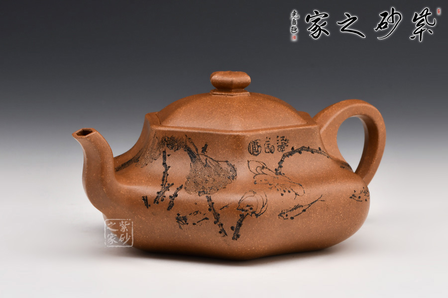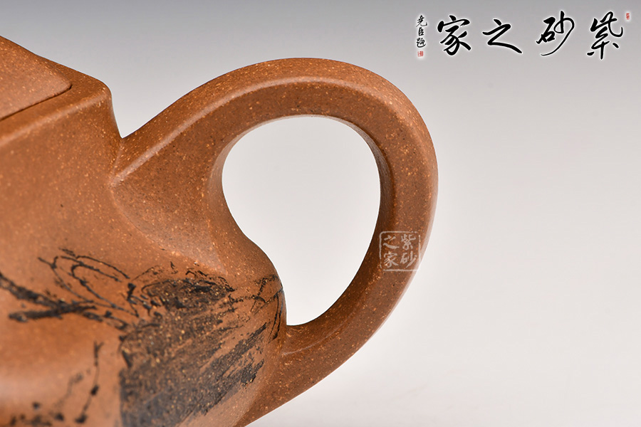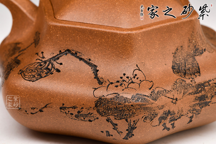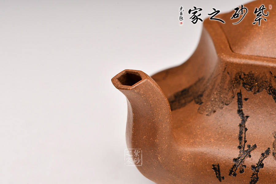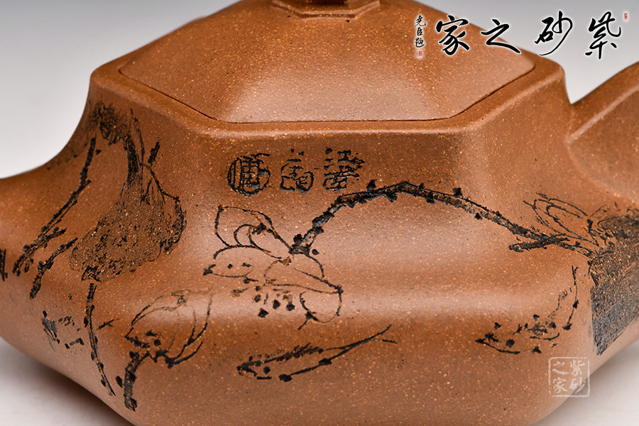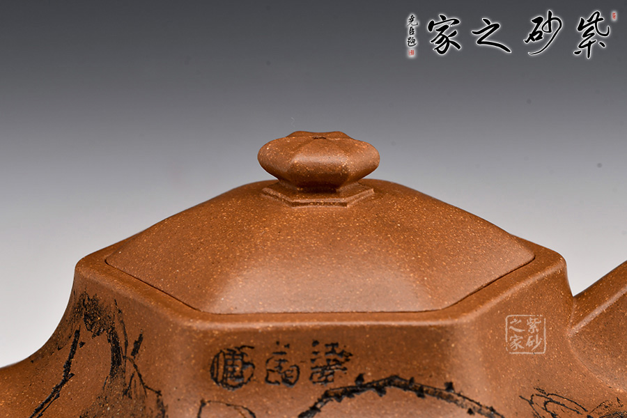 此作原礦黃金段泥作料,質(zhì)感細(xì)膩樸雅。壺形簡約美觀、流暢大氣。用六方幾何造型,更令其形體明快挺秀,具有陽剛之氣,輪廓分明,平穩(wěn)莊重。方圓結(jié)合,既可見線條的凌厲,又有造型的圓融。雙面刻繪,觀感古雅可見文心,厲上清老師刻繪功力之深,自不必說。壺身扁圓,壺頸高挺。六方壺蓋,扁圓六方鈕。壺嘴壺把彎曲有型。整體搭配得宜,細(xì)節(jié)可見工藝精湛。是把美壺,值得推薦!