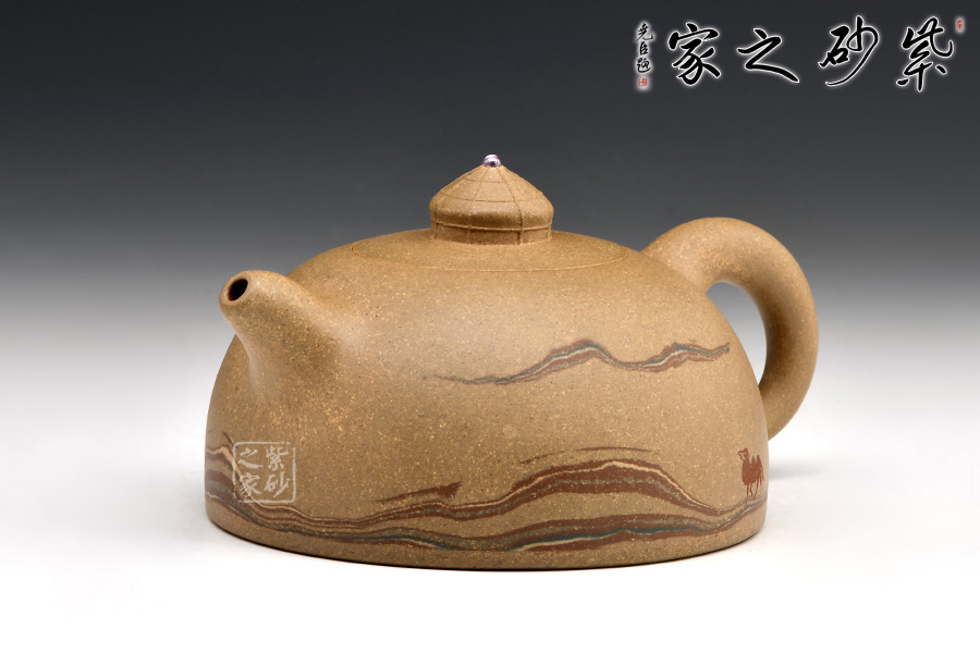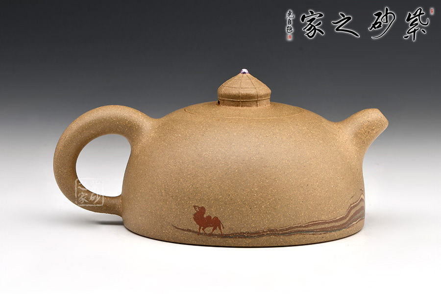 此壺整體造型大膽創(chuàng)新,獨具匠心。一彎流與圈把兩相呼應,最具特色的是壺鈕與壺身的絞泥工藝,完美呈現(xiàn)了一幅沙漠駱駝的景象,令人仿若置身其中!