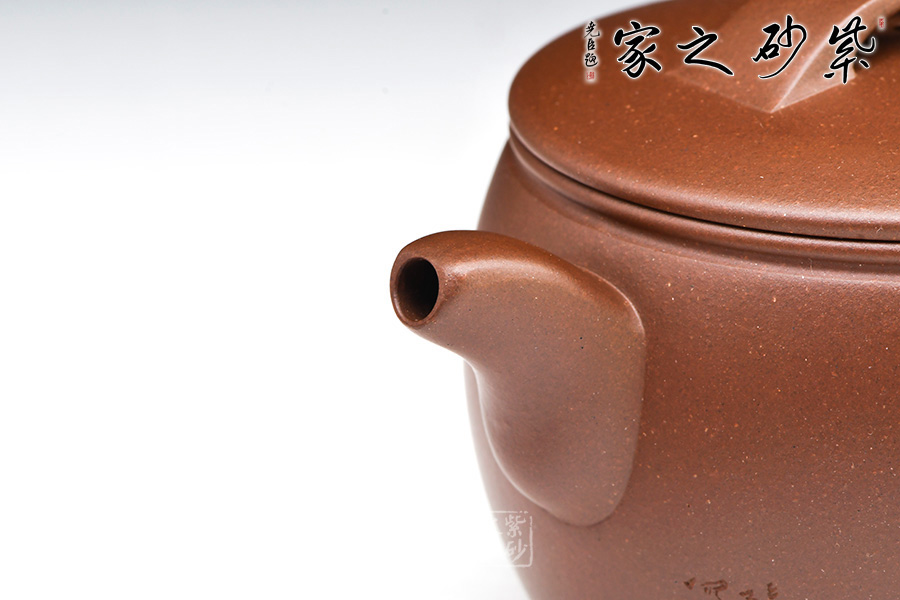 此款作品以簡(jiǎn)潔的線條構(gòu)成淳樸凝重的形體,深厚且具神韻,設(shè)計(jì)上空間明快,虛實(shí)和諧,提諧舒適,有端莊古樸之意境。 這款壺器型端莊、敦實(shí),壺身為短柱形,渾厚有余,大口蓋壓口,平整有力,弧形鈕呈片狀散開搭接在壺蓋上,彎流嘴長短適中,耳形壺把圓中略見扁。