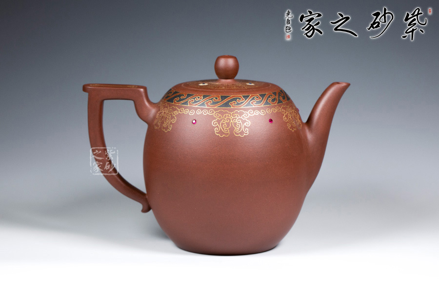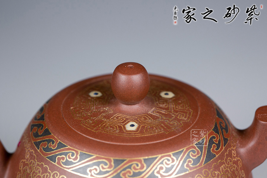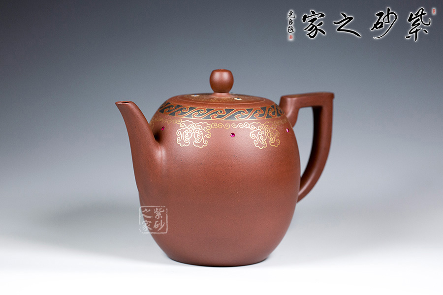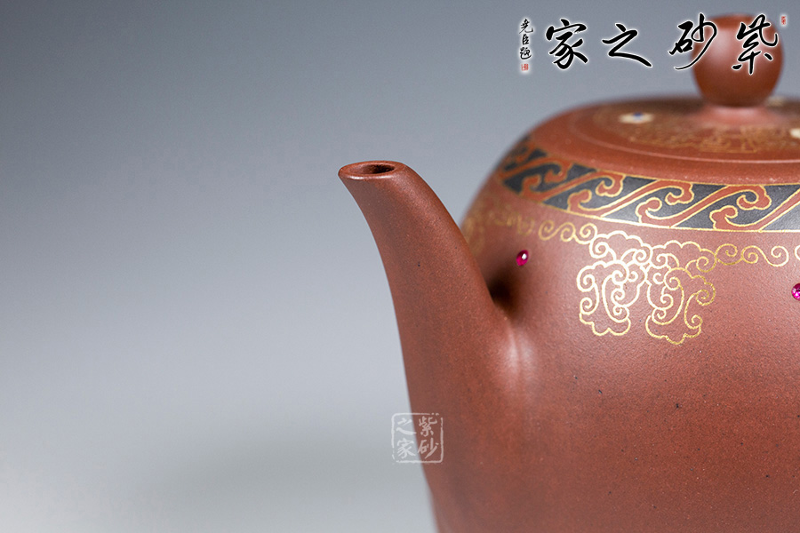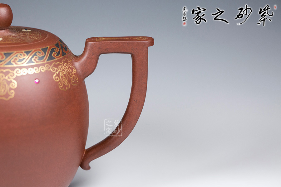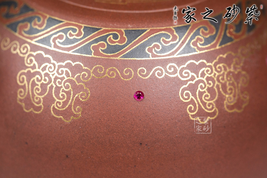 以鑲金工藝,做祥云朵朵作為裝飾,壺蓋上置八卦回紋,既增添瑞氣,又增添美感!