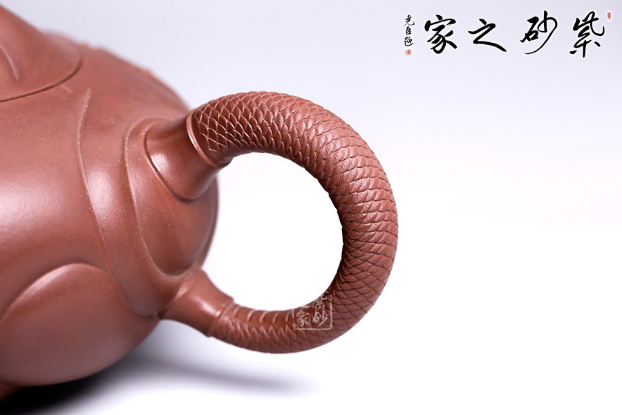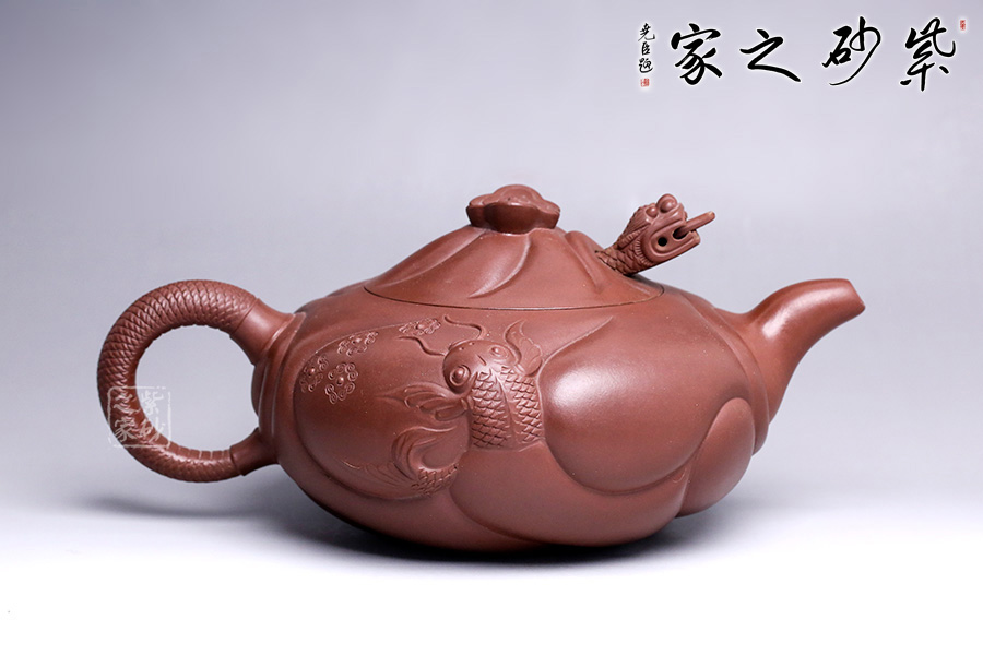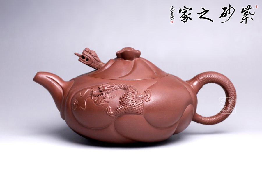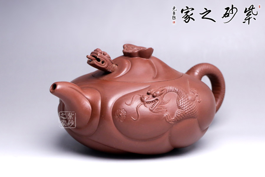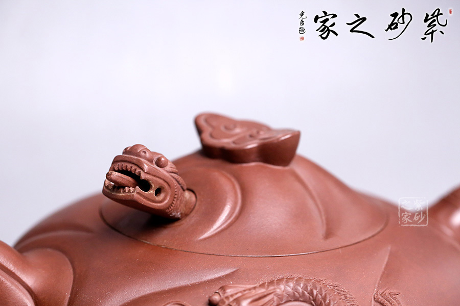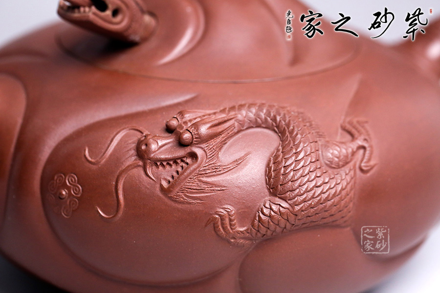 魚化龍壺,傳統名器,寓意金榜題名、吉慶高升、飛黃騰達,充滿吉祥富貴。 該壺設計新穎,魚、龍的裝飾與壺身渾然一體。通身作海水波浪狀,線條流利,簡潔明快。壺鈕為花式鈕,小巧精美。壺蓋別出心裁,龍頭從壺蓋探出,威武霸氣,與壺把相映成趣。壺嘴出水爽利,酣暢伶俐。整器別具神態(tài),氣度非凡,值得收藏!