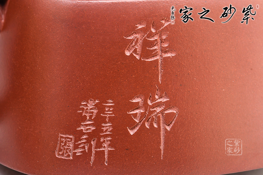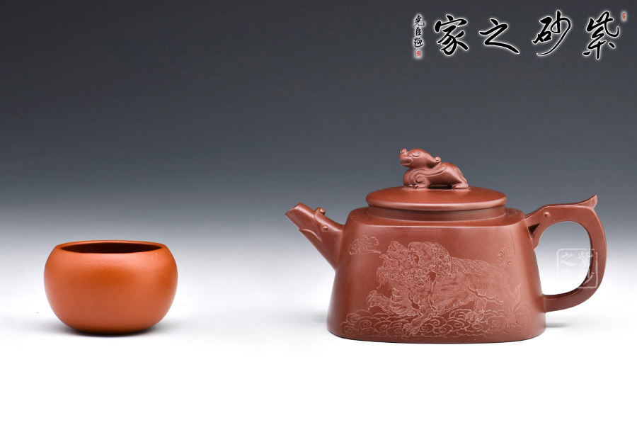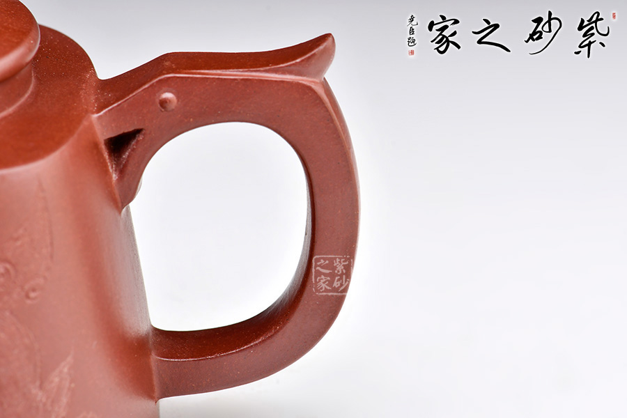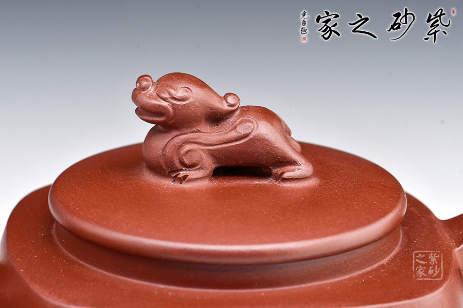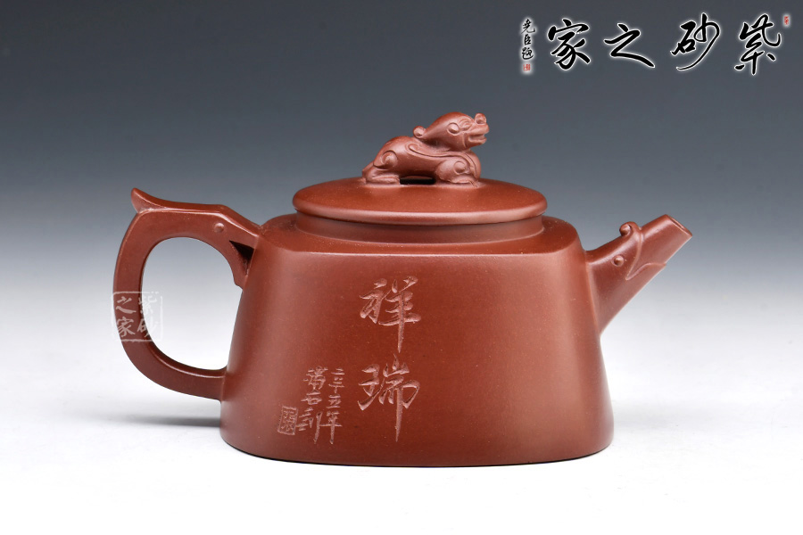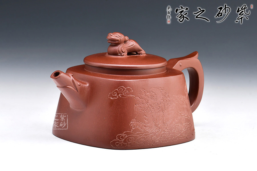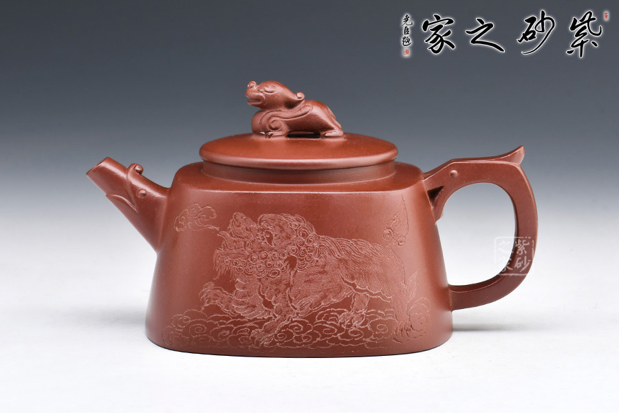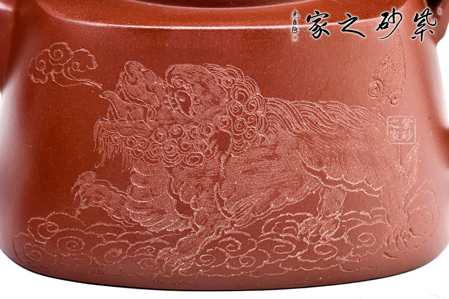 長直嘴,耳型把,皆加入麒麟的元素,麒麟自古以來都是祥瑞的代表。壺身雙面刻繪,正面一只麒麟騰云駕霧,反面刻繪“祥瑞”二字,前后相呼應。肩部寬闊,平蓋設計。瑞獸麒麟擬作壺紐盤踞壺蓋上,栩栩形態(tài)躍然眼前,帶有濃郁的民間祥瑞色彩,與壺身麒麟遙遙相望。 此壺作為典型的方器,契合方器“挺拔、剛勁、有力”的造型特色。此壺傳統(tǒng)與創(chuàng)新相結合,盡顯渾厚的氣度。