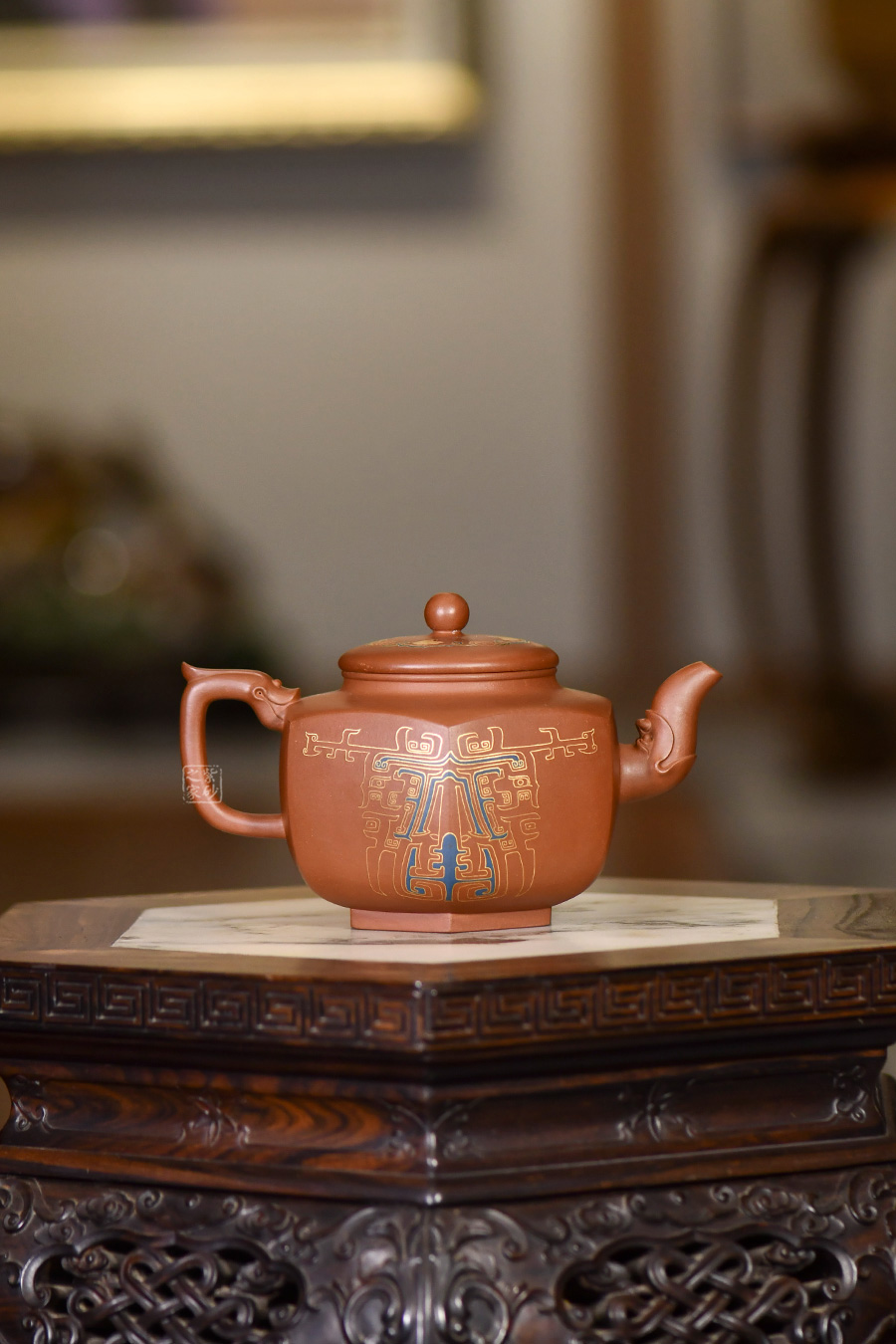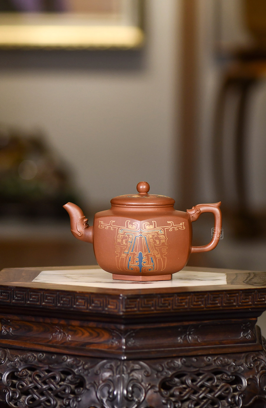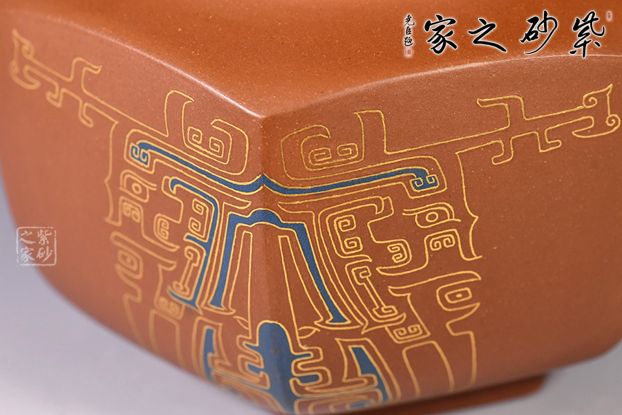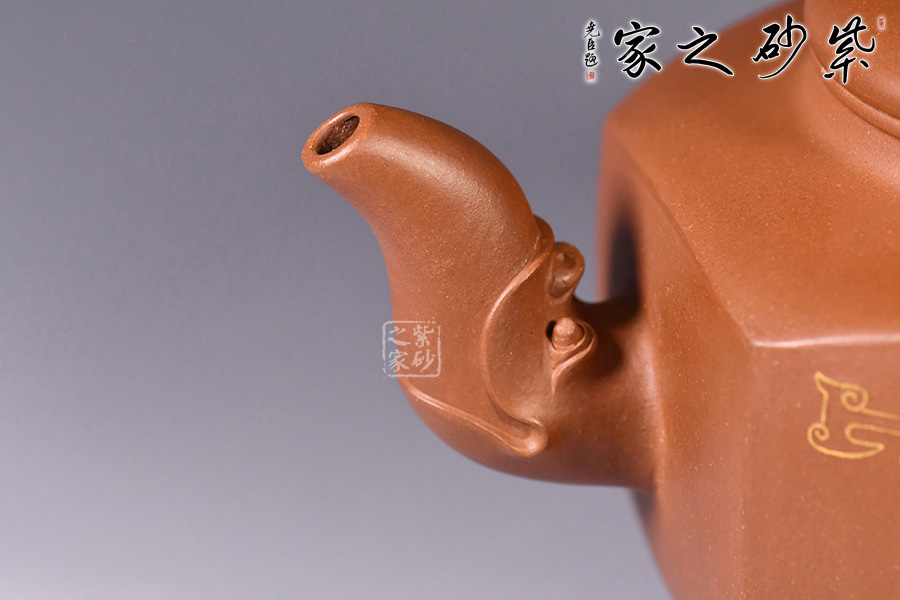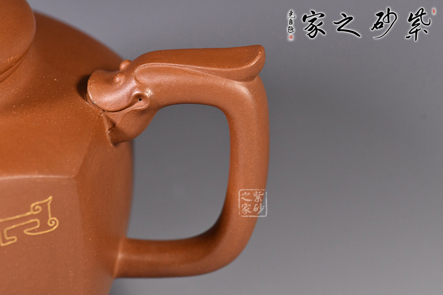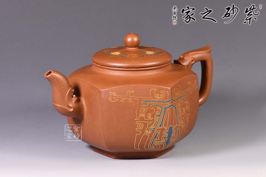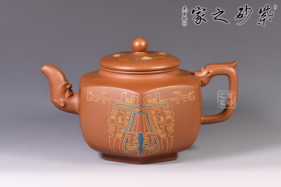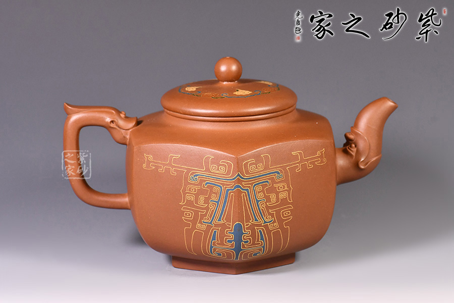 此壺的整體造型非常華美大氣,壺嘴與壺把皆為龍形,霸氣十足,壺身方圓結(jié)合,像是蘊(yùn)藏著天地間的浩然正氣,古典龍紋樣,用金絲鑲嵌與五色土填充,不僅提升紫砂壺的雍容華貴之感,更讓其作品物超所值,珠光寶氣。