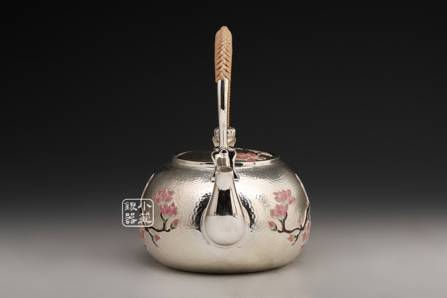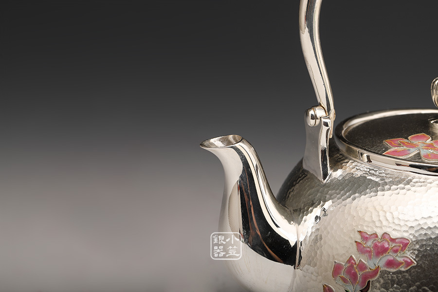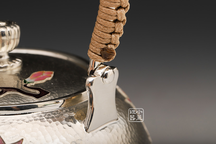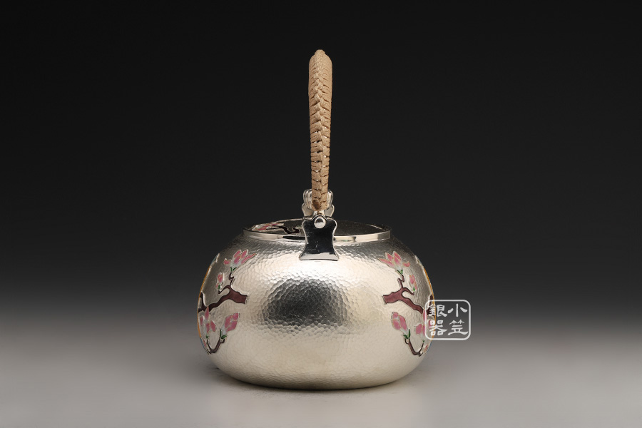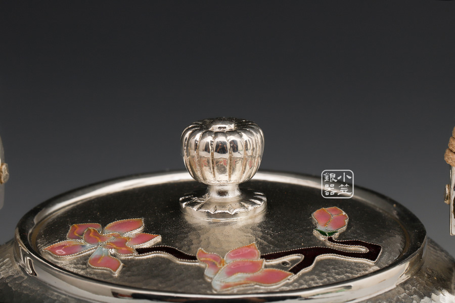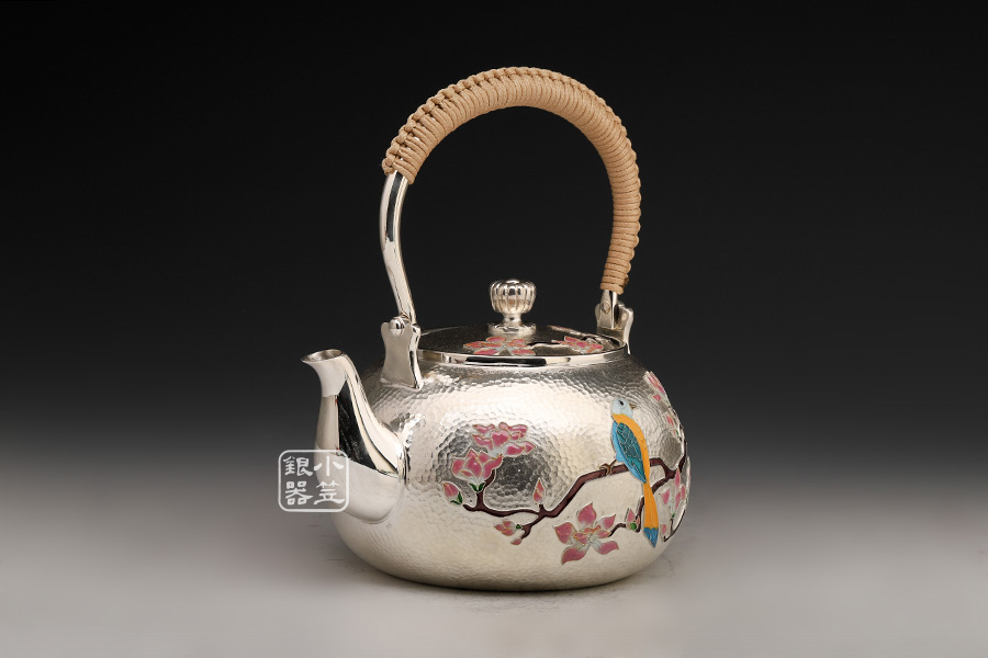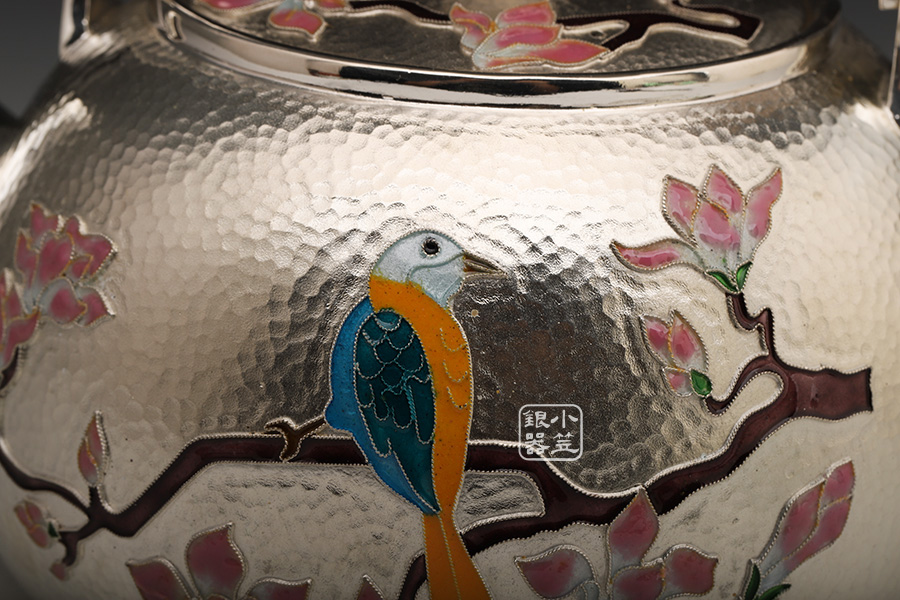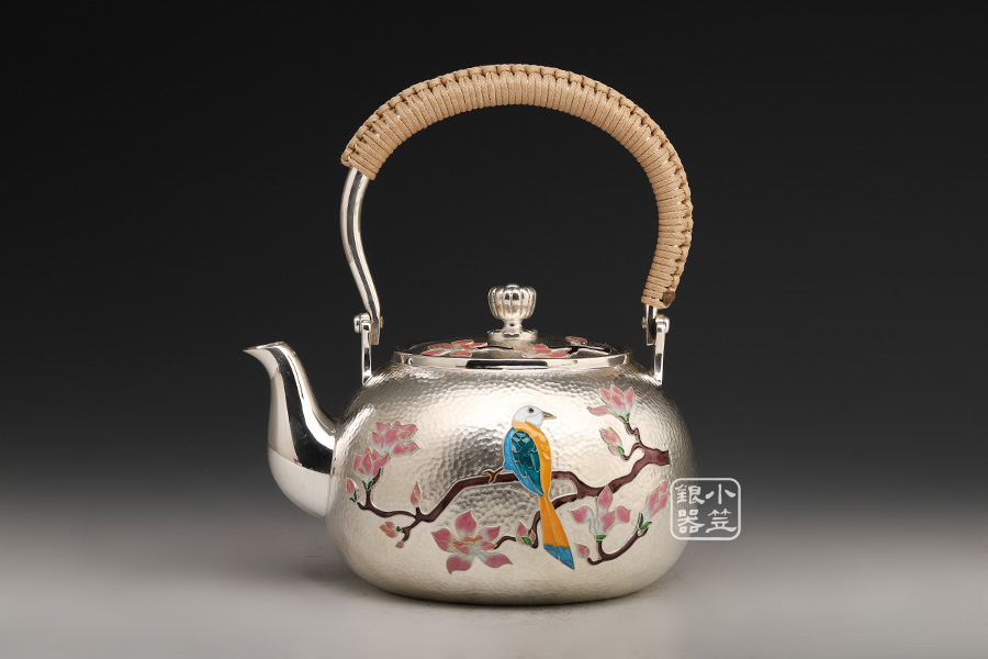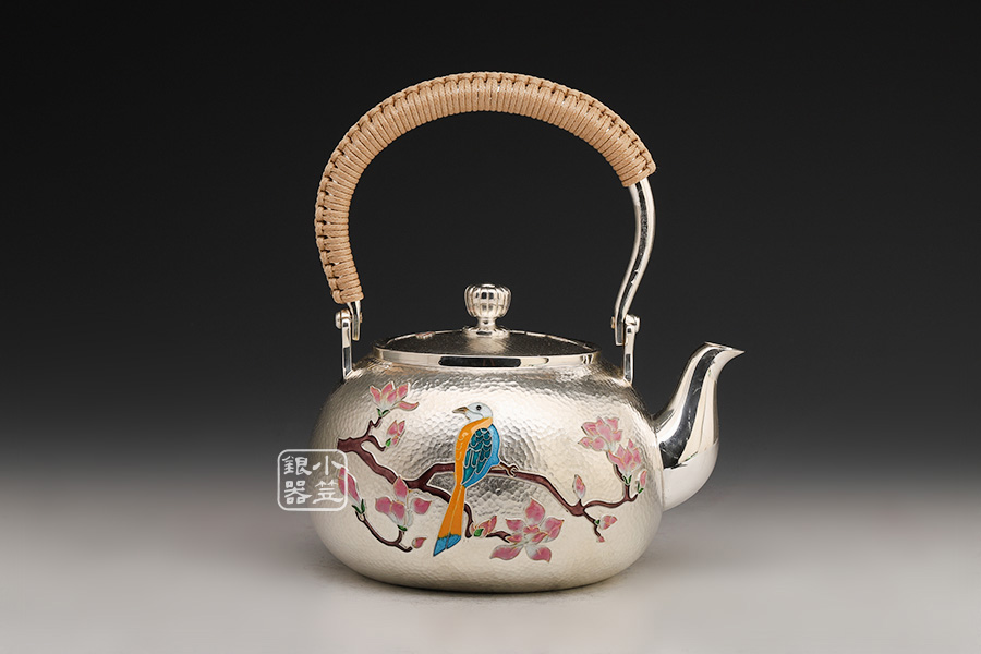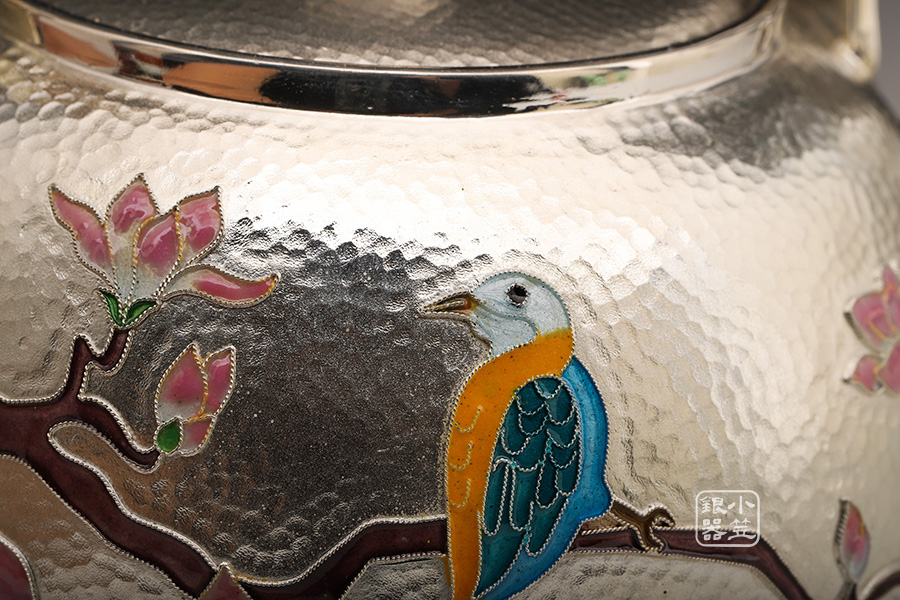 銀本色打底,壺身鏨刻浮雕出桃花喜鵲圖案,景泰藍(lán)更添韻味;