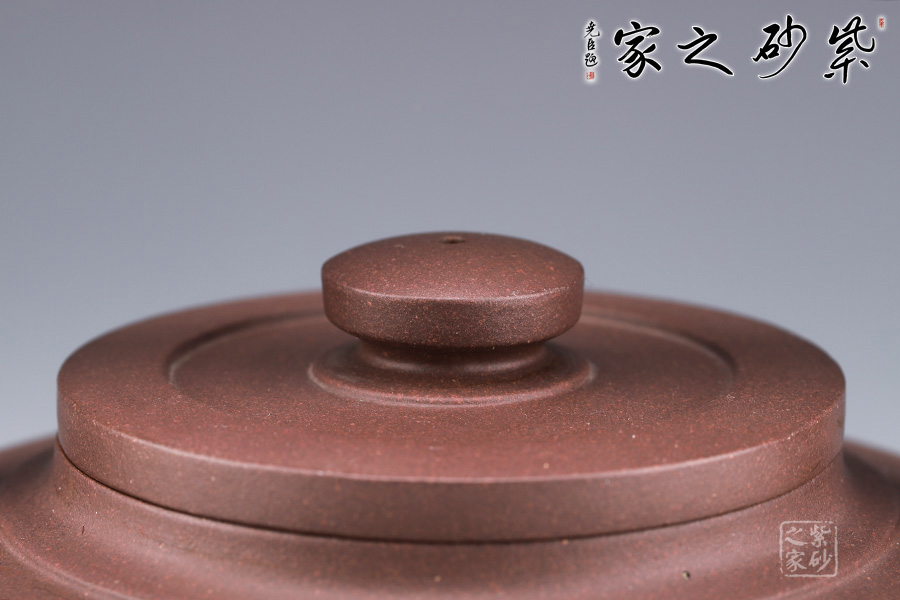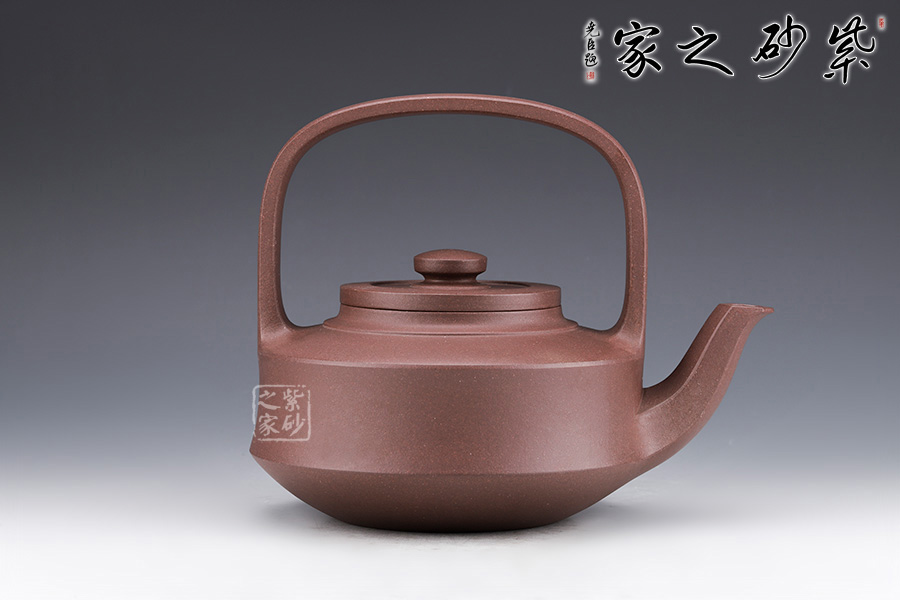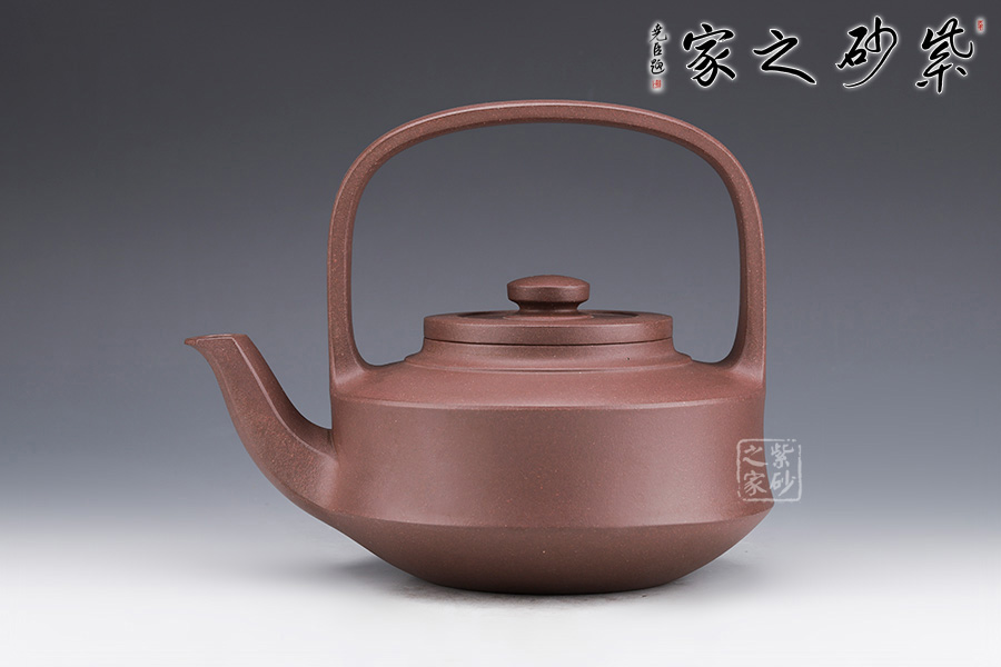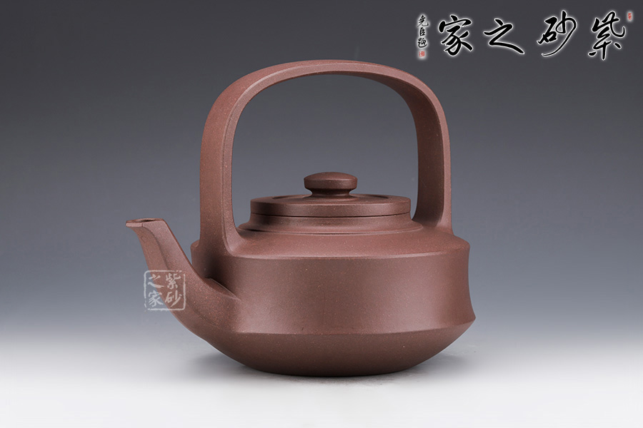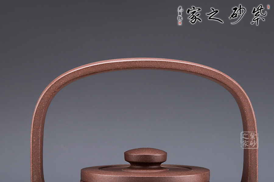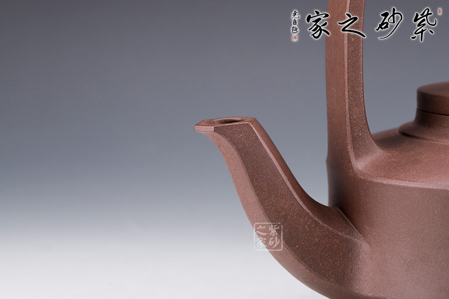 壺身作扁圓柱形,近底微外撇,折收成圓底,淺挖足。壺蓋、壺身、壺嘴棱角分明;壺嘴加以巧妙的曲線,使得圓中有方,然而分明的棱角卻又掩飾不住層層蕩開的波紋,意味無窮。整壺比例和諧勻稱,虛實節(jié)奏協(xié)調(diào),平蓋扁圓鈕、扁提梁,壺嘴從壺腹下部伸出,柔中見剛,工藝精湛。
