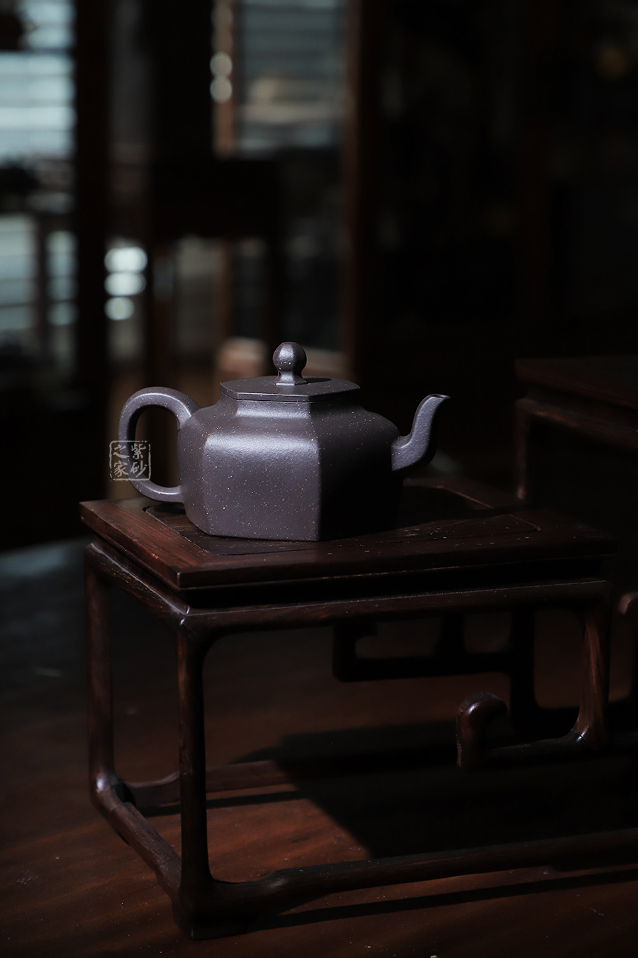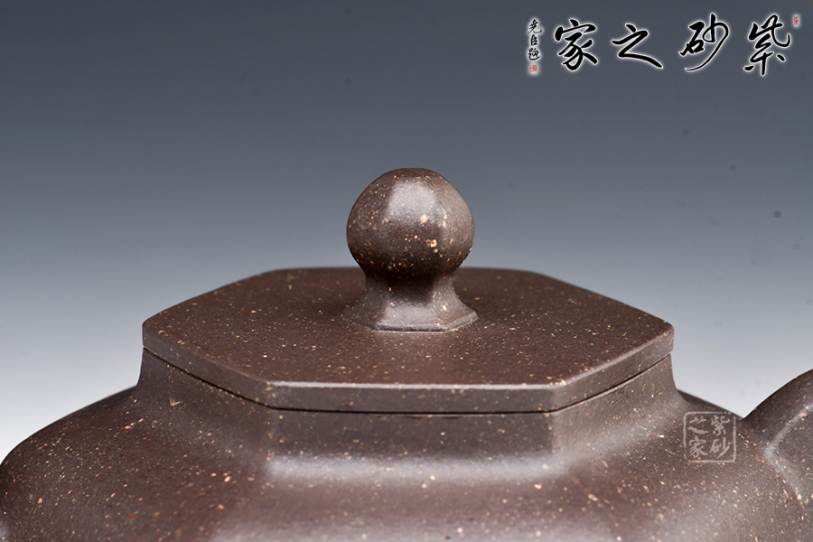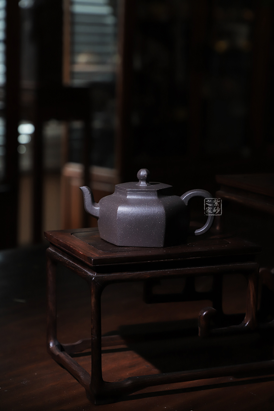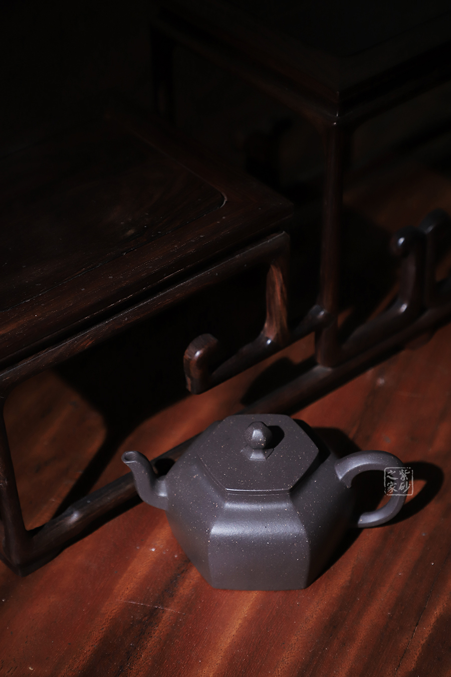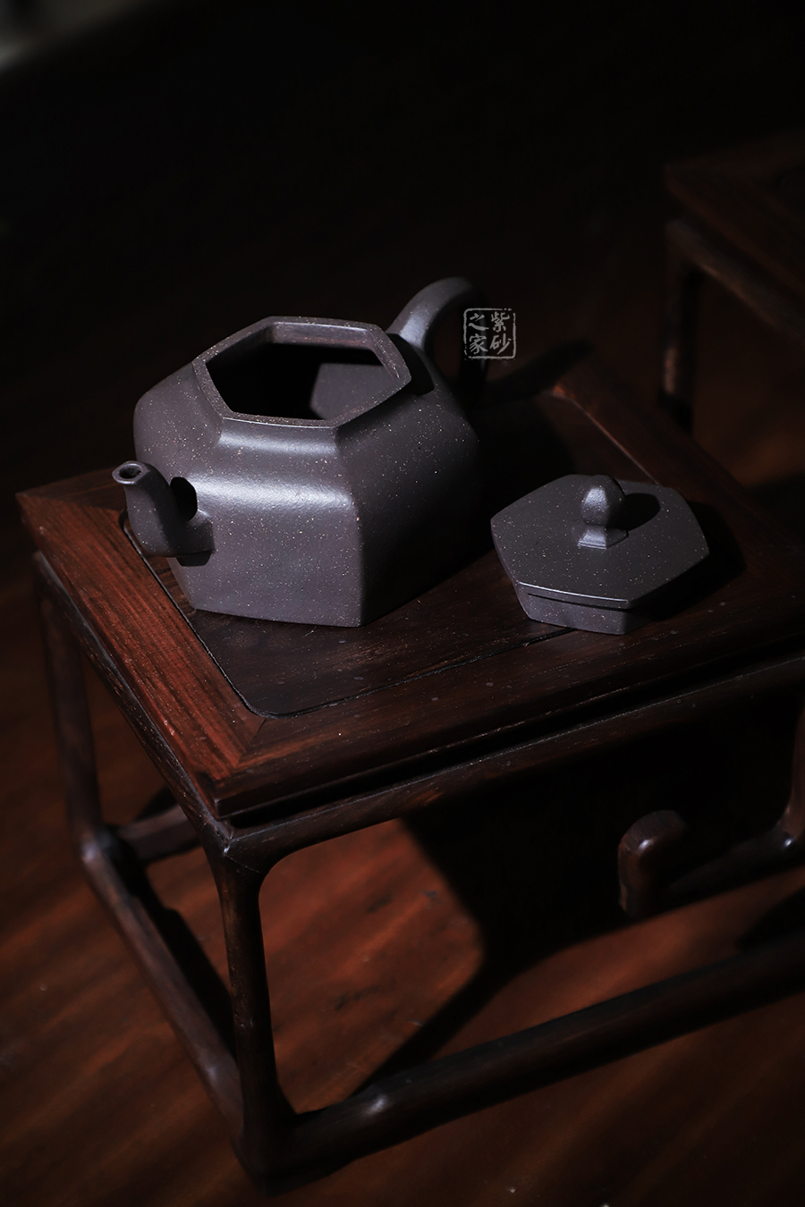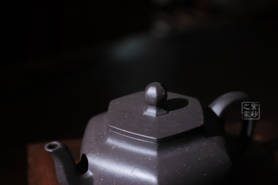 此壺為六方壺,由鈕、蓋、口、身以至圈足皆貫以六棱,線條明晰工整,轉(zhuǎn)折合度,飽滿圓潤,做到了“方中寓圓,方中求變,口蓋劃一,剛?cè)嵯喾Q”。具備鮮明的幾何元素,極具視覺沖擊力,給人明秀挺快,干凈利落的陽剛之美。此壺成形難度高,造型挺拔,做工嚴謹,且上手具佳。