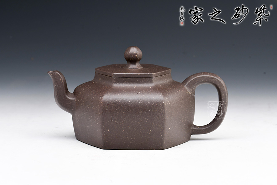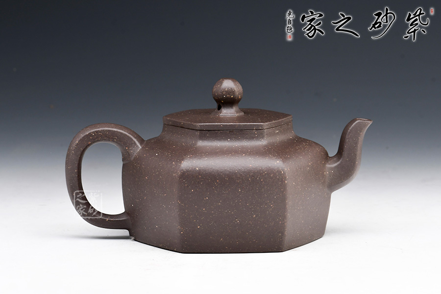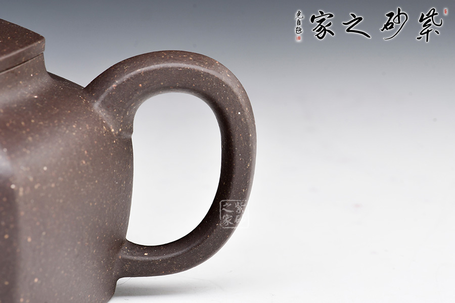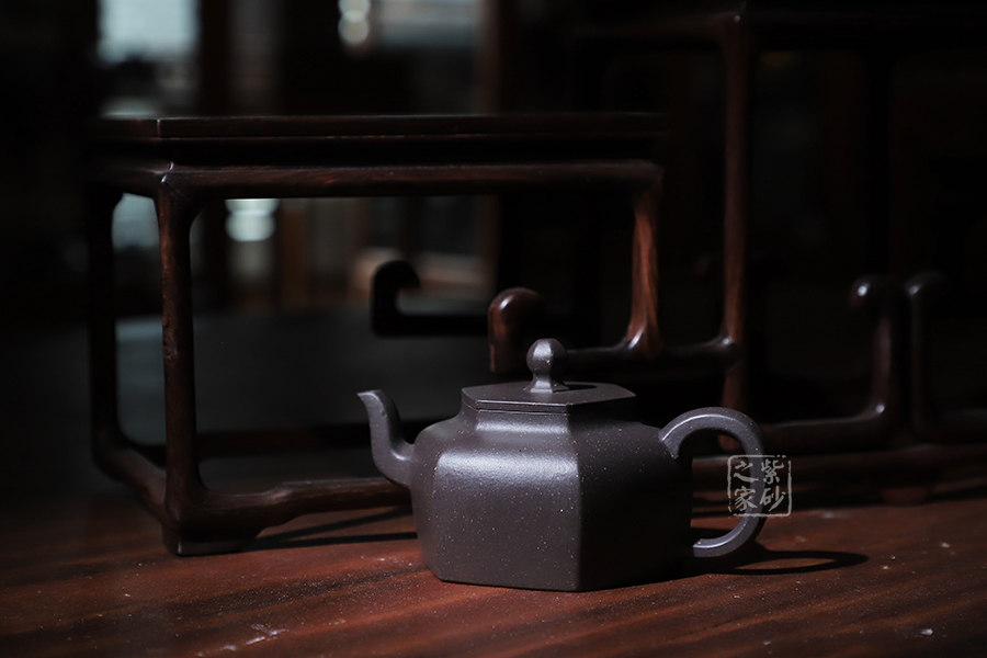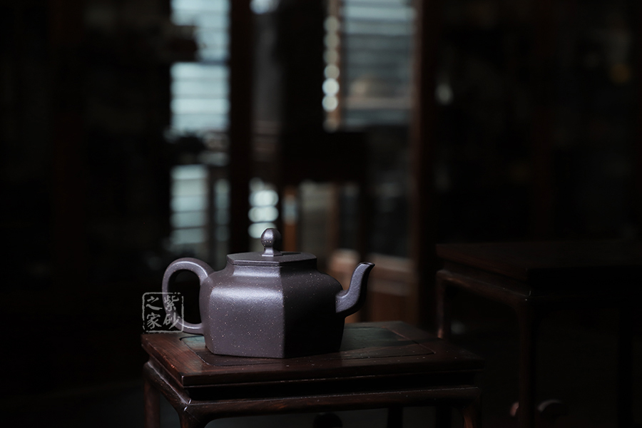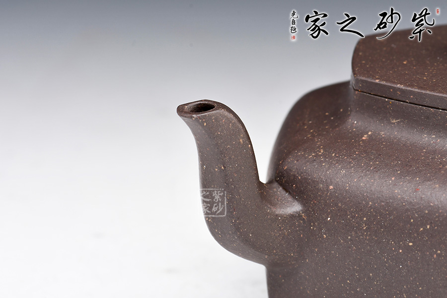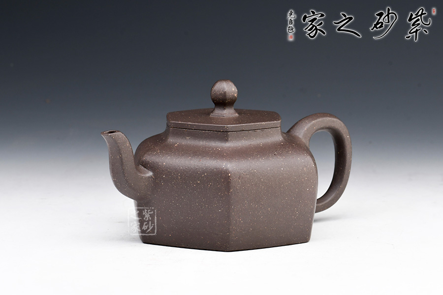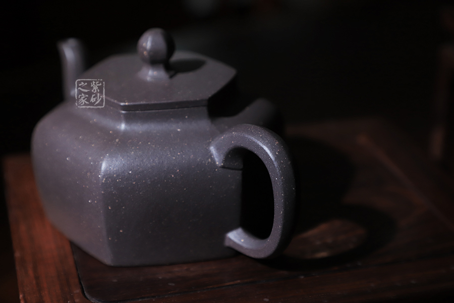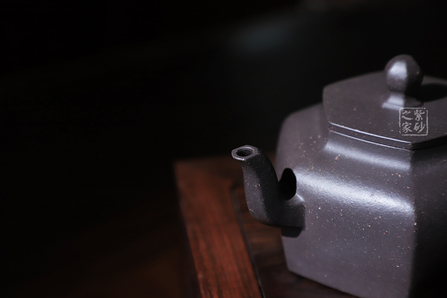 此壺為六方壺,由鈕、蓋、口、身以至圈足皆貫以六棱,線條明晰工整,轉(zhuǎn)折合度,飽滿圓潤,做到了“方中寓圓,方中求變,口蓋劃一,剛?cè)嵯喾Q”。具備鮮明的幾何元素,極具視覺沖擊力,給人明秀挺快,干凈利落的陽剛之美。此壺成形難度高,造型挺拔,做工嚴謹,且上手具佳。