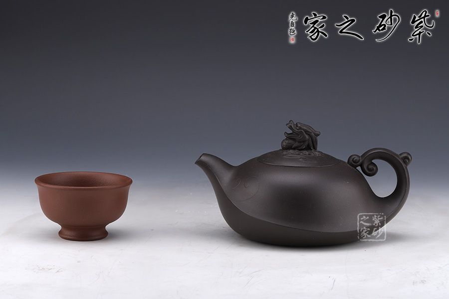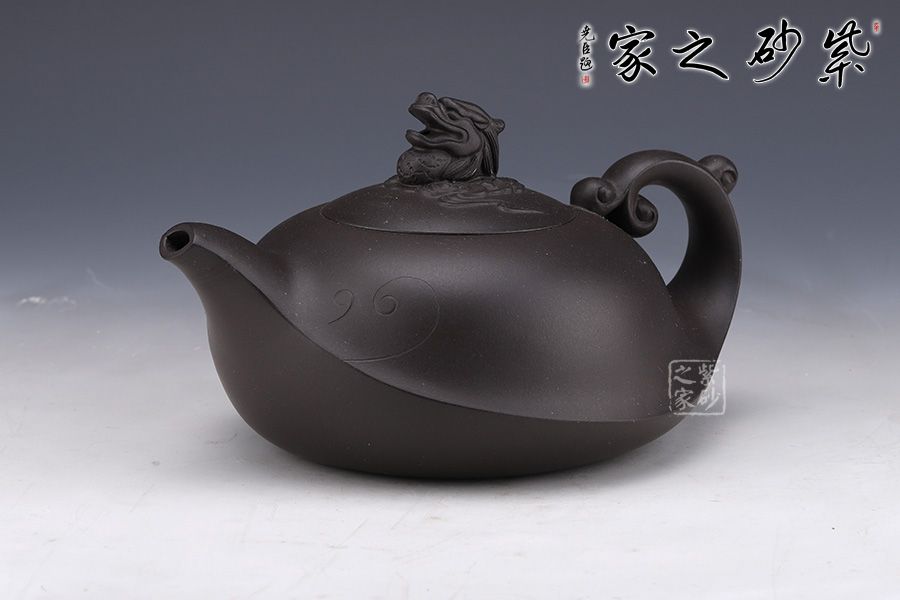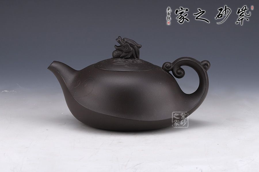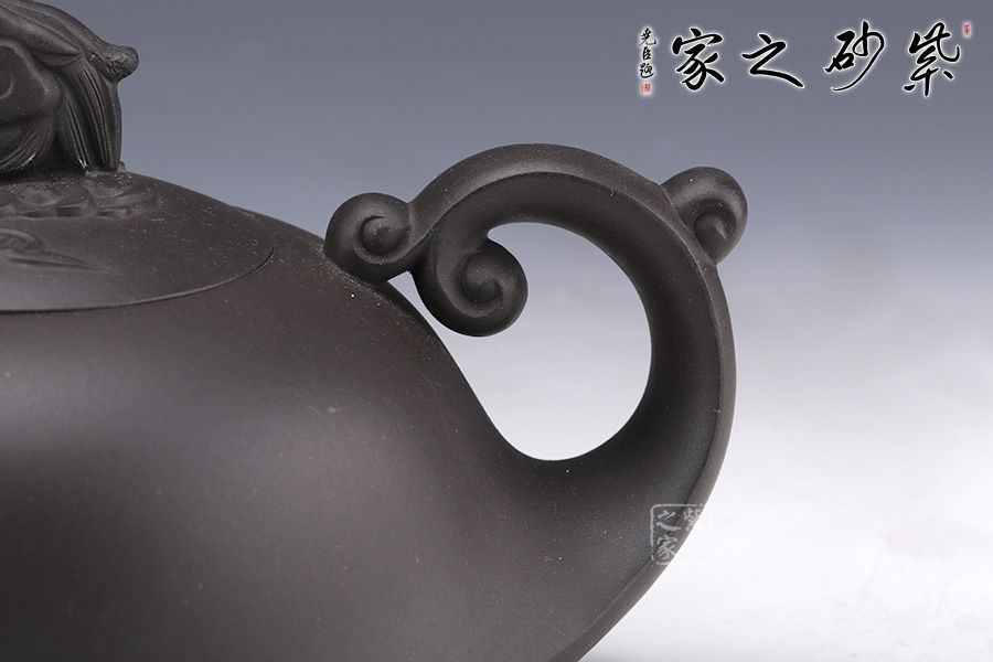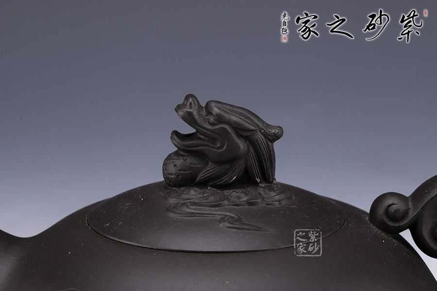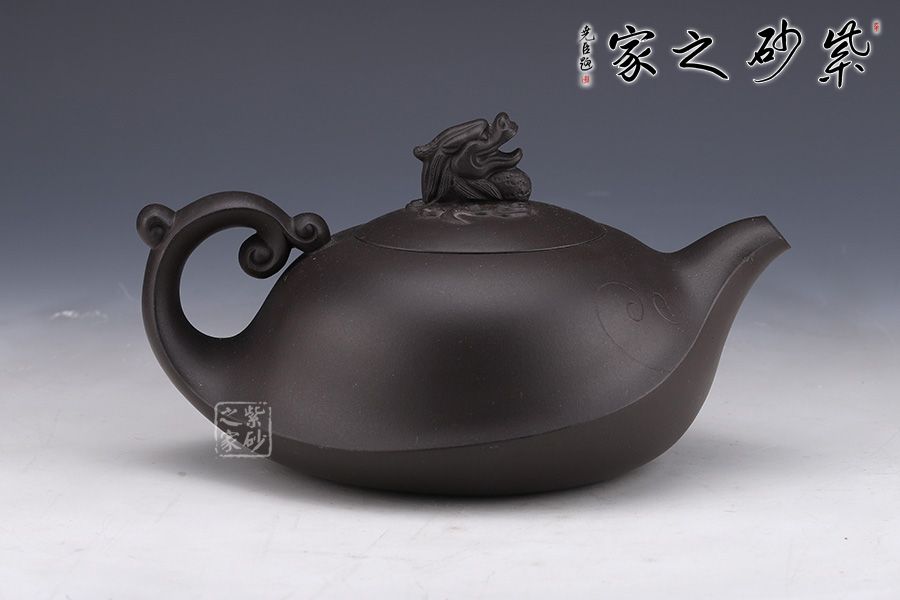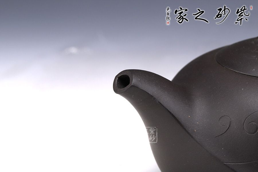 此壺泥料極佳,棱線極為圓融,契合四海升平之意。嵌蓋按于壺口之中,吻合嚴密,蓋面微鼓。壺鈕呈龍造型,氣勢雄壯威嚴,壺把呈云造型,故象被賦予了更多吉祥的寓意,吉祥如意、出將入相,是人興丁旺,招財納福的好選擇。