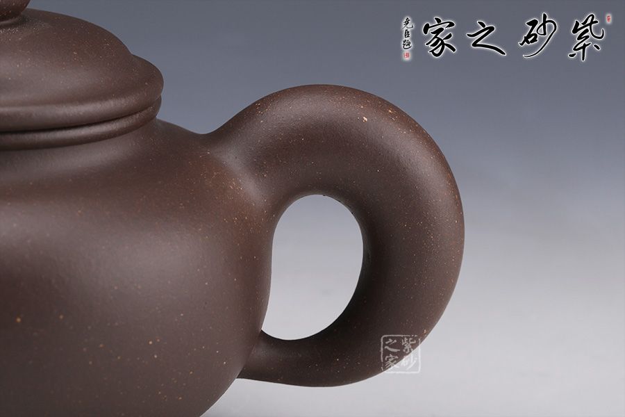此壺為傳統(tǒng)經(jīng)典壺形,一身素氣,光滑可鑒,壺色渾厚沉穩(wěn),瑩潤(rùn)如玉。造型古樸端莊,氣度不凡,以簡(jiǎn)練形體來展示其美的內(nèi)蘊(yùn),充分展示了作者精妙絕倫的制壺技藝,以及對(duì)器形精、氣、神的表達(dá)。壺身溫潤(rùn)豐滿,壺頸精神充沛,壓蓋圓珠鈕,壺流豐厚有力,壺把飄逸舒展,形成了一個(gè) 『耳朵』形曲線的優(yōu)美空間,各部比例協(xié)調(diào),古樸敦厚,秀美醇和。