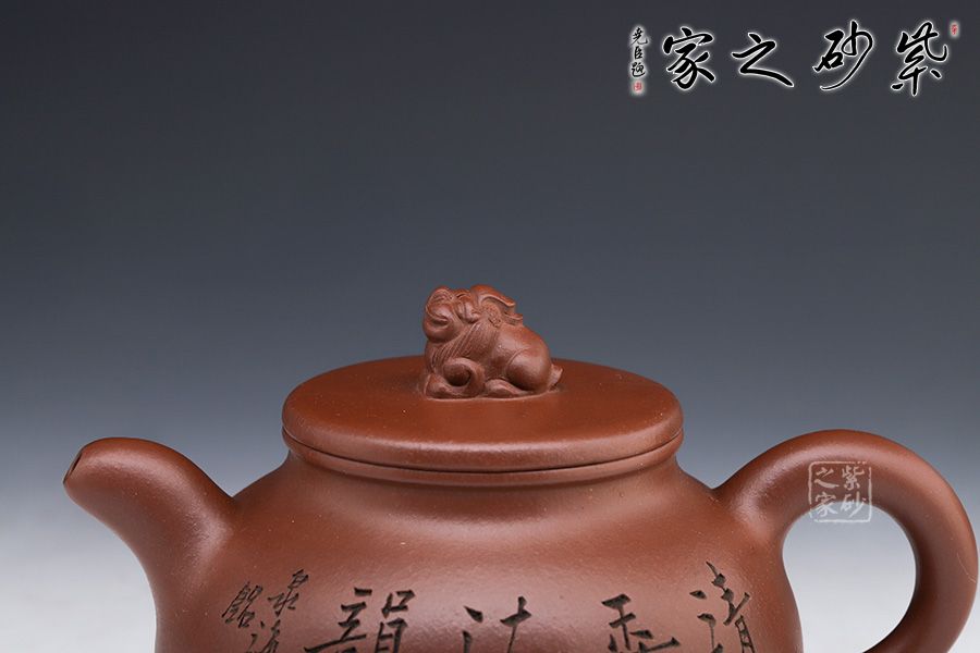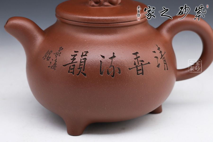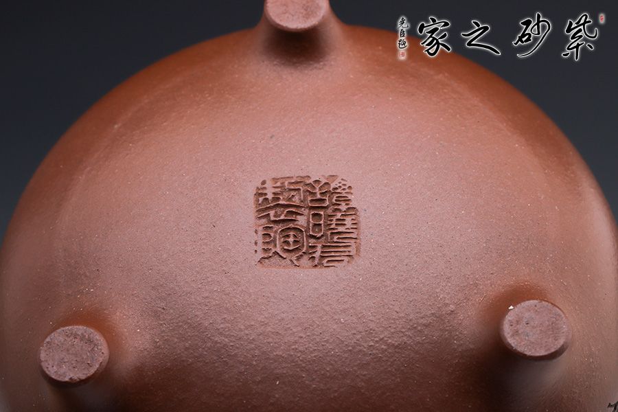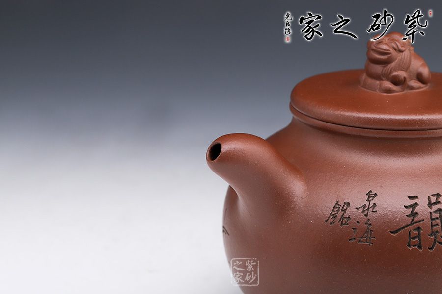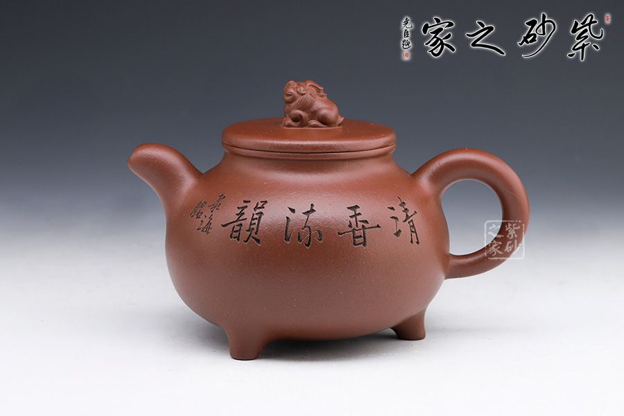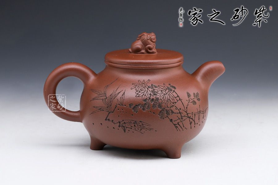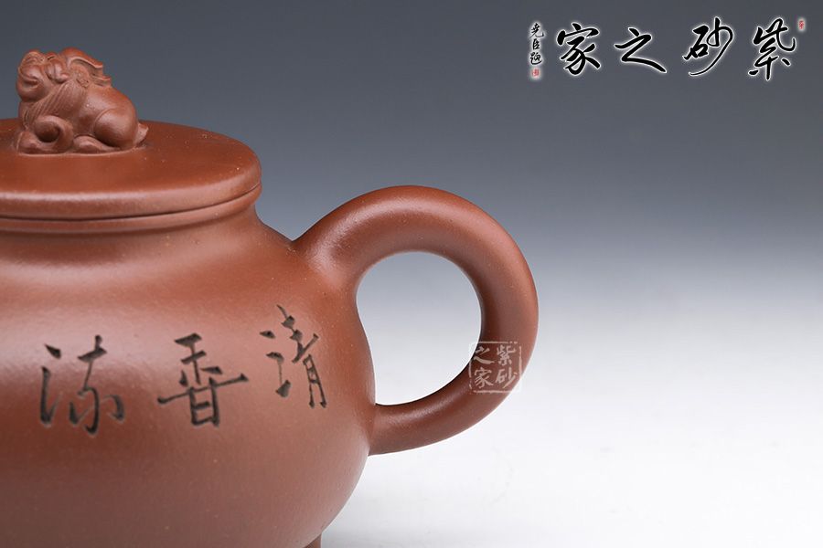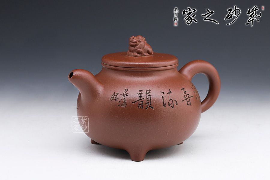 此壺壺型如古鼎,三足穩(wěn)重大氣,圓形外觀美妙細膩。線條圓滑至壺蓋停止,子母線對接,蓋頂如鏡面一般光滑,獅子端坐其上,小巧可愛,栩栩如生。小嘴彎流配合翹起的環(huán)形把,讓此壺的正氣中有一份樸拙憨厚。