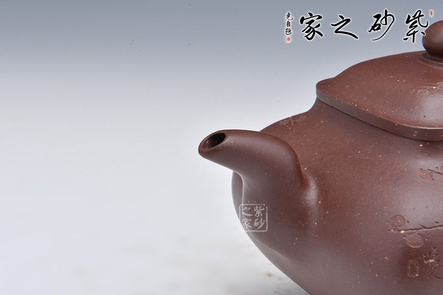傳爐壺是一個(gè)經(jīng)典壺型,因成型技藝難度高,極為考驗(yàn)制作者功底。整壺精選紫玉金砂制作而成,泥色古樸厚重。正面而看整壺造型仿若一香爐,壺身骨肉亭勻,上豐下斂,輪廓清晰,線條流暢。流、把自然胥出,挺勻有力。底作四釘足,穩(wěn)而秀巧。