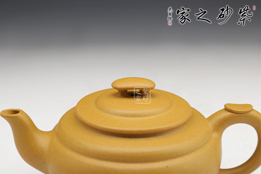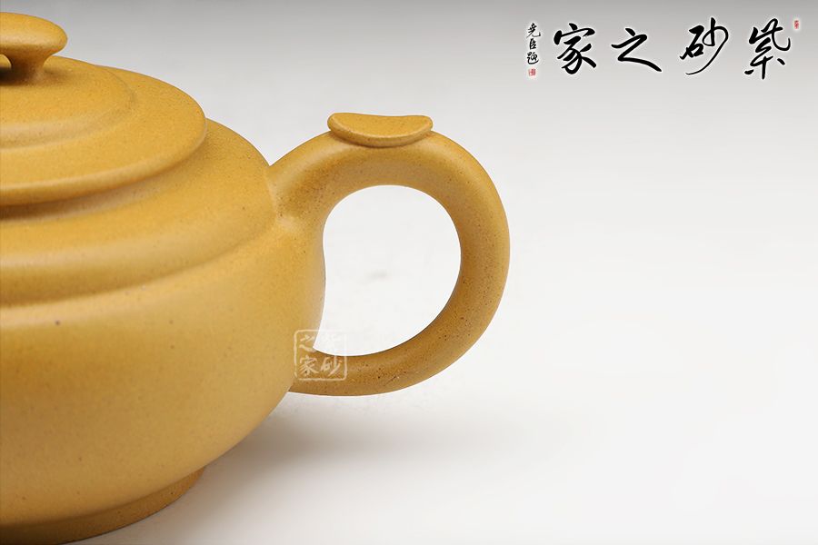 “上新橋壺”為六十年代顧景舟先生制作而成,為一代經(jīng)典之作。此壺壺身呈扁圓形,折肩圈足,曲流環(huán)狀柄,壓蓋式,橋型鈕;造型端莊、秀美、新穎脫俗,在柄的環(huán)狀之上稍加改動(dòng)即可安放拇指,又與壺蓋鈕相呼應(yīng),可謂匠心獨(dú)運(yùn)、設(shè)計(jì)巧妙;蓋與肩部均以凹線、階狀分割空間,自上而下視之,有一環(huán)扣一環(huán)水波蕩漾之感;壺蓋上的鈕正像一座小橋矗立于湖水之中,上新橋壺或由此而得名。
