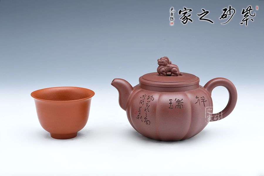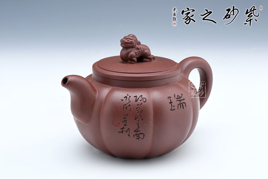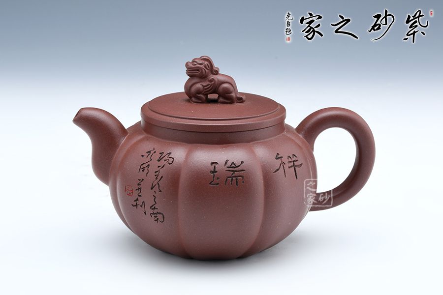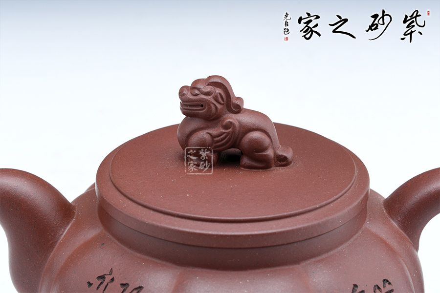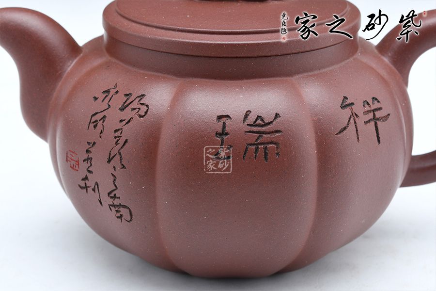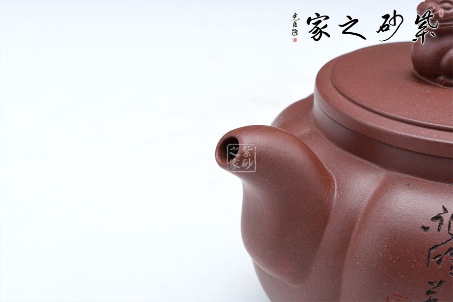 此壺壺身飽滿圓潤(rùn),壺身做成了筋紋器觀賞性十足,嘴蓋把在一條直線上做工精致。壺鈕是中國(guó)的瑞獸麒麟,驅(qū)邪避兇祥瑞之獸。壺身刻繪“祥瑞”二字,蒼勁有力,觀賞性十足,大口蓋實(shí)用。