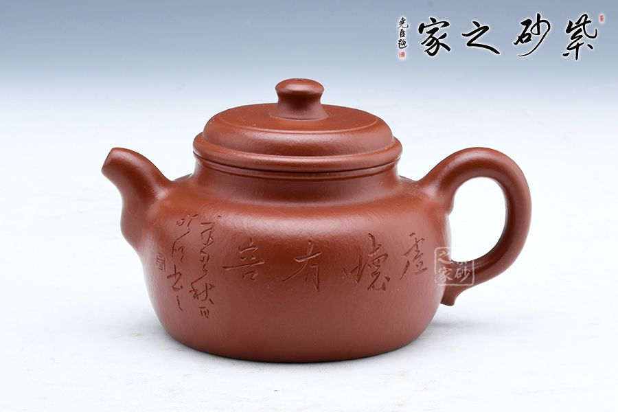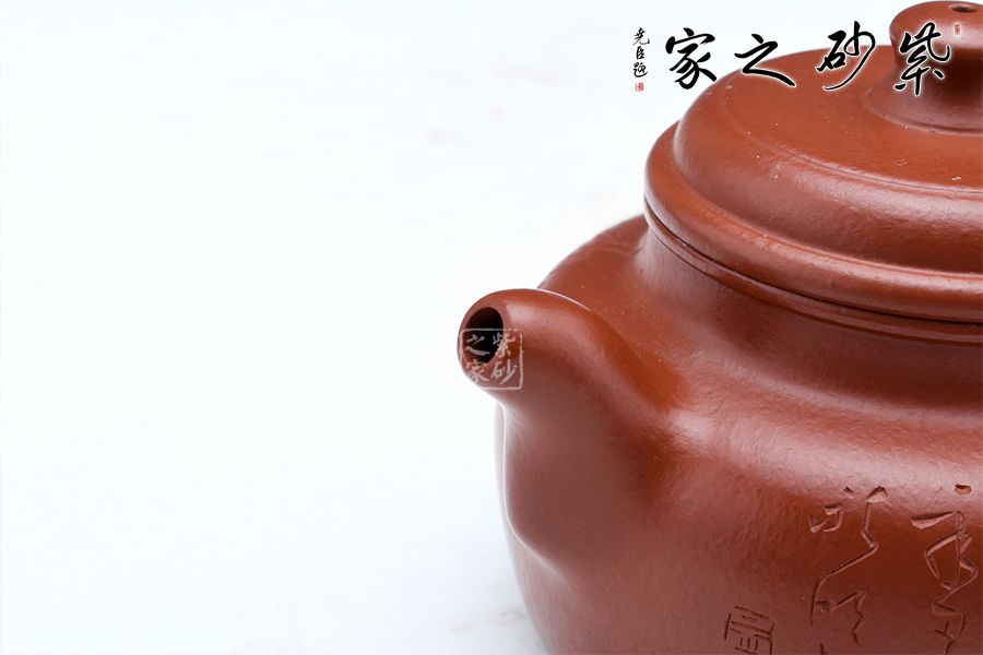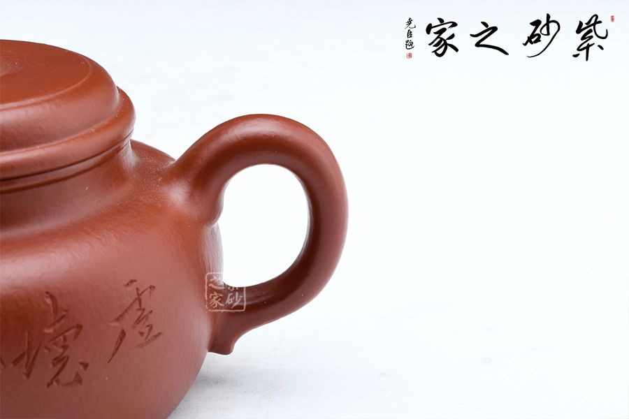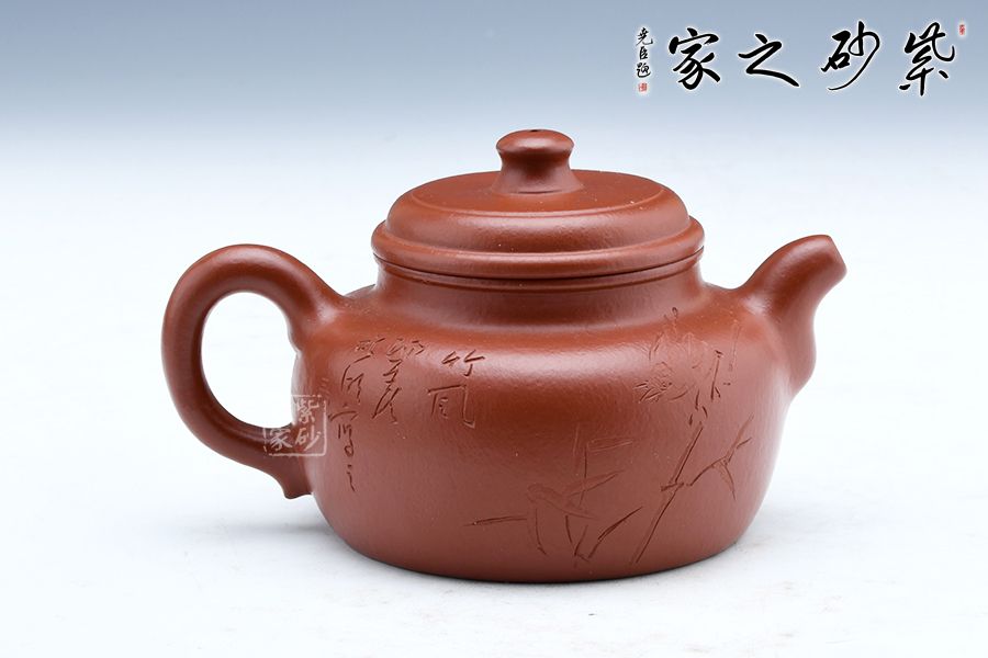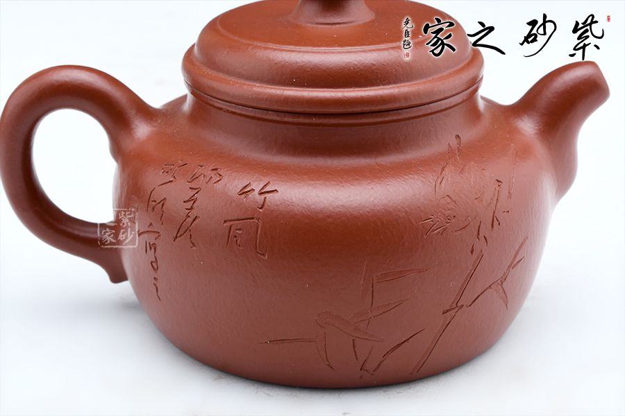 德鐘為經(jīng)典壺型,至今無法超越。短短的圓柱形壺鈕,與壺身一致。壺蓋微微鼓起來,并不覺得飽滿,但是弧形特別明顯。壺口子母線咬合得很緊致,壺友們不必?fù)?dān)心倒茶時(shí)茶水溢出;同時(shí)這款壺的壺口比較大,茶葉進(jìn)出也很方便。壺肩略微平整,壺頸修長,所以整個(gè)壺體并不覺得矮壯,而是集穩(wěn)重和精巧于一體。直流嘴挺出得很爽利,同時(shí)圈把闊大,略微見方形,使用起來很方便。壺身刻繪竹子,君子氣息十足。