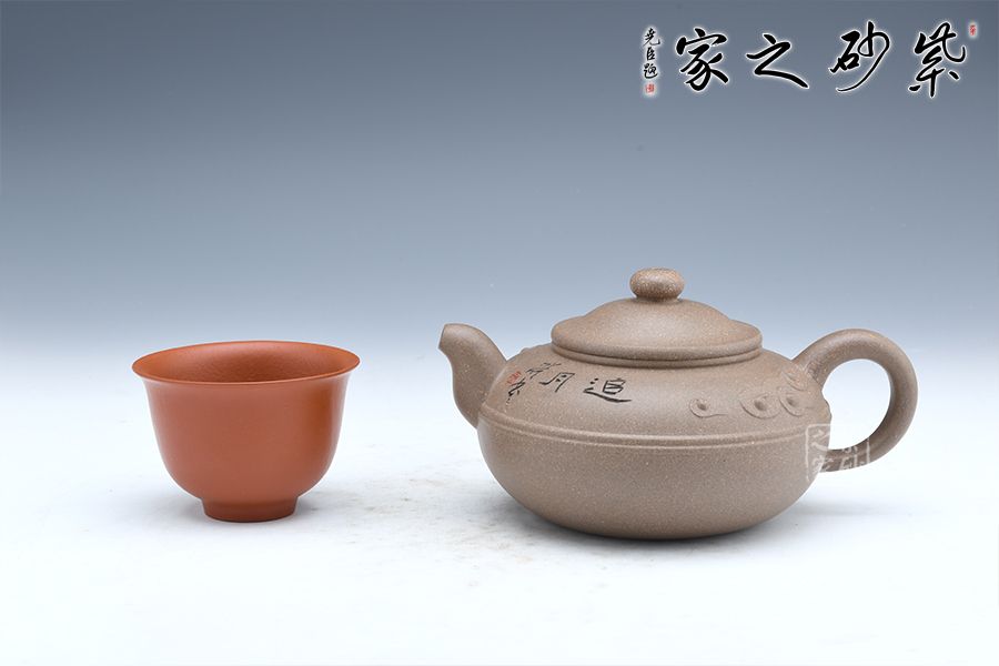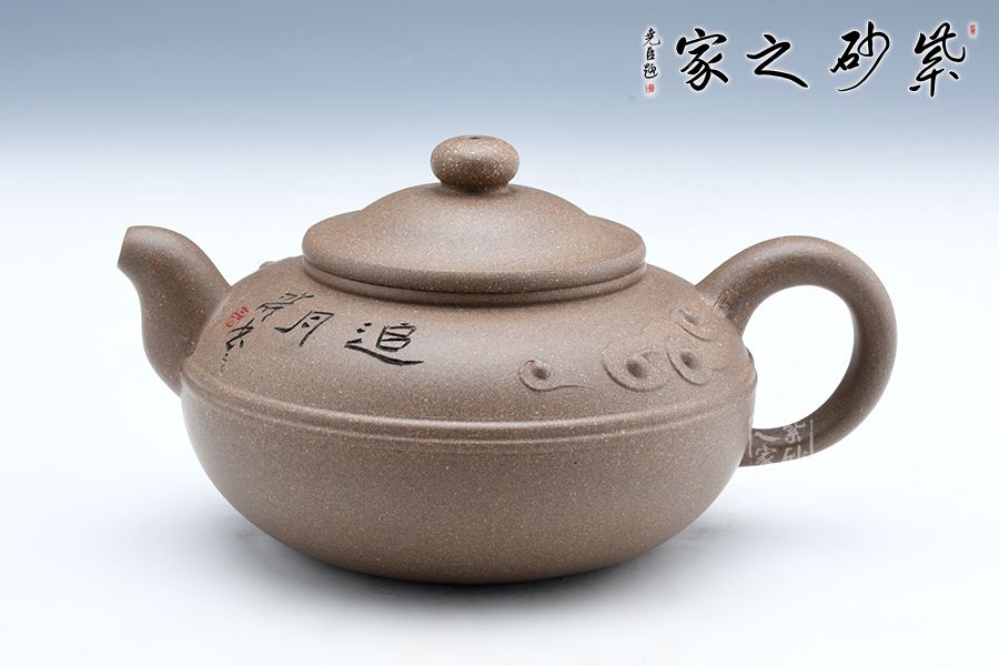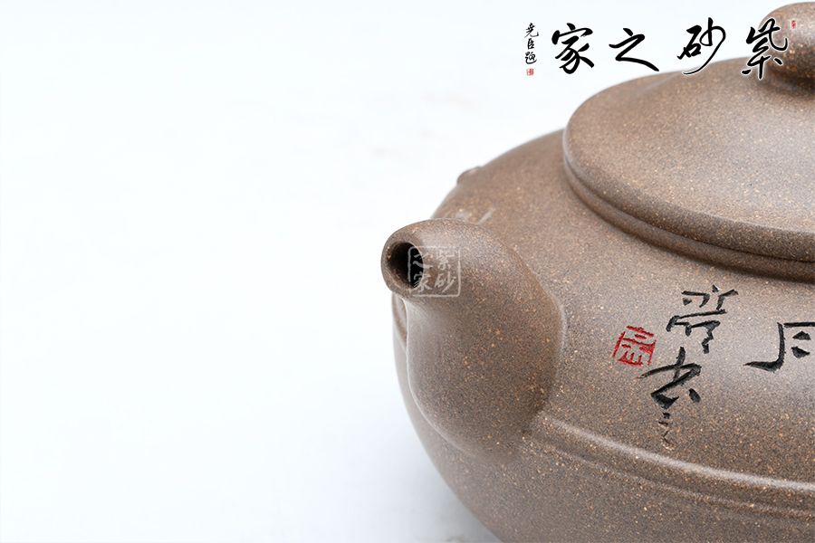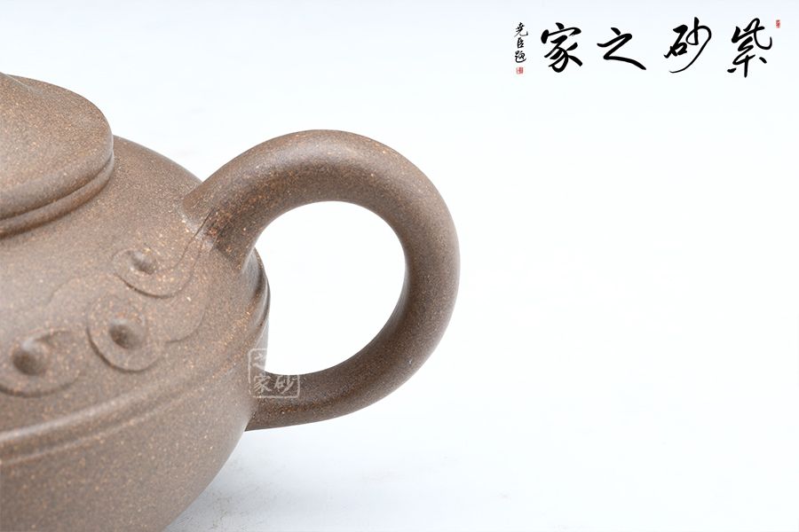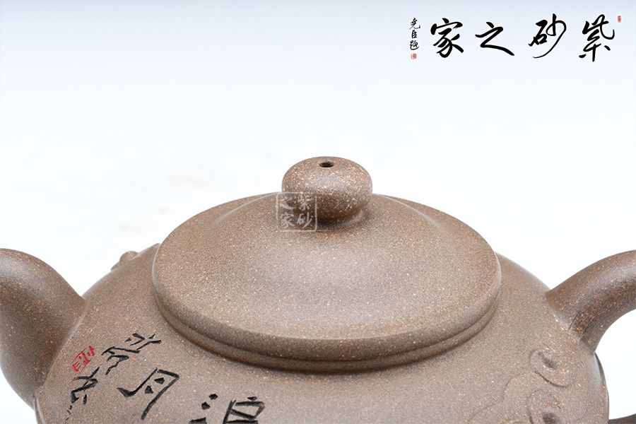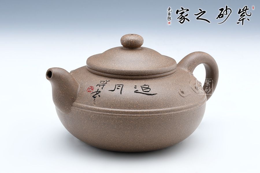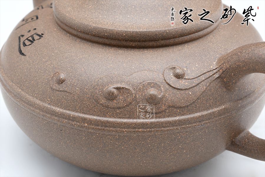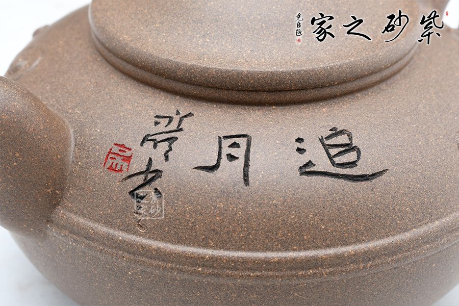 壺身扁而圓,嵌蓋緊密煥然天成,融和之姿,以弧度圈和的線條做到形制周正。壺把與壺嘴兩相呼應(yīng),拉伸空間之感。壺身及蓋面之上覆祥云之姿,別致有感,綿延不絕。壺身刻繪“追月”二字,觀賞性十足。