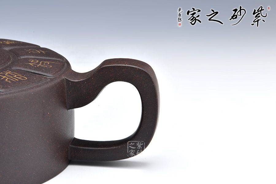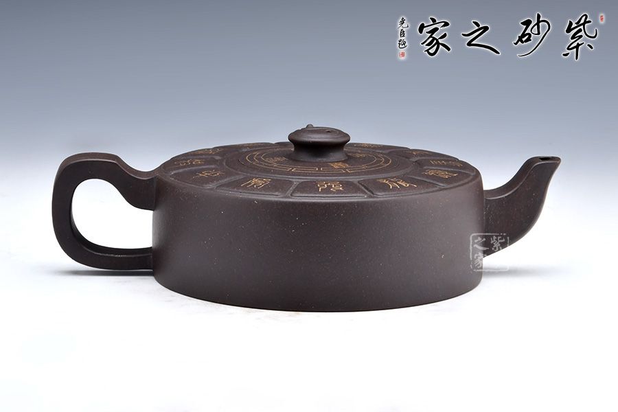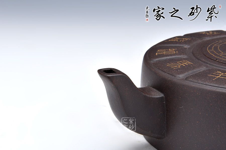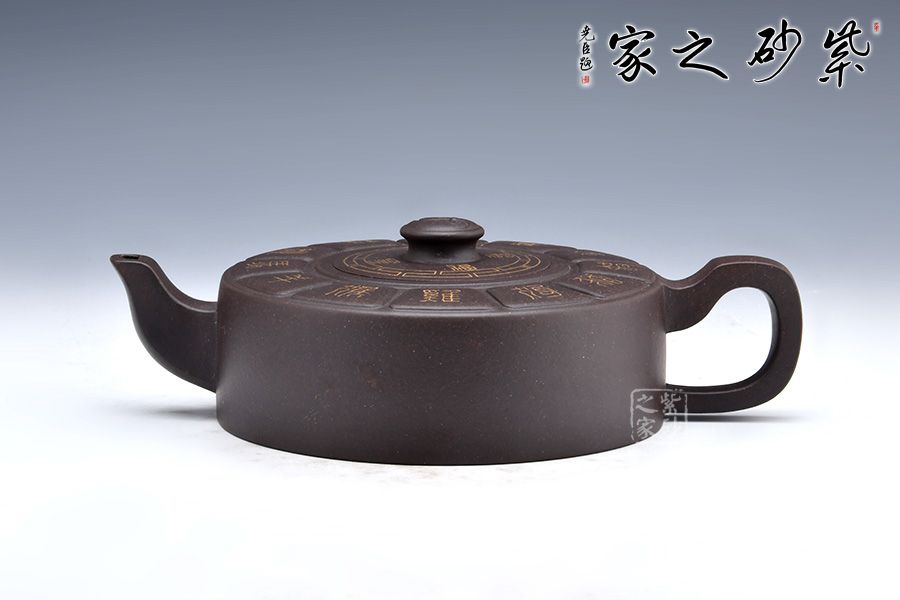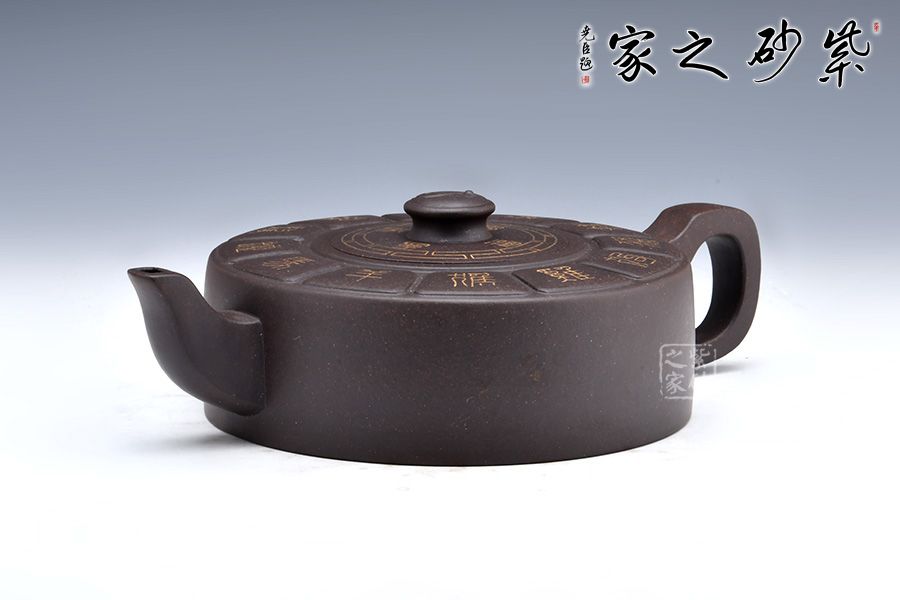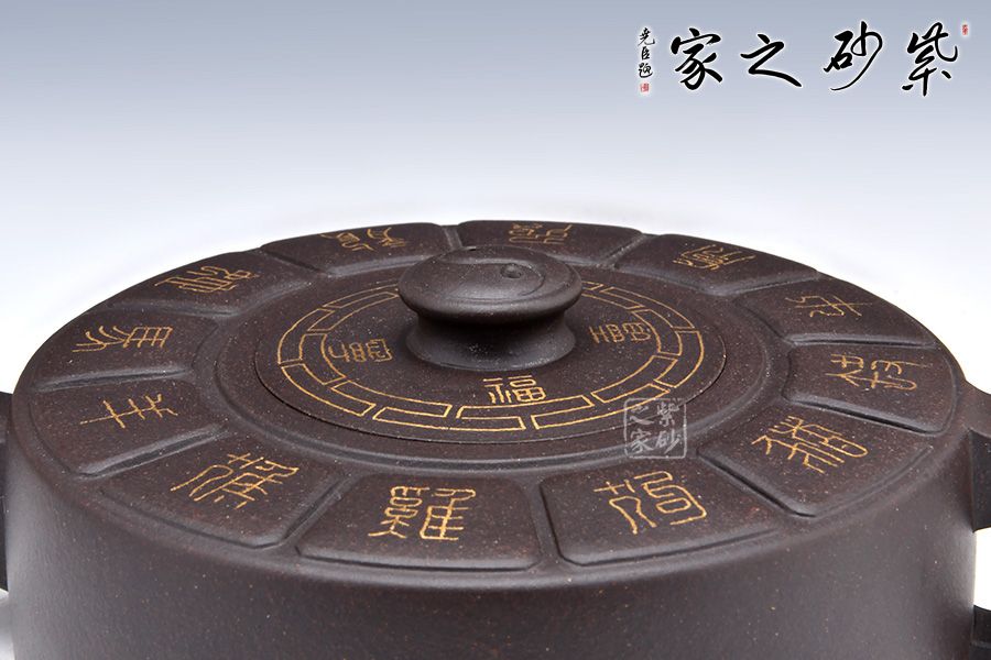 此壺制作審慎,工精藝謹,充滿古拙大氣。壺鈕為八卦,壺肩金絲鑲嵌“鼠牛虎兔龍蛇馬羊猴雞狗豬”十二個字,真叫一個美哉!