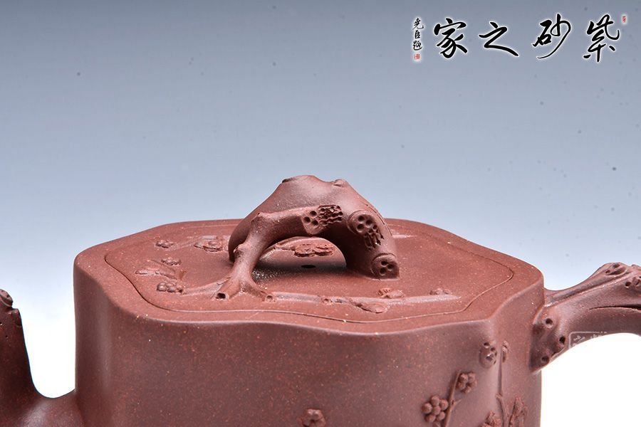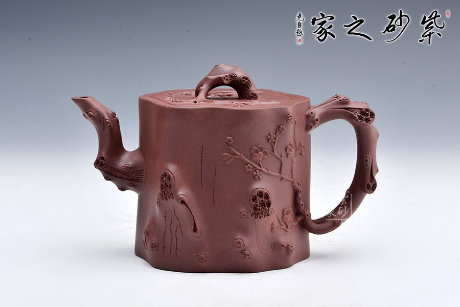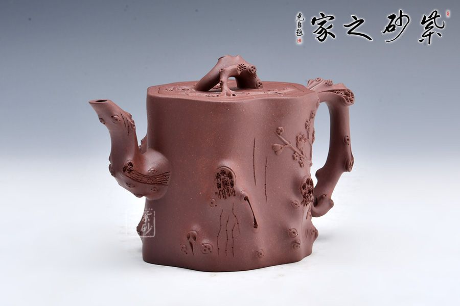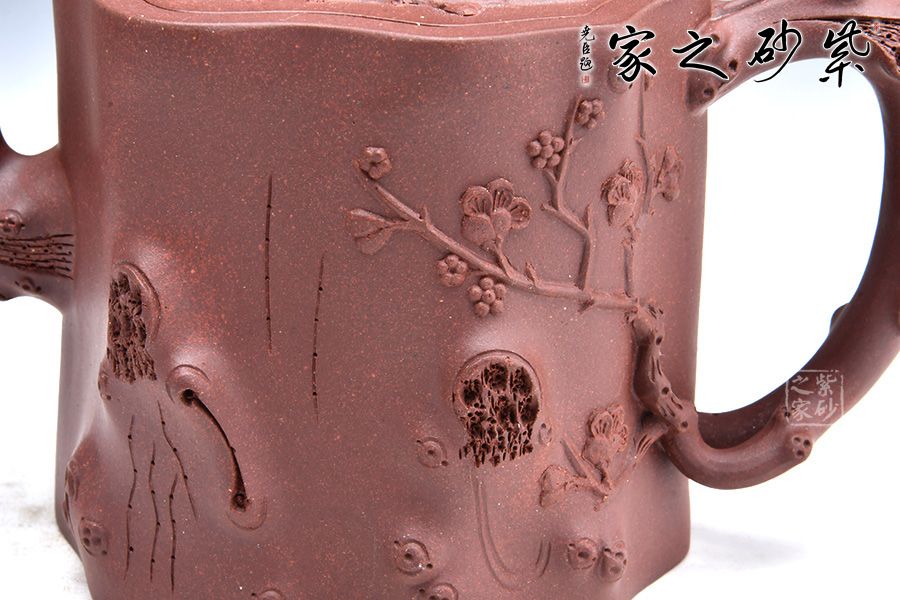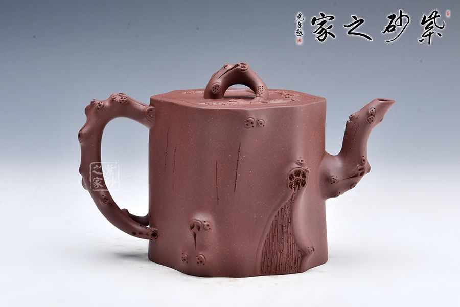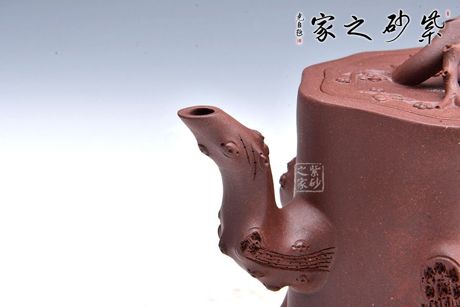 整壺以樹樁為壺身,流、把、鈕以樹枝隨形捏制,形態逼真,生動自然;主體與附件搭配合理,協調一致,節疤的處理很是精致;嵌蓋設計氣密性好。整器仿生形象,注重細節,生動自然,于無聲中彰顯美的底蘊,意味深遠,值得推薦!