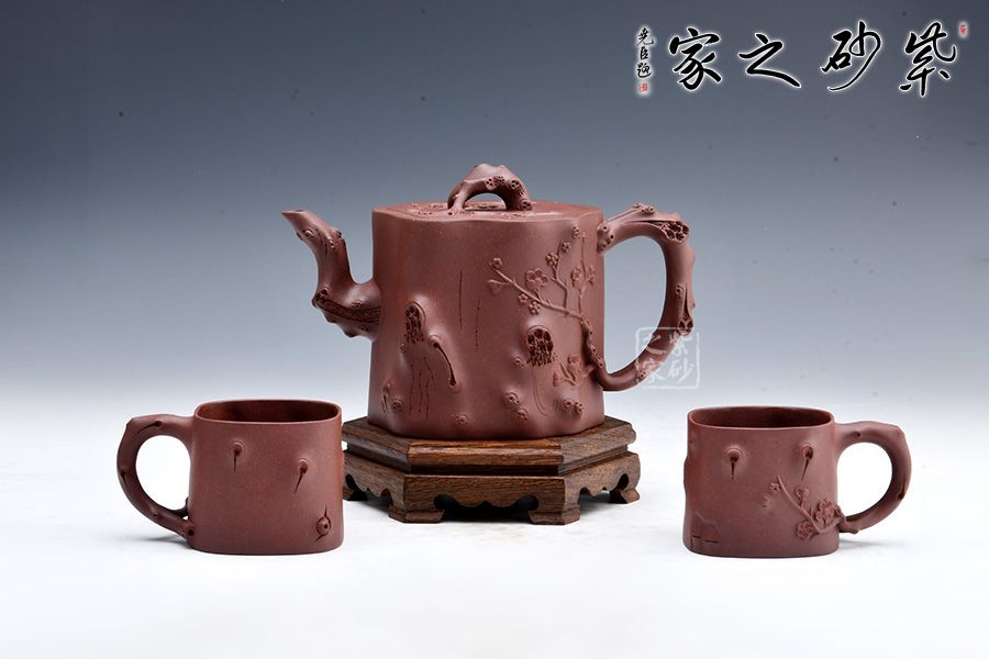 樹樁茶具精選原礦紫泥全手工制作而成,泥色醇厚,透氣性佳。一壺兩杯,是品茗把玩的首選之作。