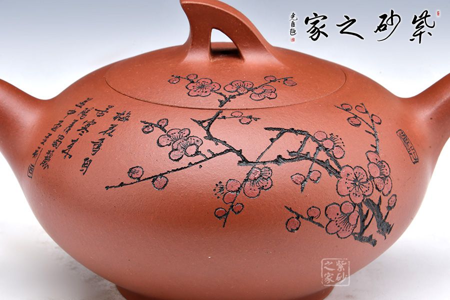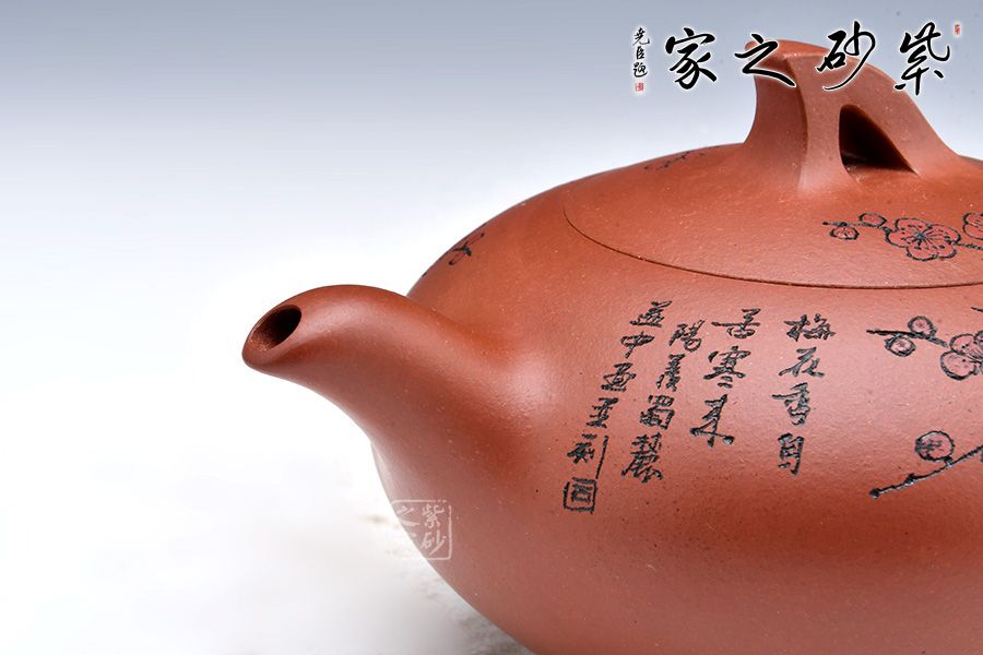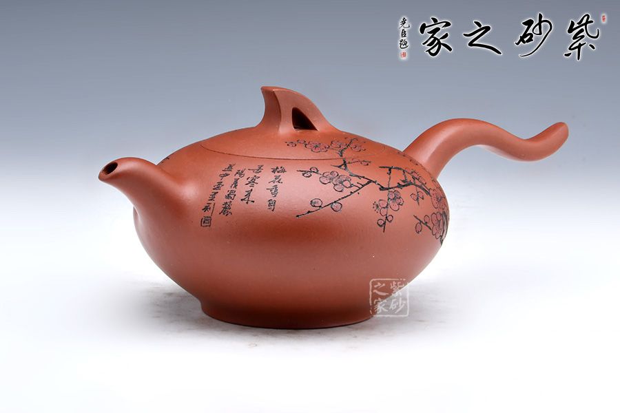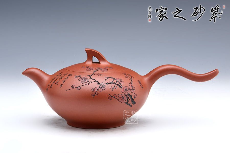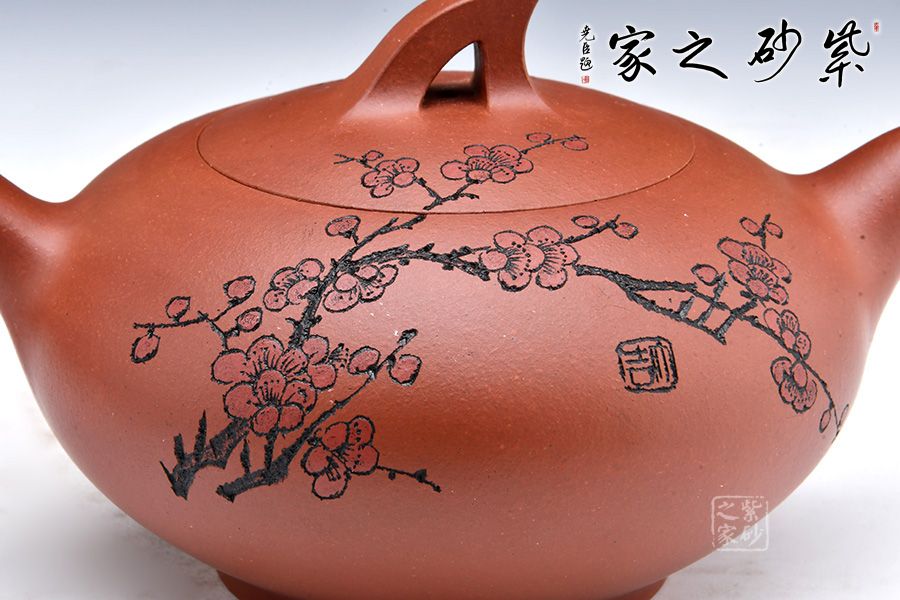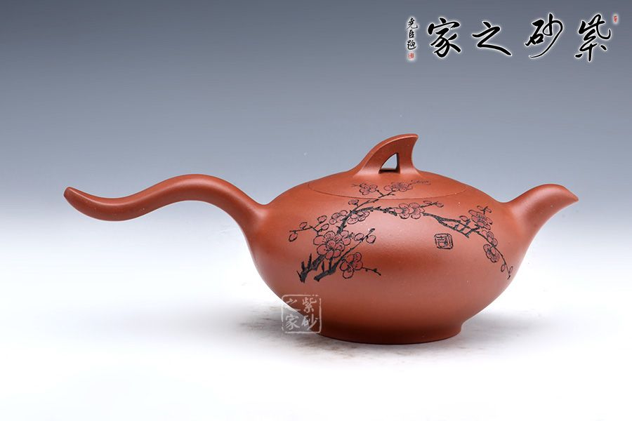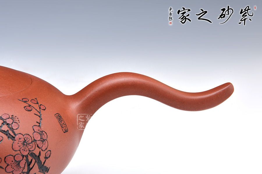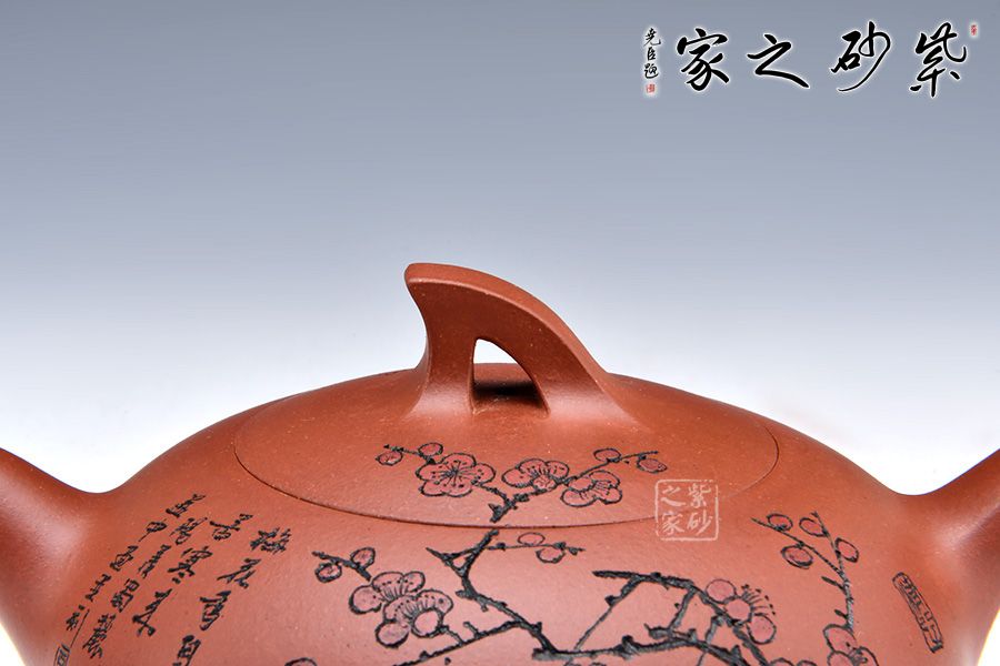 此壺線條感十足,飛把的設計不僅美觀而且好拿捏,壺身飽滿圓潤,讓人愛不釋手,整體造型就像一只正在飛翔的鳥兒。壺身刻繪梅花,梅花是從苦寒中來的,跟逆風而上的壺鈕相呼應,文人君子氣息十足。