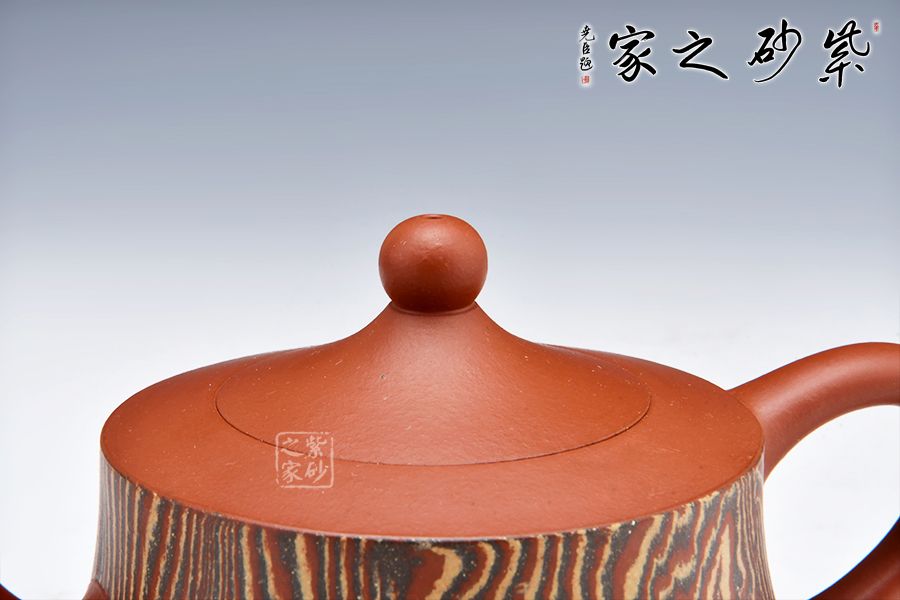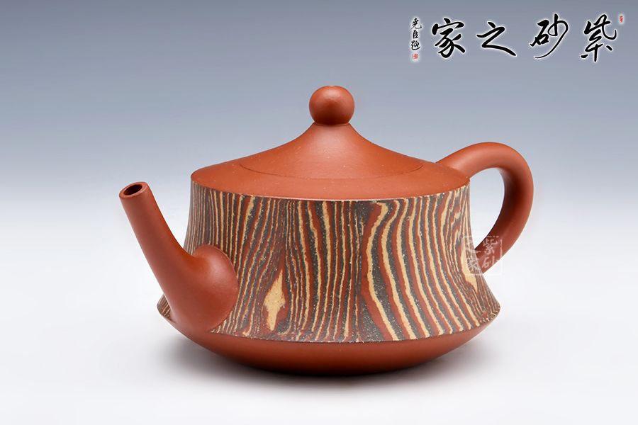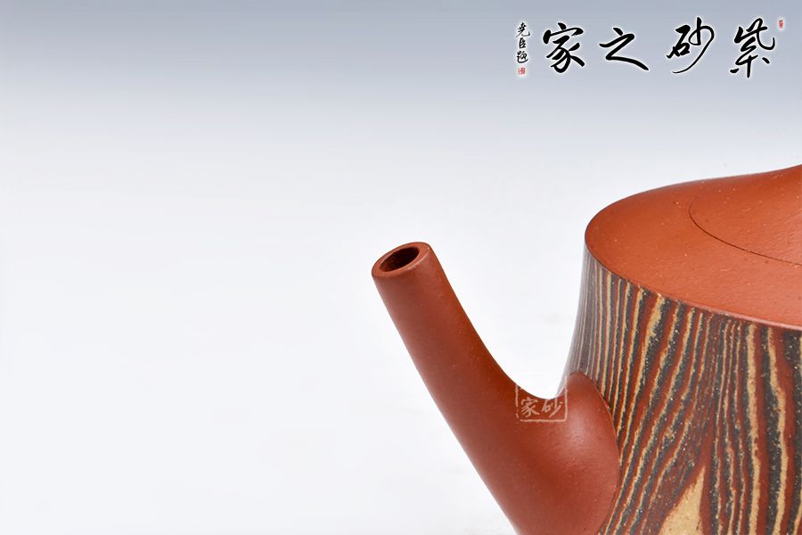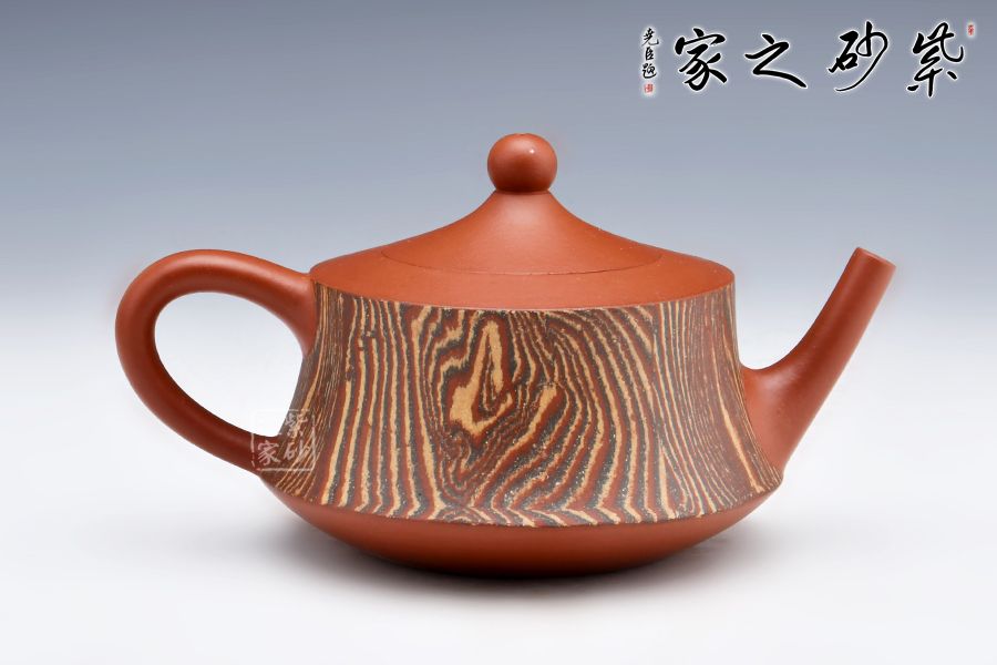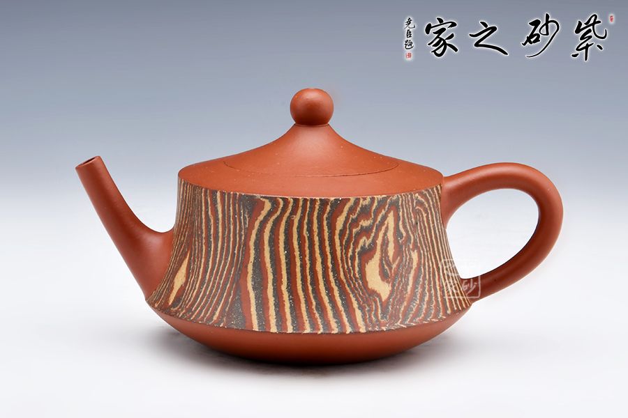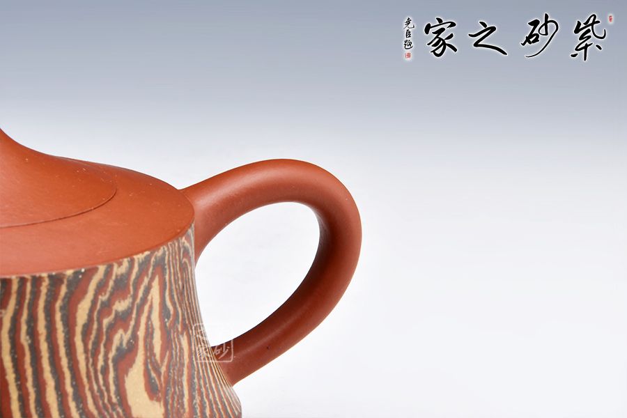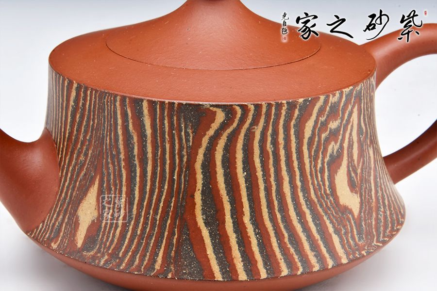 紫砂絞泥是采用兩種或兩種以上不同顏色的紫砂泥,經人工揉合、按壓、層疊、鑲嵌等多種手法絞和而成,再通過拍打泥片,并按要求切割泥片、鑲接泥片, 直至打 好身筒,這樣便在壺身上形成不規則卻十分自然和諧的紋飾圖案,如天際流云、似雨后彩虹;如湖光山色、似大漠原野等等,這些雖在小小的壺面上呈現出虛虛實實的圖象,卻能以小見大地營造出亦真亦幻、自然天成的意境,這正是紫砂絞泥具有的裝飾性。