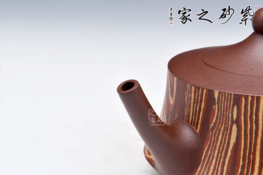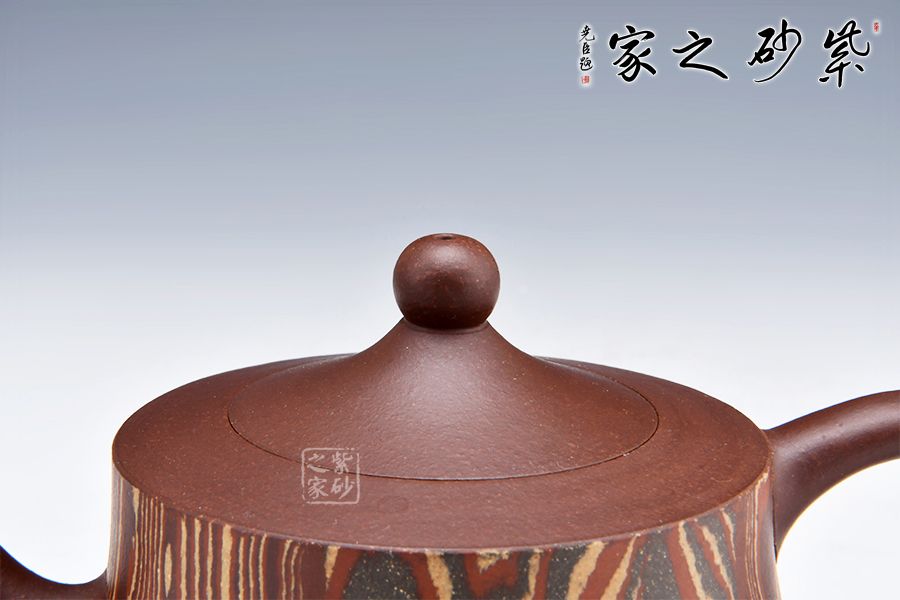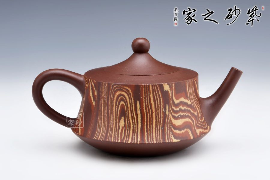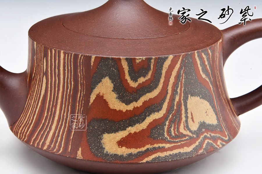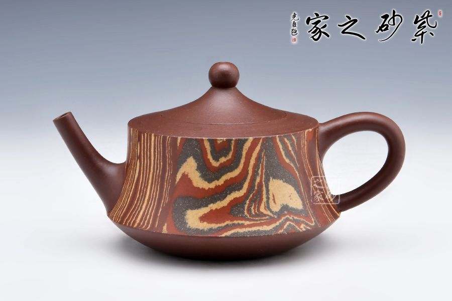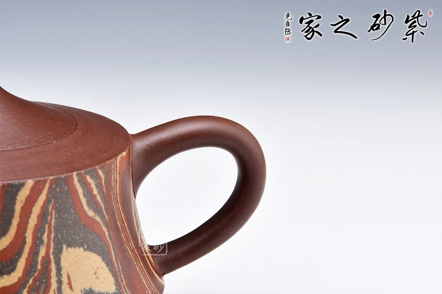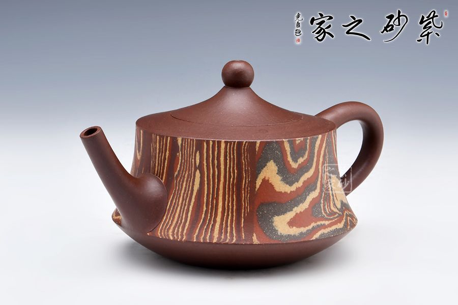 紫砂絞泥是采用兩種或兩種以上不同顏色的紫砂泥,經人工揉合、按壓、層疊、鑲嵌等多種手法絞和而成,再通過拍打泥片,并按要求切割泥片、鑲接泥片, 直至打 好身筒,這樣便在壺身上形成不規則卻十分自然和諧的紋飾圖案,如天際流云、似雨后彩虹;如湖光山色、似大漠原野等等,這些雖在小小的壺面上呈現出虛虛實實的圖象,卻能以小見大地營造出亦真亦幻、自然天成的意境,這正是紫砂絞泥具有的裝飾性。
