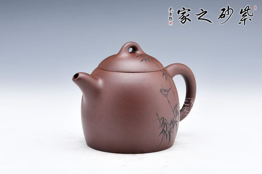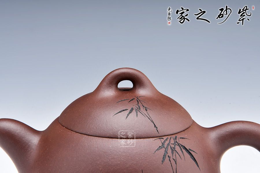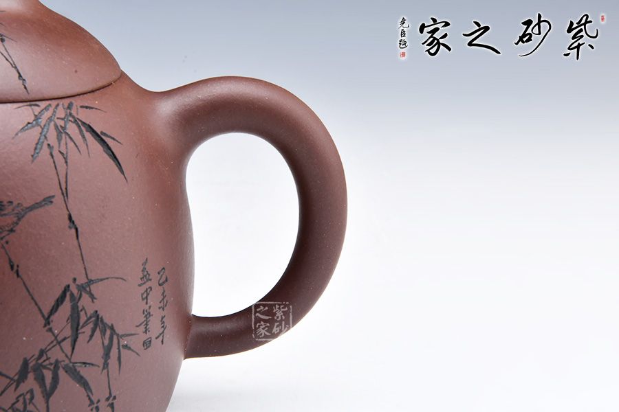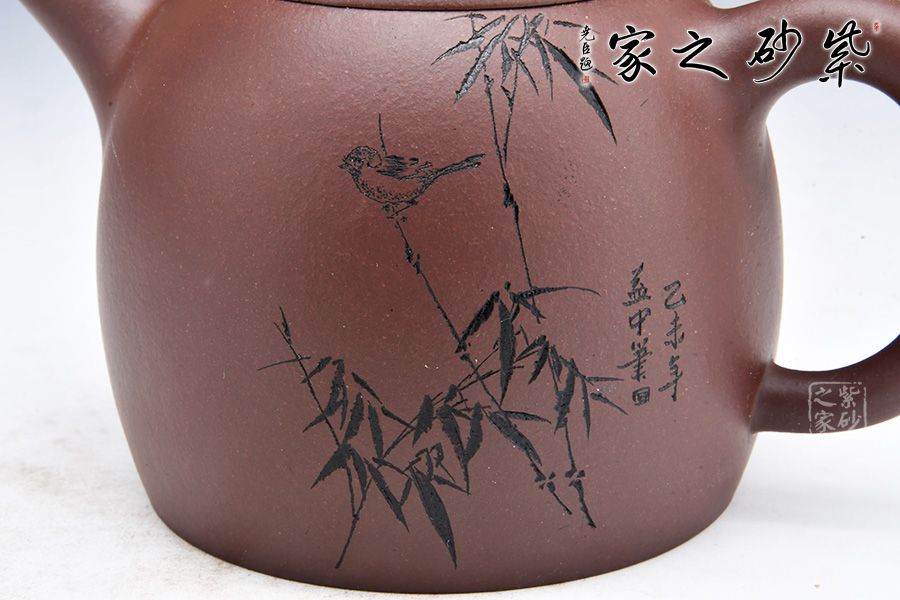 此壺極其簡練、古樸,橋鈕壓頂,與壺身形態(tài)相應(yīng)和;可以看出鈕狀略平,顯內(nèi)斂、沉穩(wěn),正切合秦權(quán)古韻。此壺在壺身刻繪竹段,疏影橫斜,清風徐來,簡單的刻繪不僅使整款壺古樸中帶幾分文人墨氣,更似乎嗅到幽幽茶香,切壺切查,極為難得。壺身正面兩個行書刻字業(yè)正好切壺,簡潔而大方,為老韻壺中典范。喜歡的壺友不妨細賞一番!