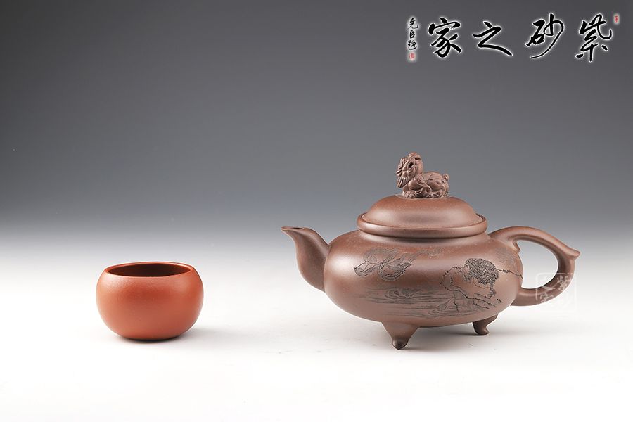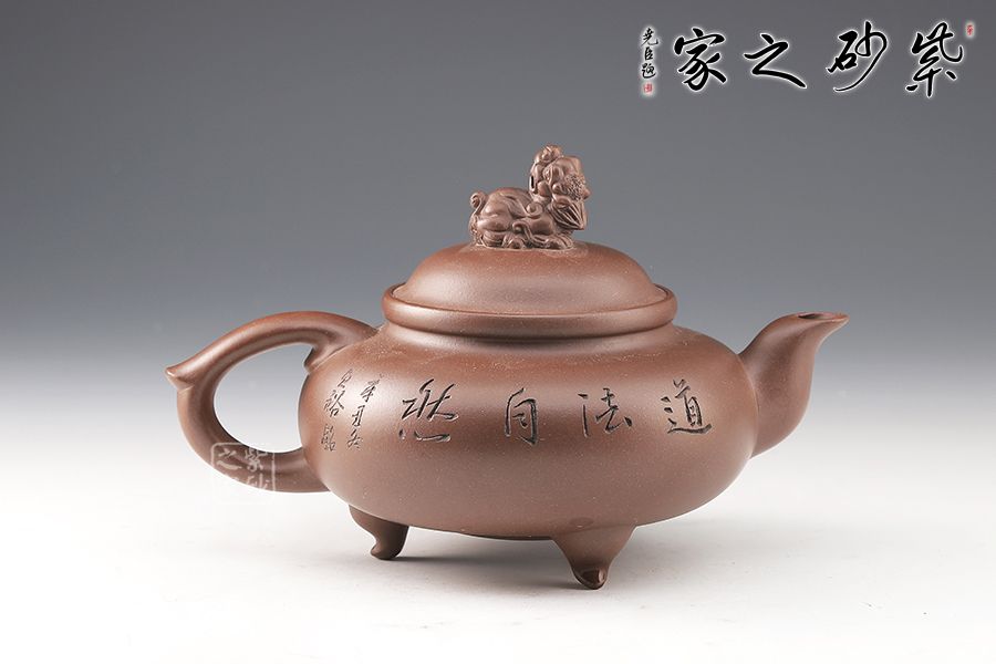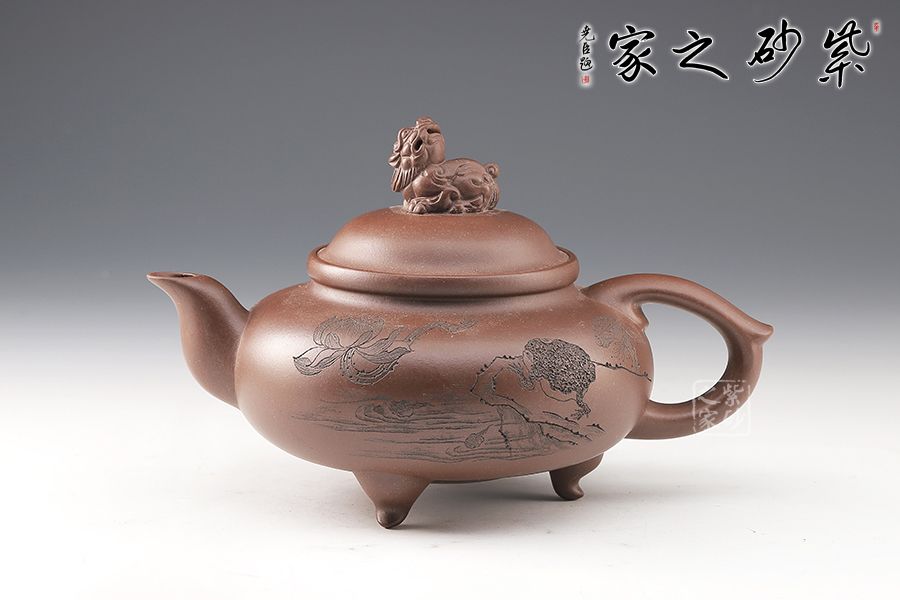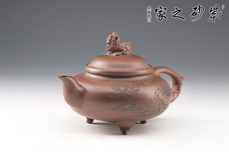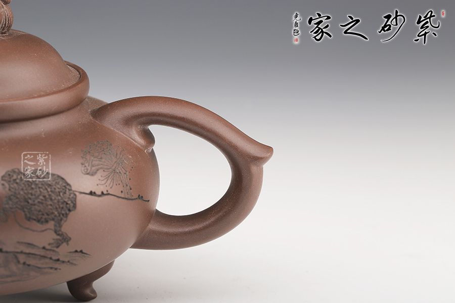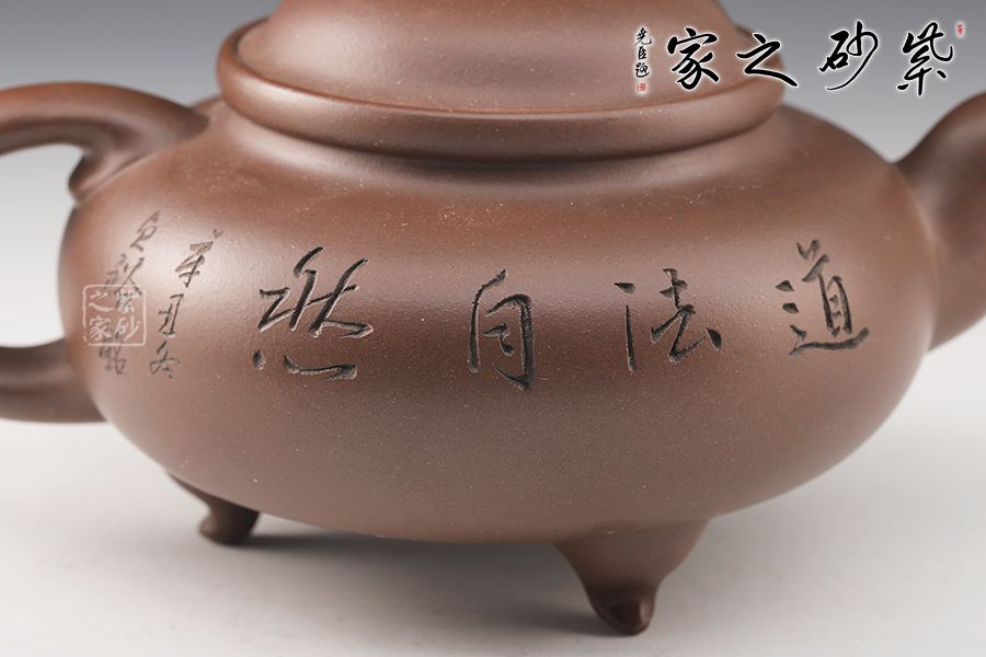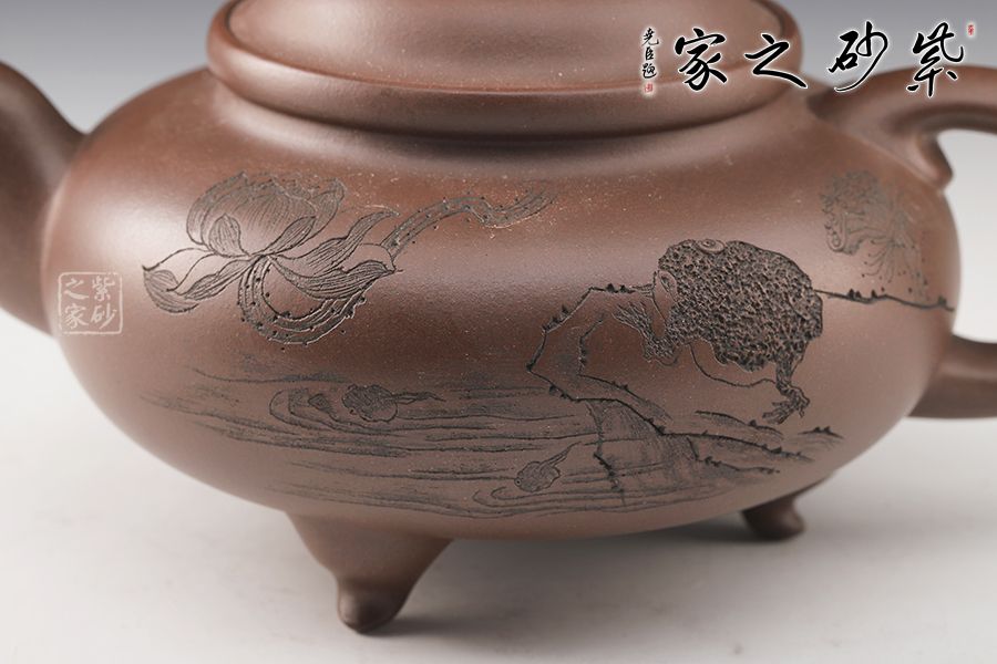 三足而立外撇,靈動的支撐起整器,顯得大氣內(nèi)斂,紫泥特有的成熟穩(wěn)重與端莊肅穆又彰顯出器型的神韻。雙面刻繪,平添意趣,值得賞藏。