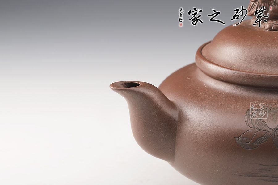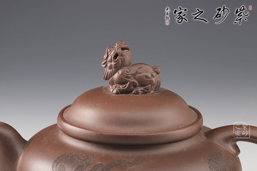 此壺名曰祥瑞,其中寓意自不必多說,可見老師用心之深。壺身略扁呈梯形,壺嘴壺把在同一直線,皆為自然胥出,壺把粗細過度自然,兩者所形成的虛實空間很好的突出壺的完美輪廓,祥瑞瑞獸為鈕,精致而生動,以物寓意,獨具匠心。
