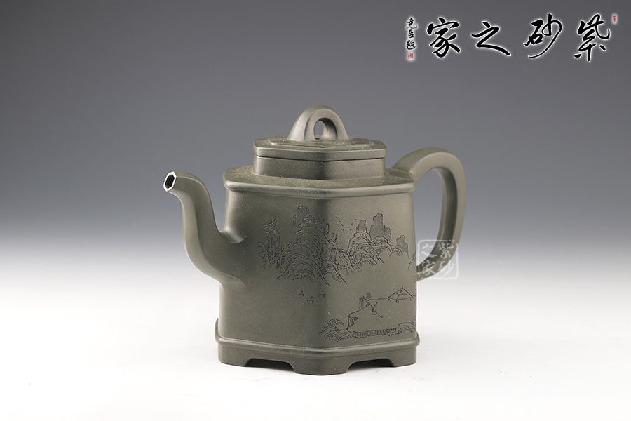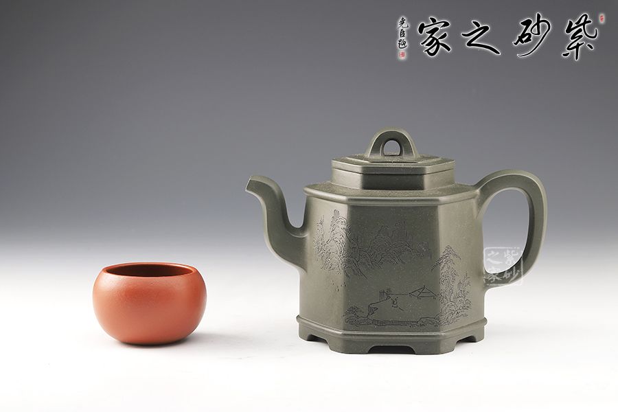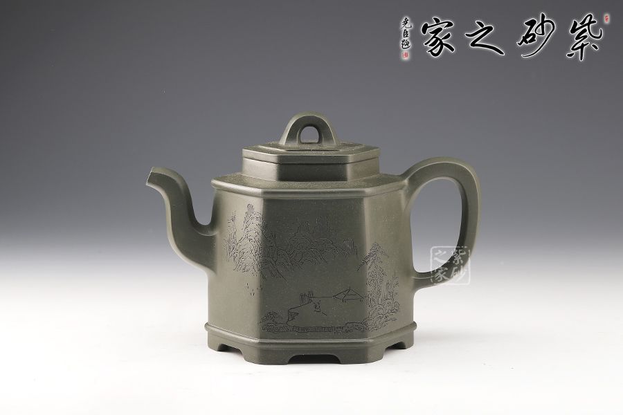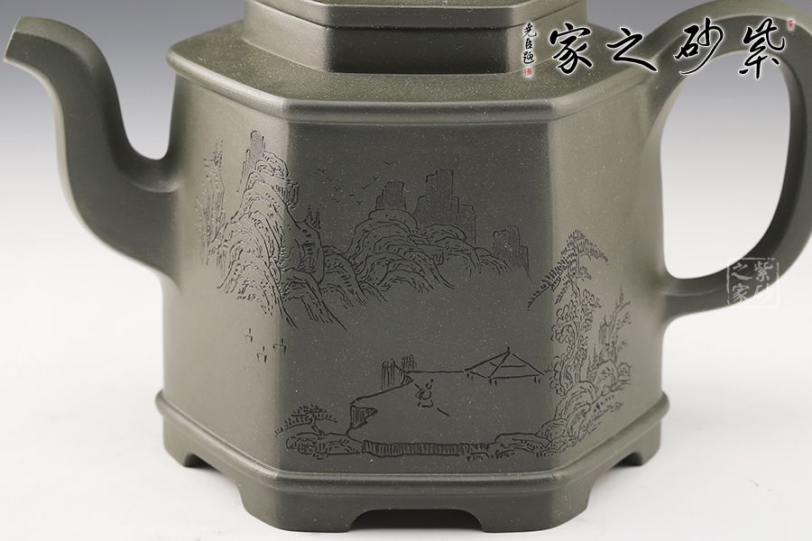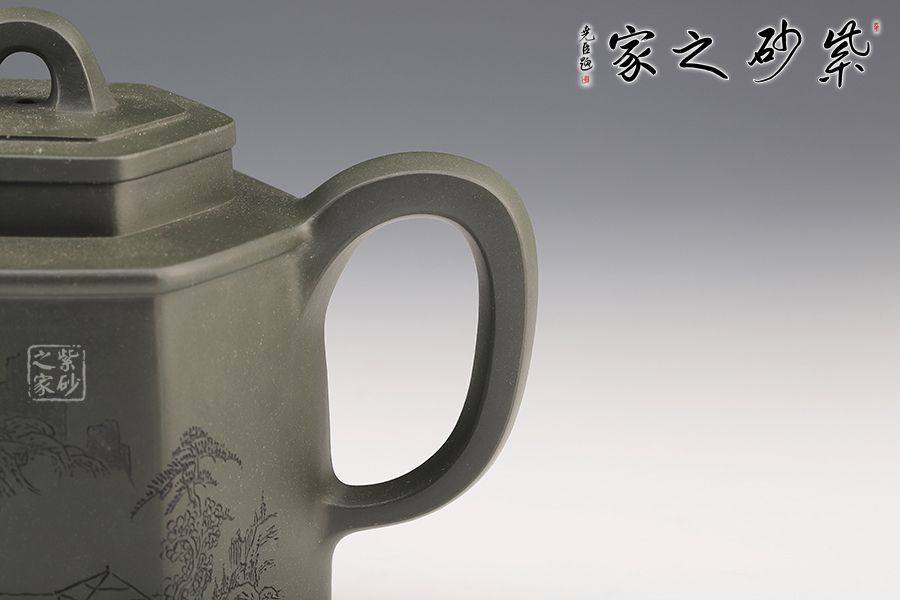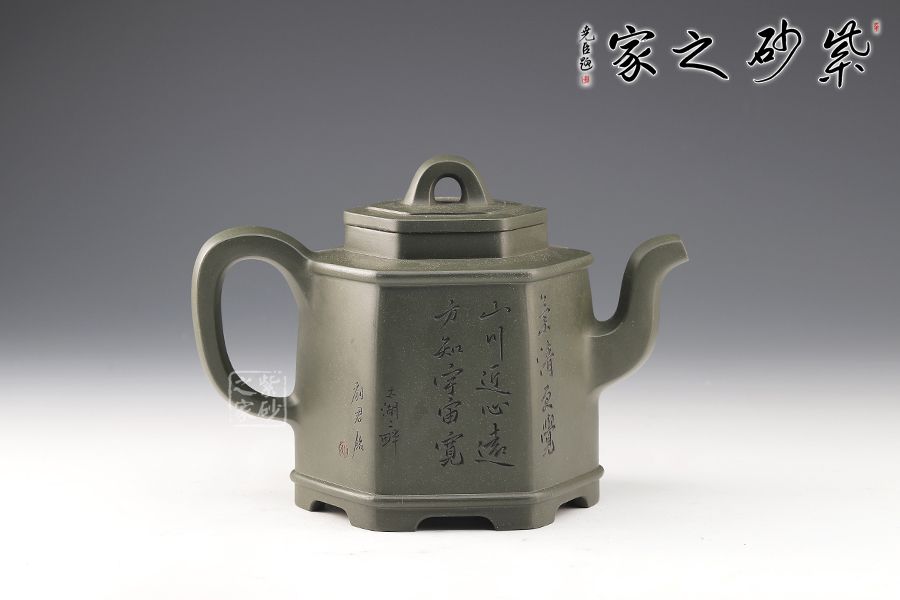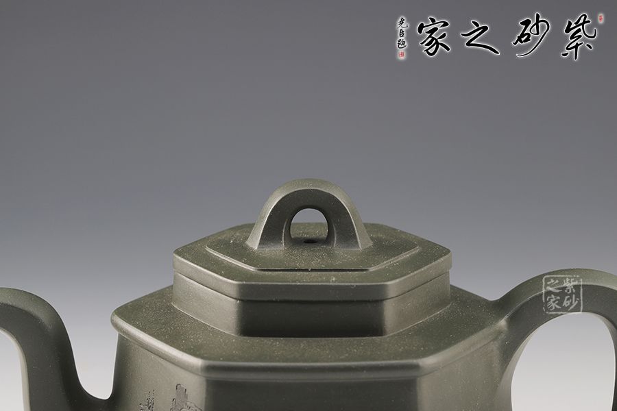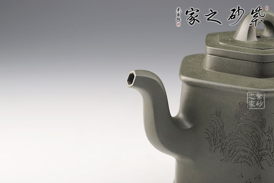 該壺為民國綠泥制成,規整的六方壺型制作,整體如山間古寺,比例精準,線條緊湊流暢,整體一氣呵成,意蘊悠然,足見制壺者精湛的制壺工藝。壺鈕,壺蓋,壺口,短壺頸皆是規整的六方形,對稱工整。壺身上斂下豐,穩重大氣,壺底設計,若鏤空裝飾,美觀新穎,給沉穩的壺身平添一股靈動飄逸之氣。此壺,簡約中令人驚嘆,耐人尋味,是實用和珍藏的極佳選擇。