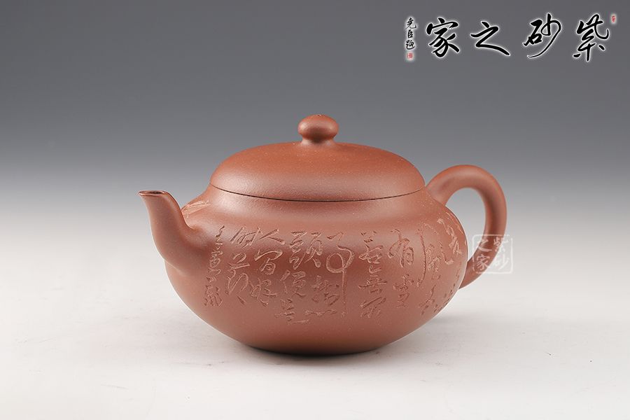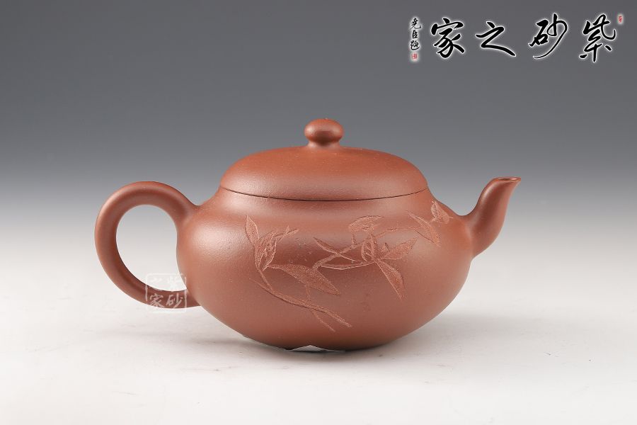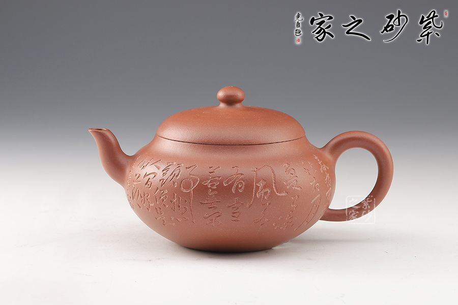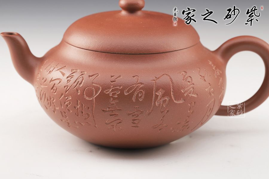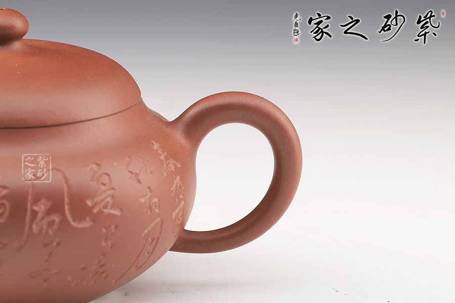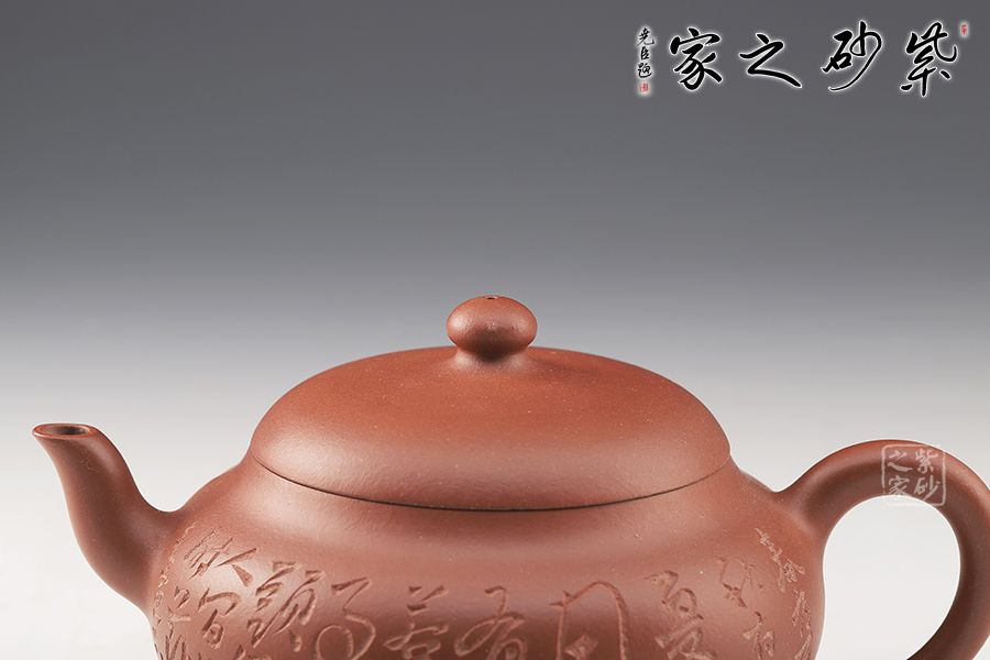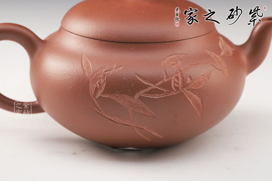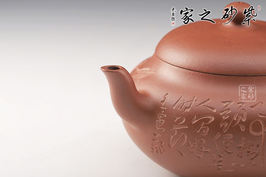 此壺選用原礦底槽青手工制作,一氣呵成的刻繪,給壺增添了行云流水之氣韻。該壺巧妙之處不僅在于壺身飽滿圓潤,賦予意義和想象,還在于壺嘴和壺把的暗接工藝增強了壺的骨干之美,使得流暢的線條中不失爽利之感。截蓋設計,整個器型渾然一體,嚴絲合縫,氣密性良好,使壺型完整和諧,流暢自然。彎流古樸蜿蜒,線條優(yōu)雅,出水利落。圓形端把,舒適稱手,端握有力。