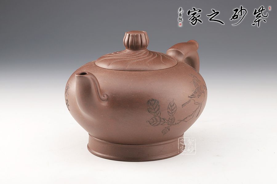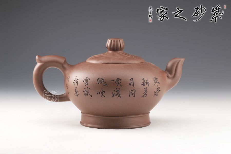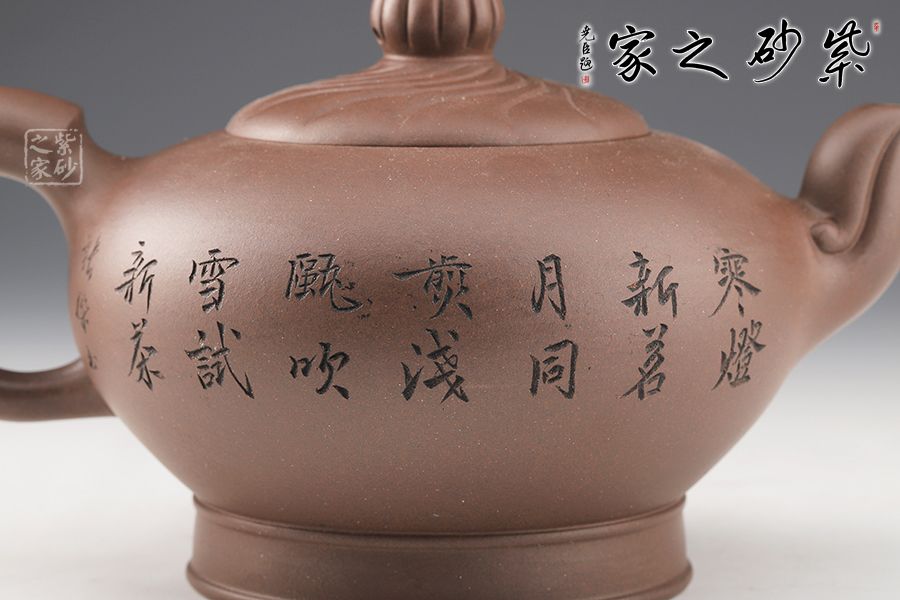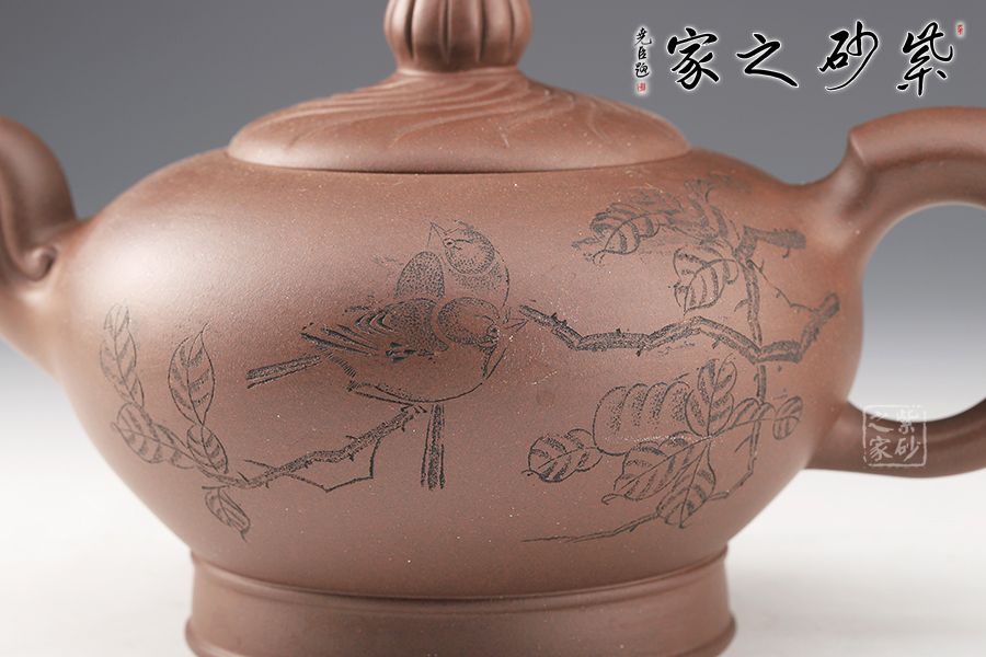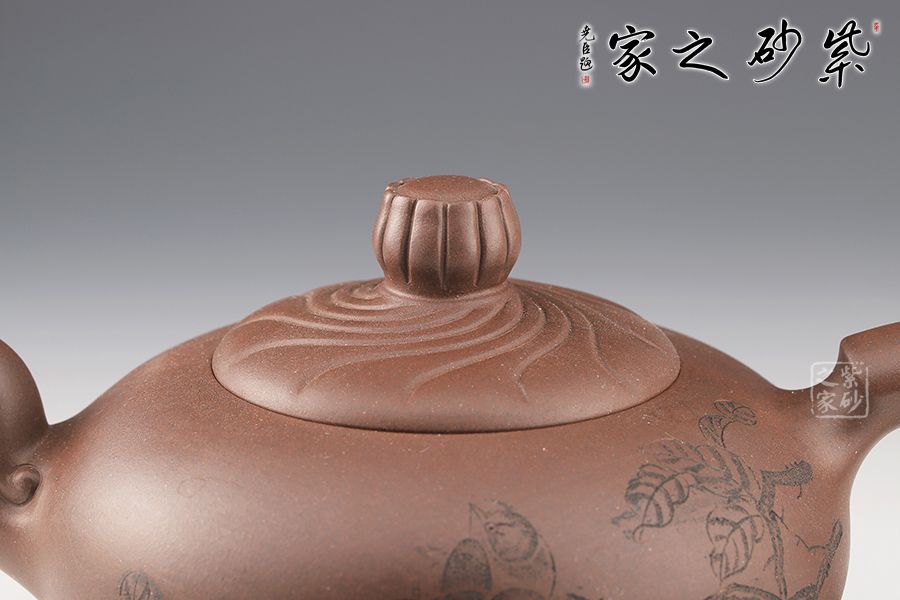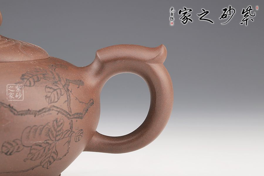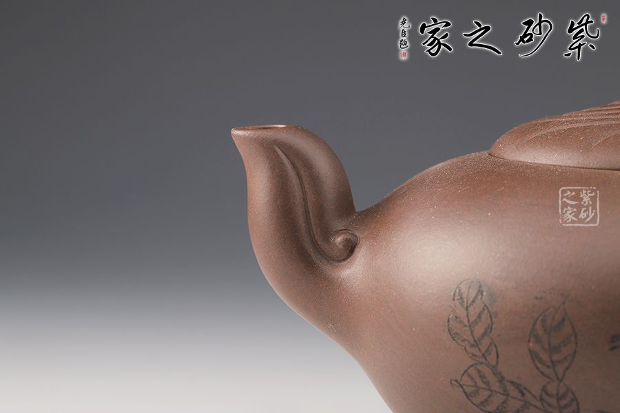 壺身飽滿,大腹翩翩,如人之福氣。壺嘴彎而有力,飛把拿捏舒適。鈕蓋筋紋線裝飾,十分獨特。壺底加高,挺拔了壺身。整個壺形氣勢澎勃,絢麗多姿,秀氣凌人。