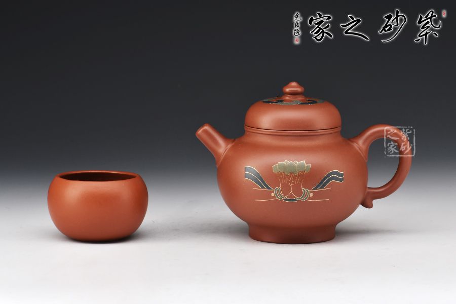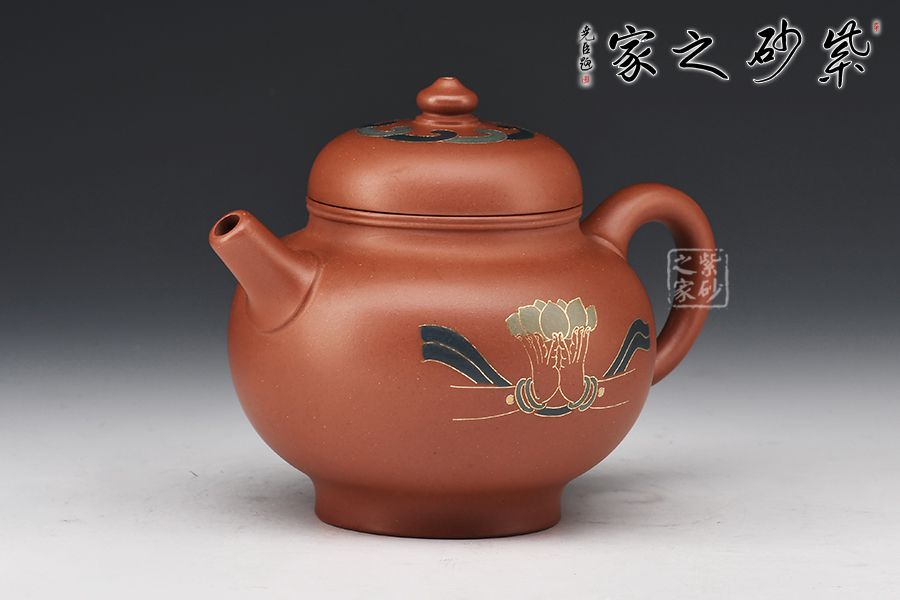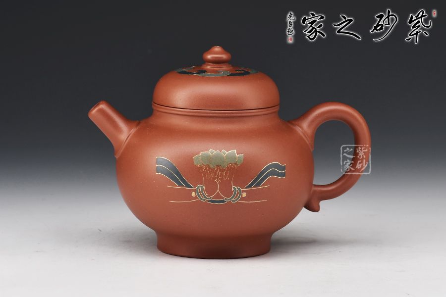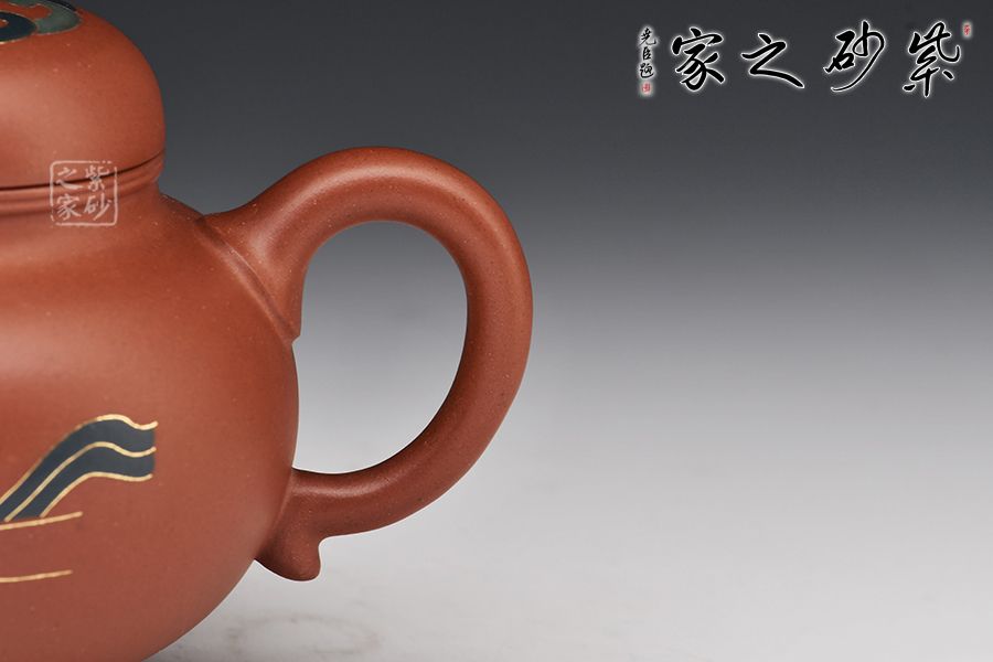 此壺頗具創(chuàng)意,壺身端莊秀氣,圓潤飽滿,線條簡練大方,表現形式獨具匠心,十分耐看。直筒炮嘴,出水爆爽有力,耳把弧度俊雅自然,便于拿捏,的鈕與壺蓋一體,其上裝飾一圈似水如云之紋,顯佛家古亭之韻,壺身描金填色佛手捧蓮之圖案,與其蓋遙相呼應,映襯道心恒長之名,佛氣自顯,賞用皆宜!