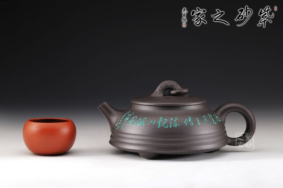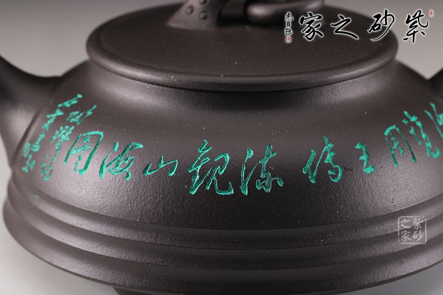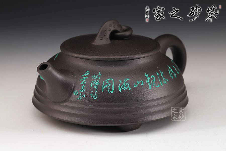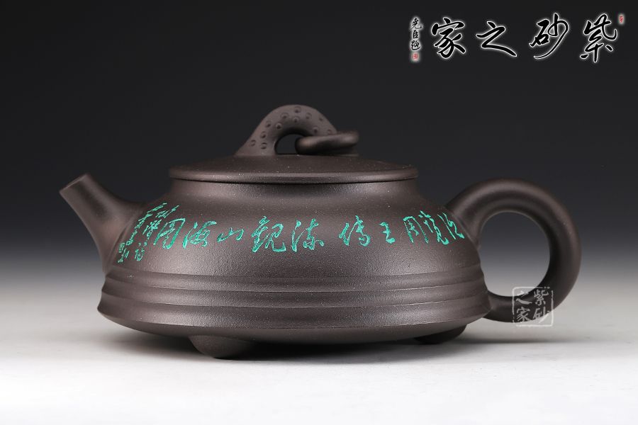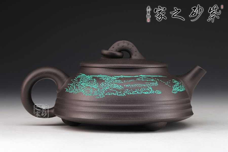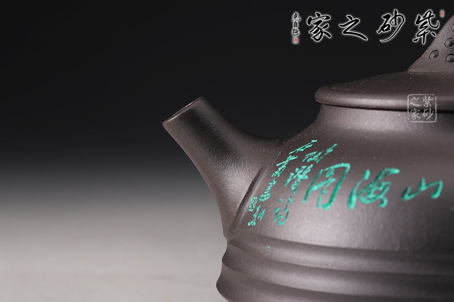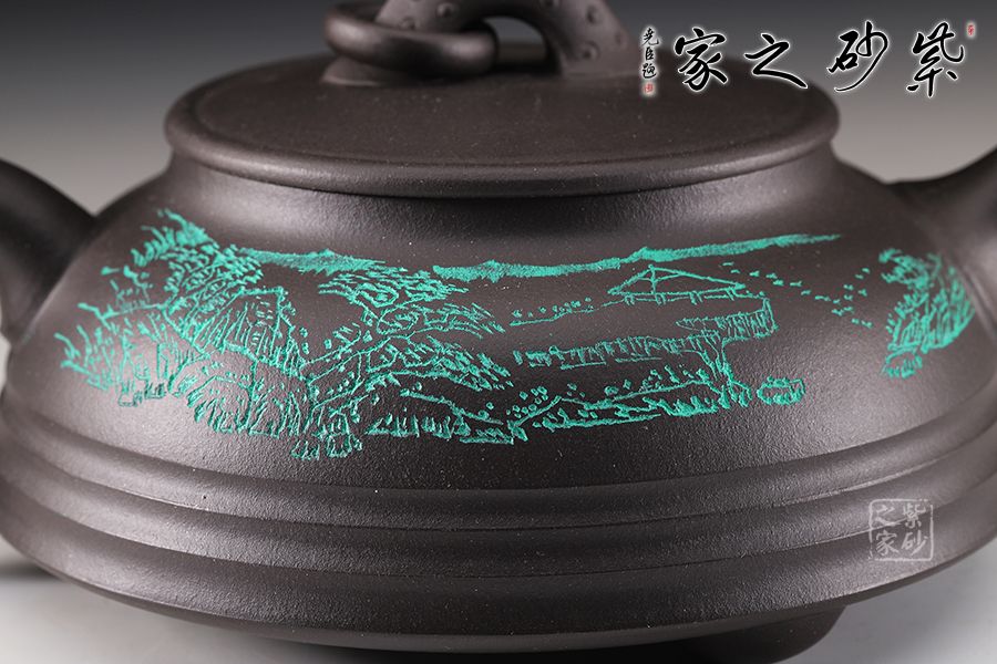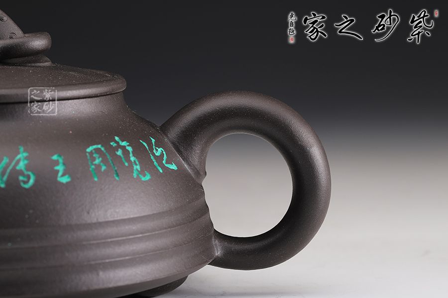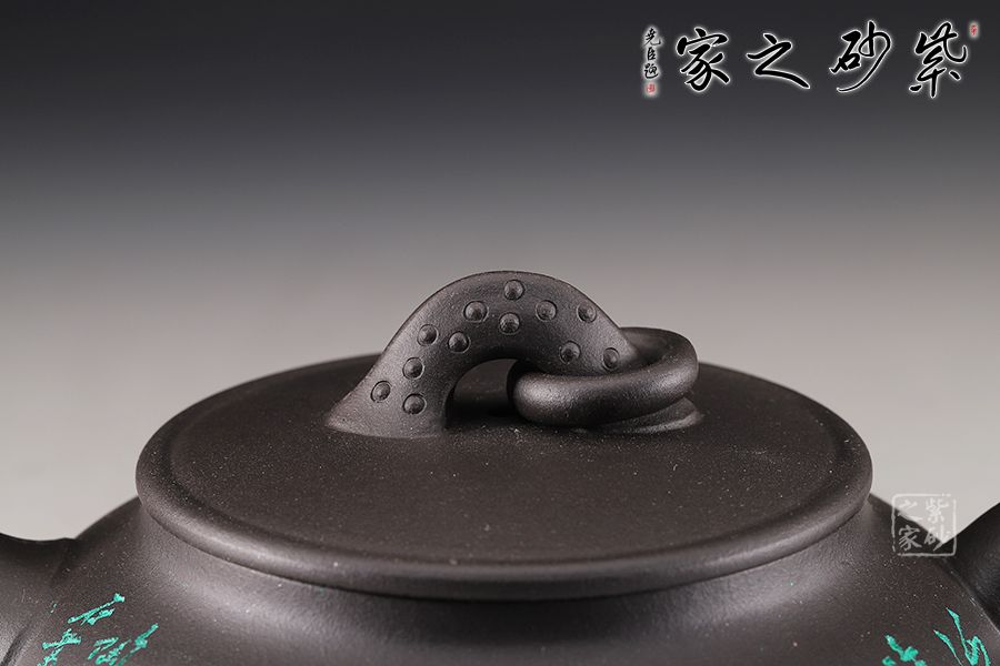 精選一廠黑料,全手工制成。整壺非常有層次感,壺腹束線圓線,由小到大,層層鋪開,很有立體美感。拱形壺紐、微鼓蓋,壺頸裹云肩線,溜肩線條流暢,加以刻繪裝飾,美壺一把,值得養(yǎng)用!