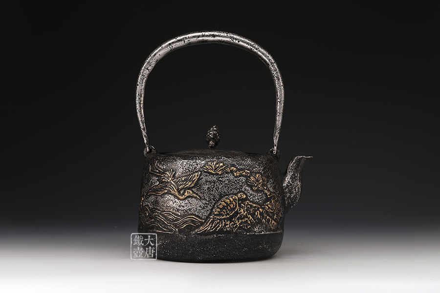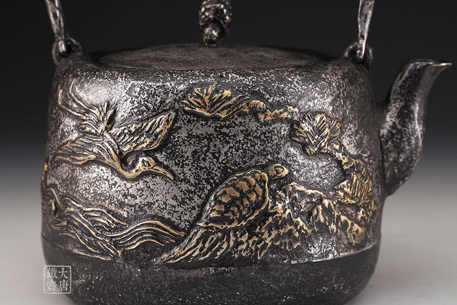 荒井工房的鐵瓶除了在鑄造工藝上有嚴(yán)格的規(guī)范和體系,在鐵瓶裝飾技術(shù)上也頗有建樹。除了傳統(tǒng)的印刻技術(shù)外,荒井工房還掌握了非常出色的金銀鑲嵌技藝,尤其以大片的鏨刻銀片最為出眾,這在山形當(dāng)?shù)靥每谥歇?dú)樹一幟。