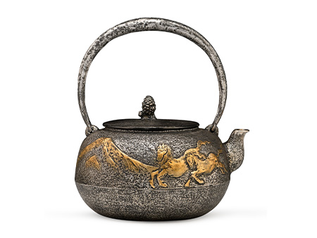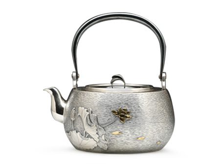 荒井工房的鐵瓶除了在鑄造工藝上有嚴(yán)格的規(guī)范和體系,在鐵瓶裝飾技術(shù)上也頗有建樹。除了傳統(tǒng)的印刻技術(shù)外,荒井工房還掌握了非常出色的金銀鑲嵌技藝,尤其以大片的鏨刻銀片最為出眾,這在山形當(dāng)?shù)靥每谥歇?dú)樹一幟。