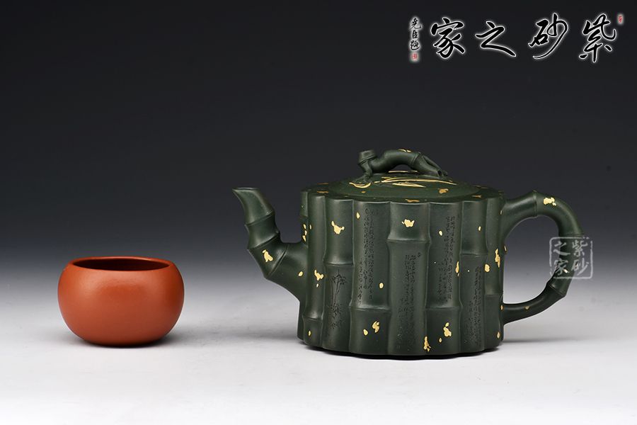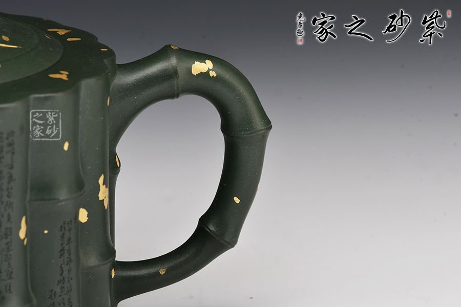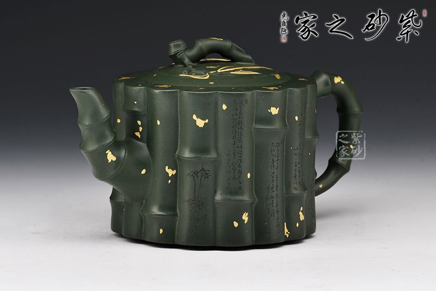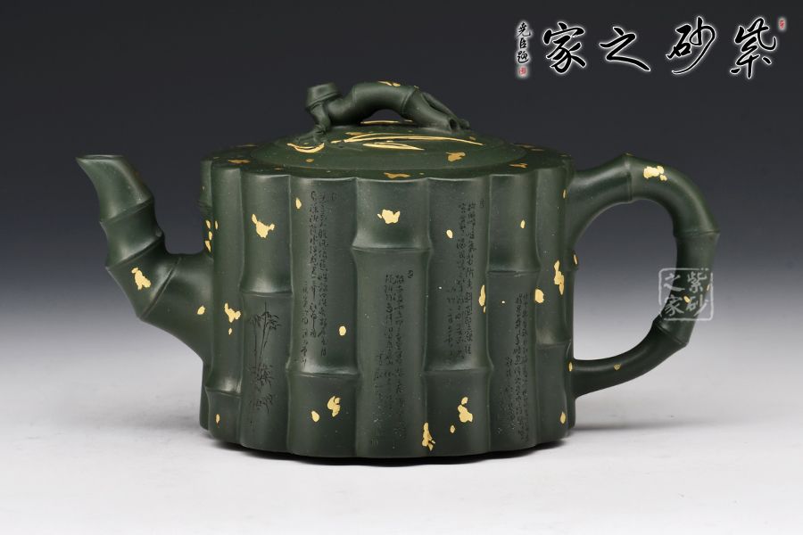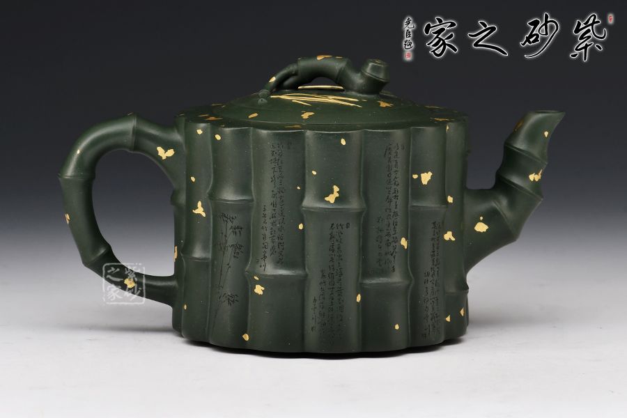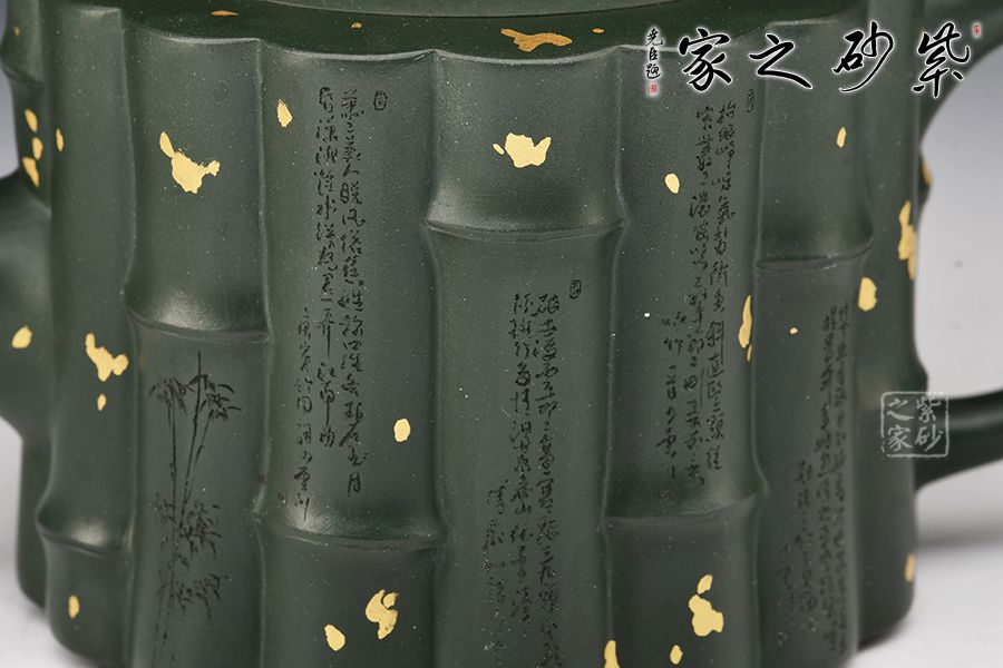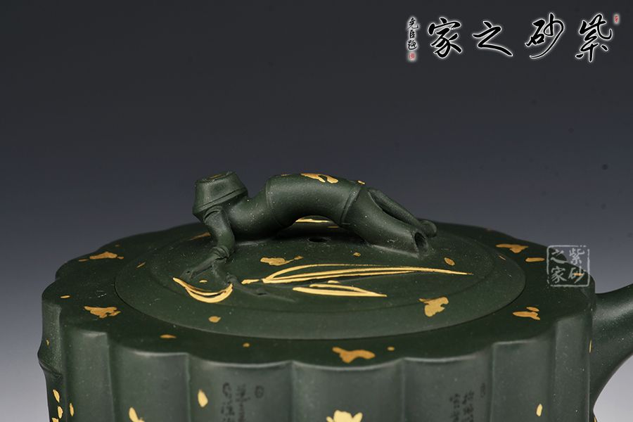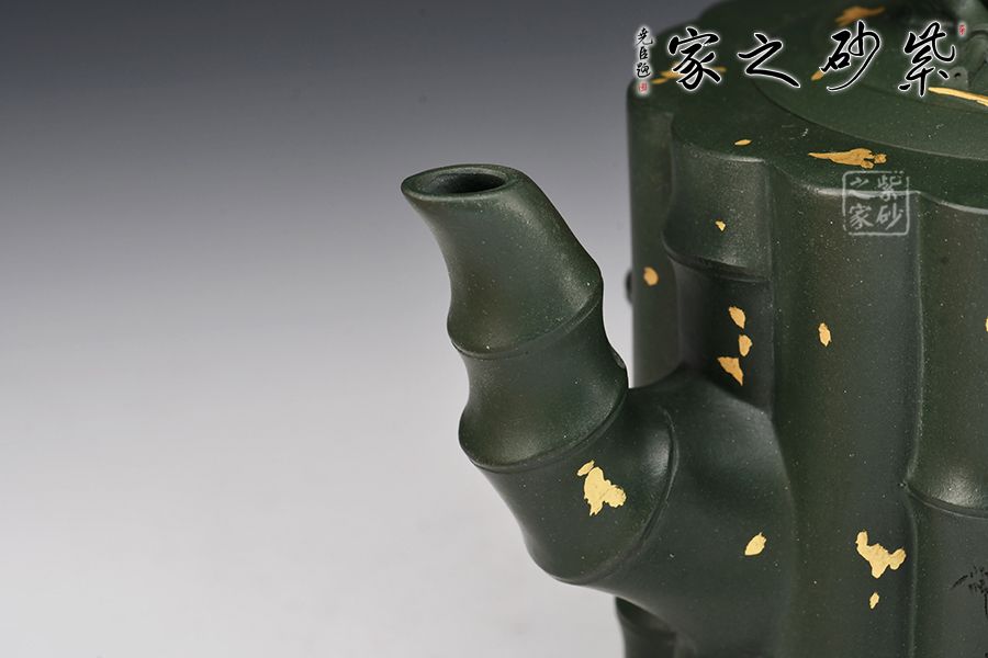 取竹為壺, 形間舒朗,懷幽品納聽(tīng)竹音。物為藝成器,悅其天然機(jī)趣! 此壺器型渾厚大氣,氣勢(shì)非凡,筋紋線(xiàn)條流暢,似竹干挺立,清雅飄香。壺身、壺紐、壺流、壺把各處皆模竹節(jié)之型,肥瘦得體,韻味極佳,竹之氣節(jié)、精神皆表現(xiàn)得淋漓盡致。撒金+刻繪裝飾,韻味十足。