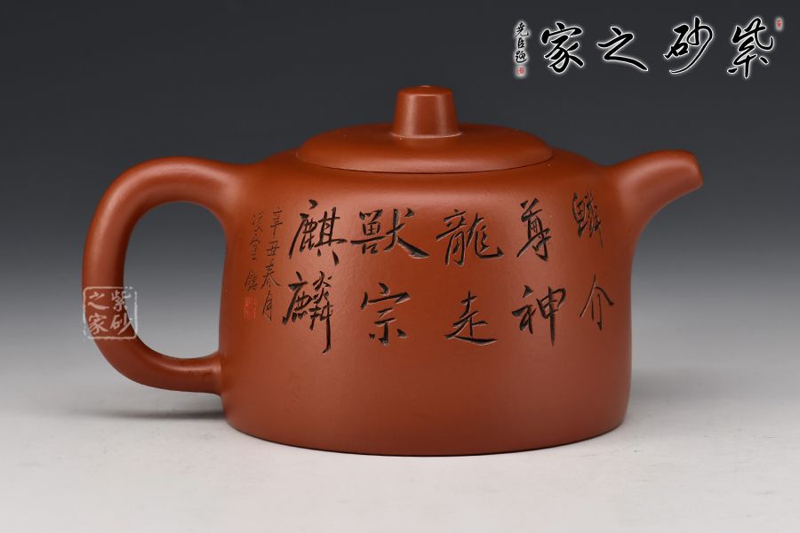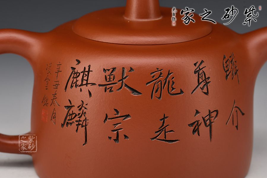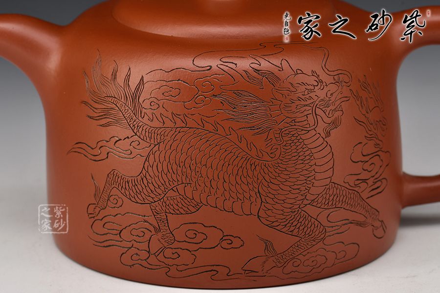 此壺無繁復,單靠造型美、線條美、色調美,即予觀者強烈的藝術感染力。壺身一面刻繪麒麟圖,一面題字“鱗介尊神龍,走獸宗麒麟”,縱刀如使筆,字字傳神。
