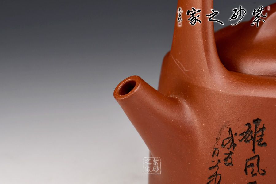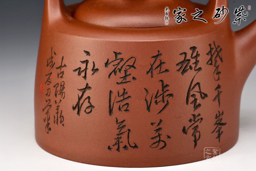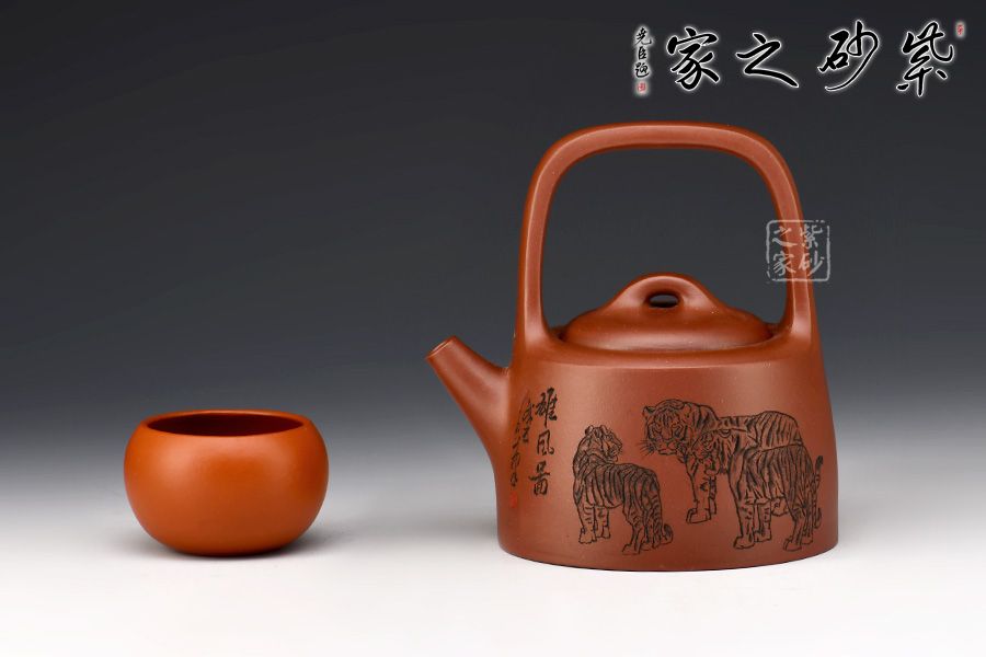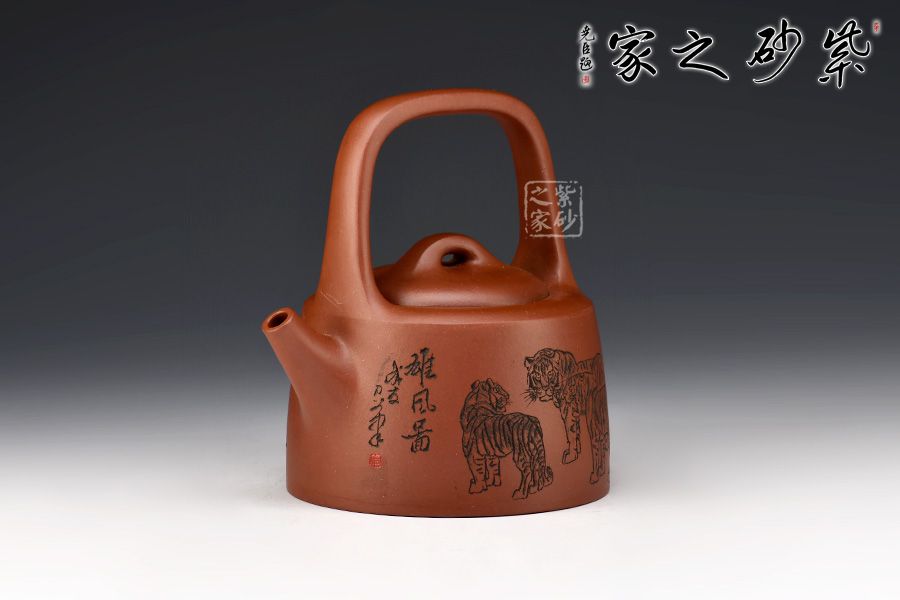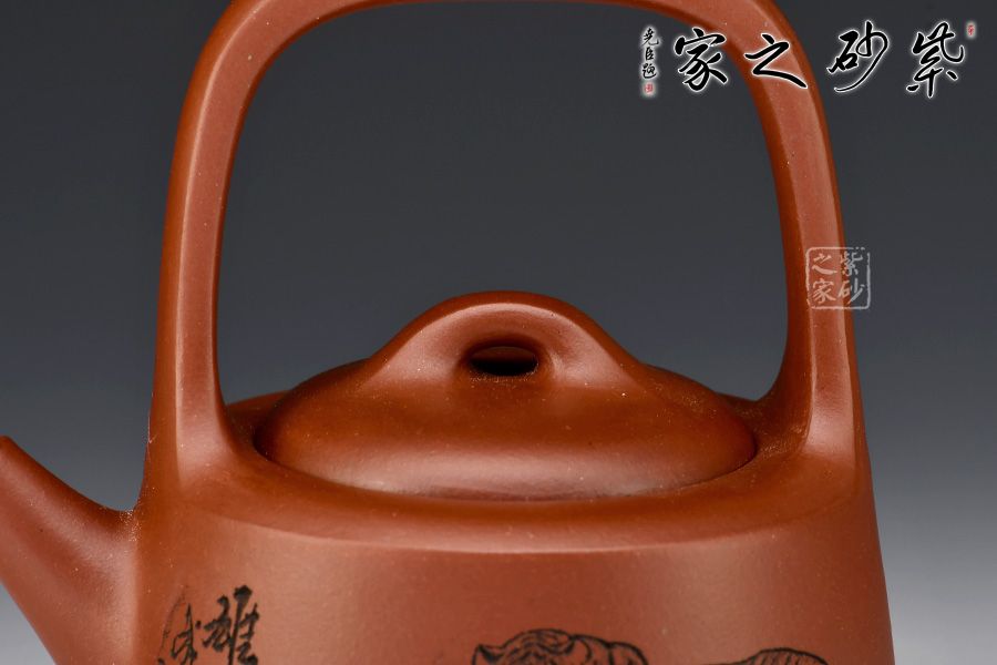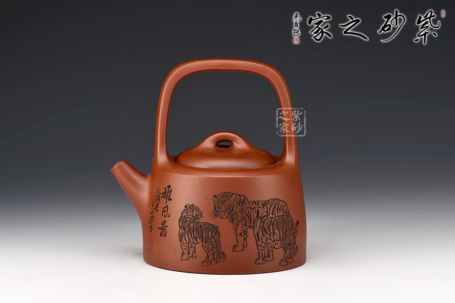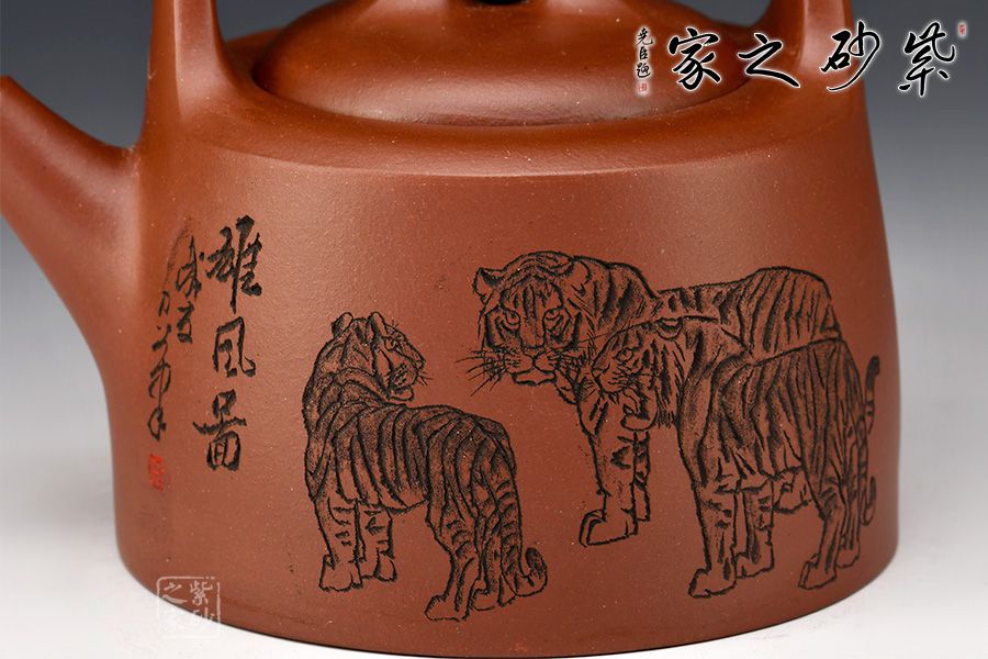 “曼生提梁”是曼生十八式中重要器形形制之一,也是各個(gè)藝人爭(zhēng)相仿效的經(jīng)典壺型。壺身呈半圓柱形,圓中寓直,直中寓曲,耐人尋味。壺身正面刻繪:攀千峰雄風(fēng)常在,涉萬(wàn)壑浩氣永存”,借正面的虎寄托精神境界,整壺實(shí)用與藝術(shù)一體,喜歡的壺友一定不要錯(cuò)過(guò)。