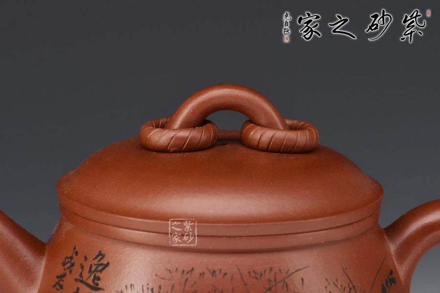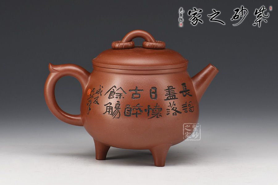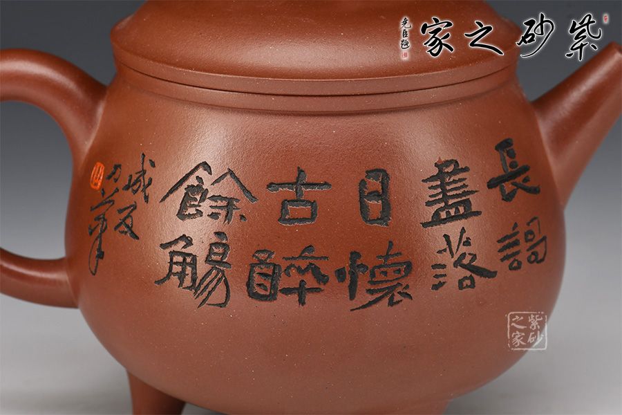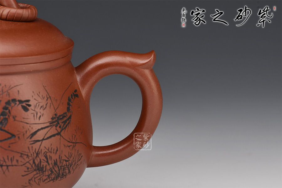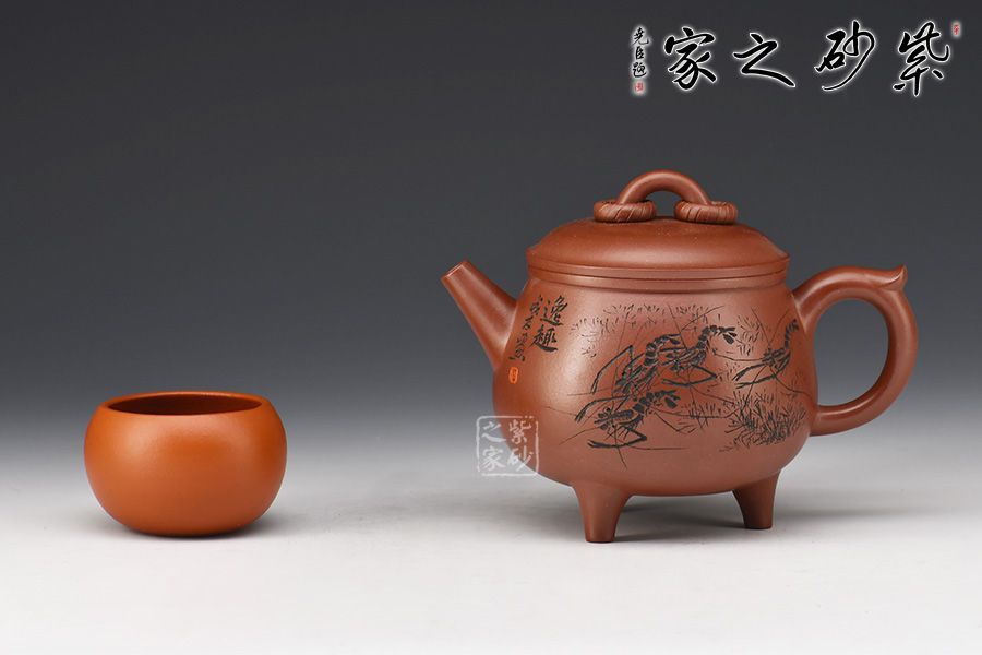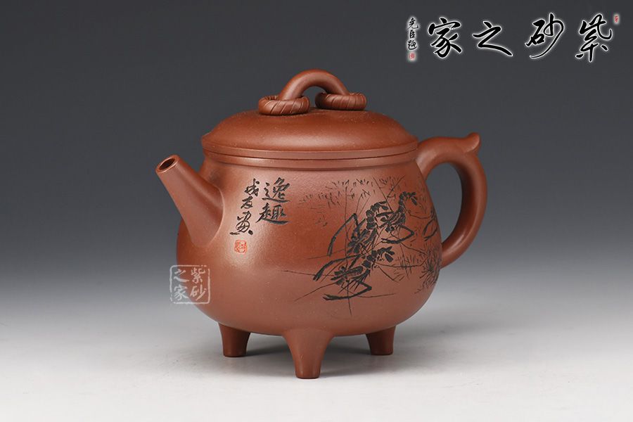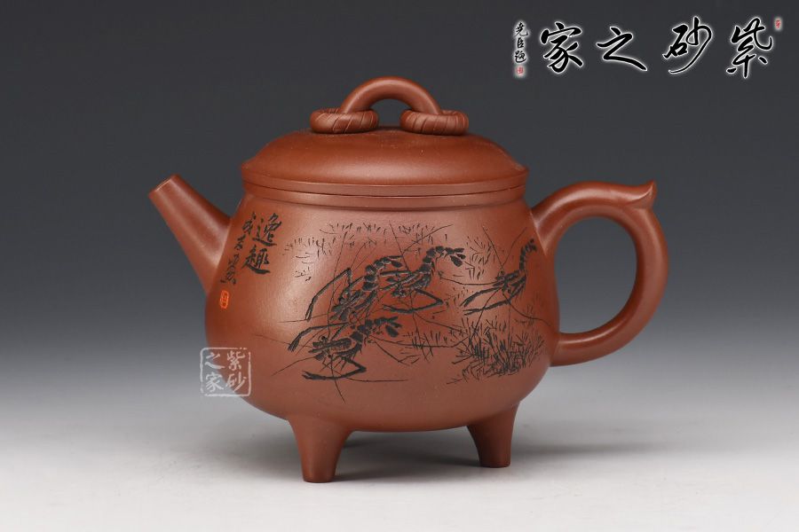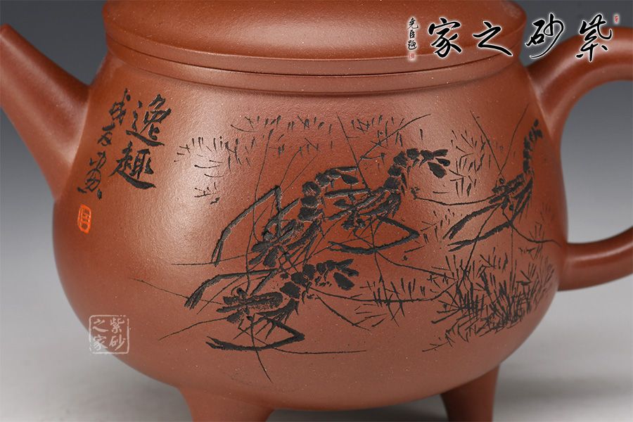 此壺造型圓潤(rùn),壺身飽滿,底部順勢(shì)塑出三足,沉穩(wěn)霸氣。直流嘴利落大方,整壺以“鼎”為主題,濃厚的文化與歲月文明的積淀,在線條的起承轉(zhuǎn)合之間漸漸蘇醒。壺身刻繪的蝦栩栩如生,整壺霸氣莊嚴(yán)且不失逸趣!