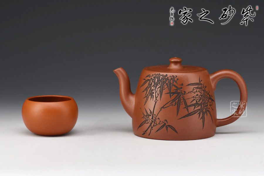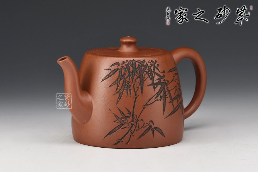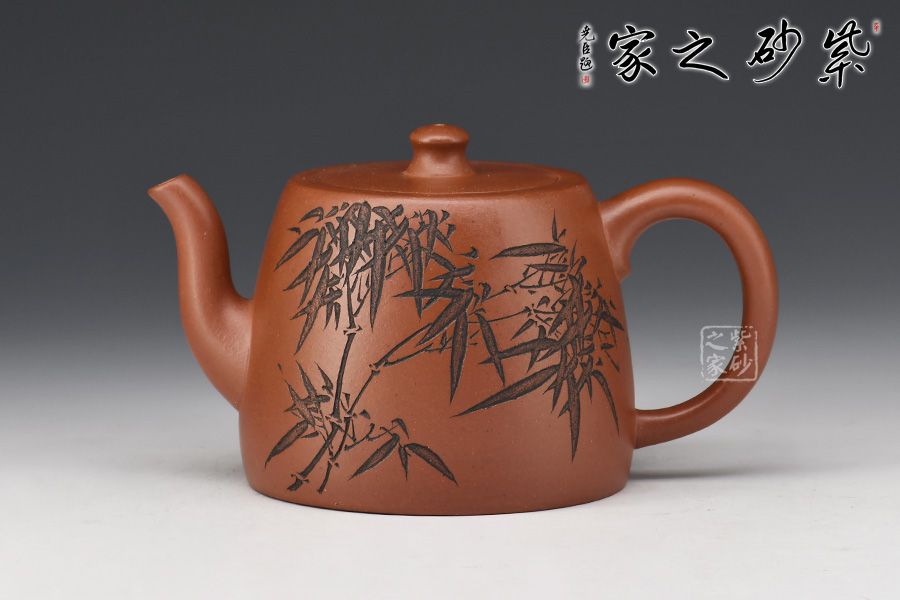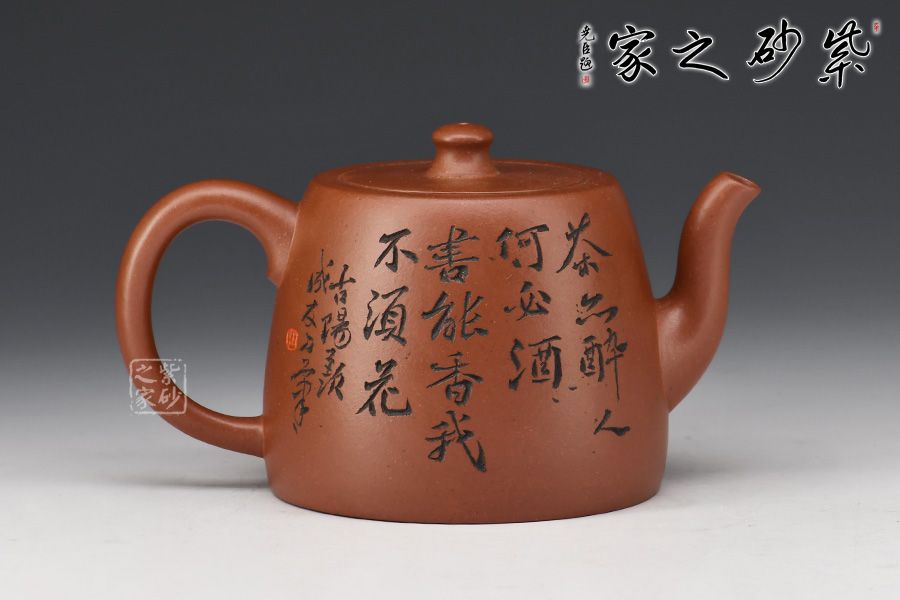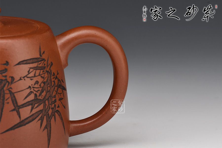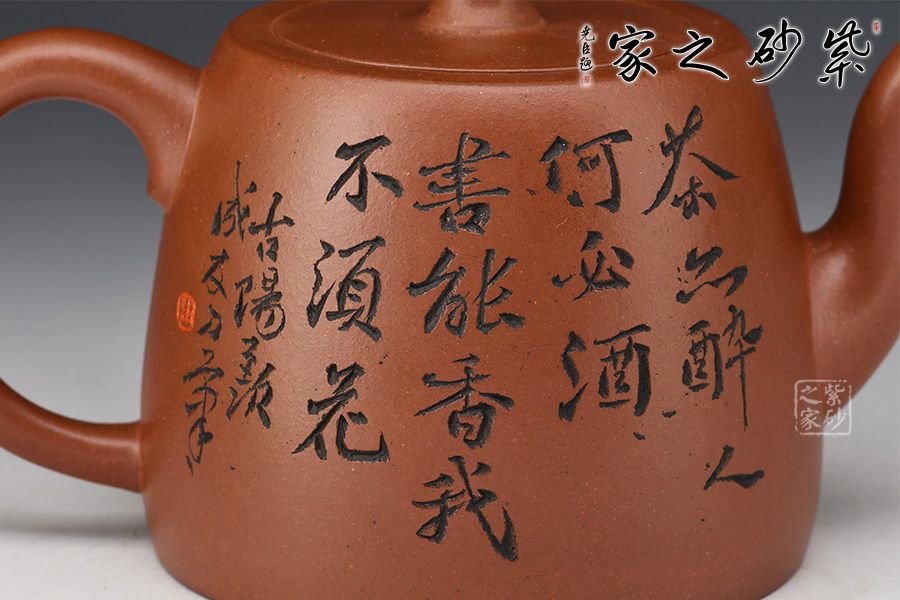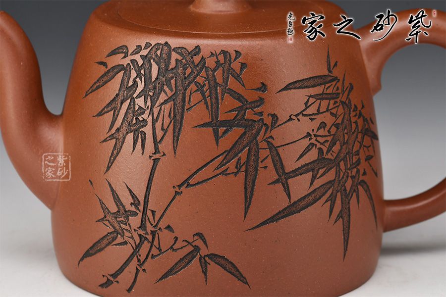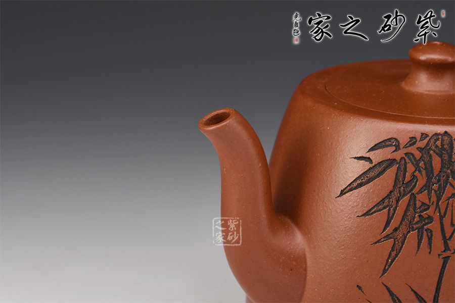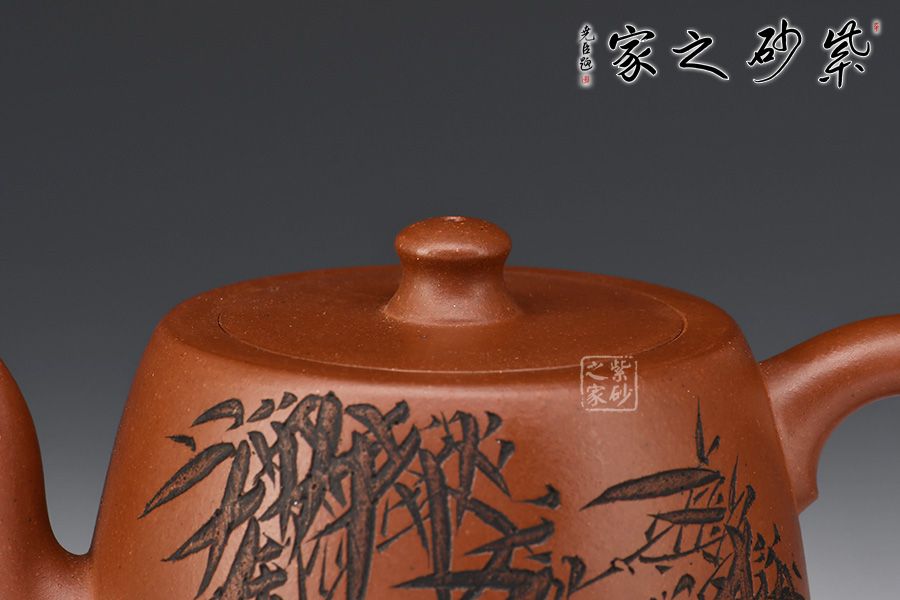 此款壺,具有井欄壺的特點(diǎn),彎流嘴線條優(yōu)美,嘴口圓潤,出水流暢爽利。嵌蓋設(shè)計(jì),與壺身混若一體,天衣無縫,氣密性極好。壺身正面刻繪了一幅竹林茂密的詩意畫卷,反面刻繪“茶亦醉人何必酒 書能香我不須花”。作者隨性自在、脫俗高遠(yuǎn)的心性躍然壺上!