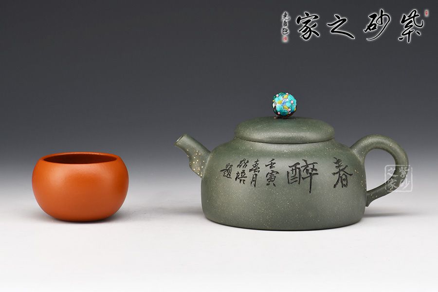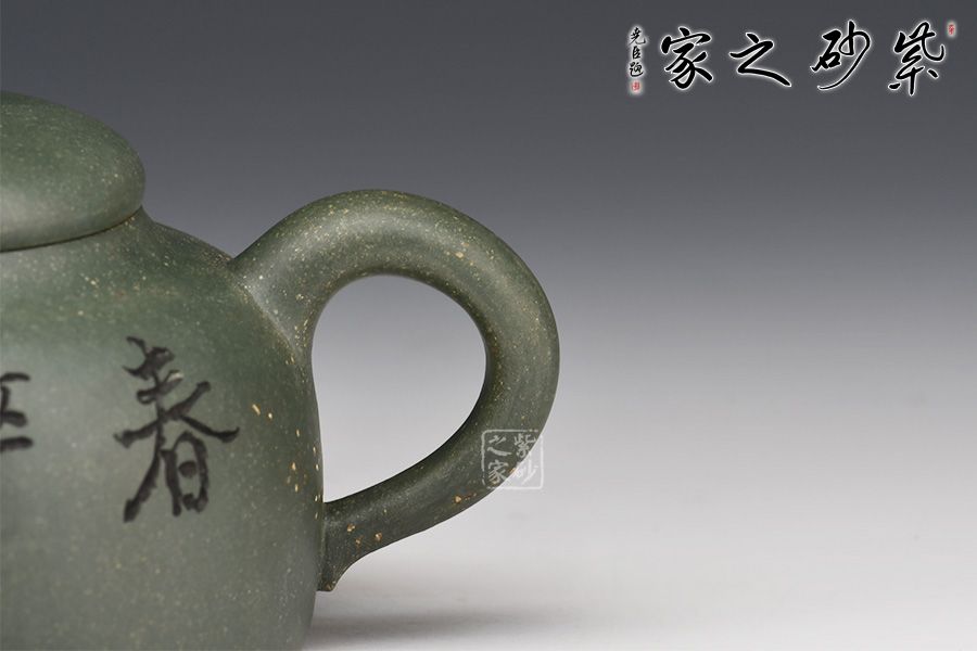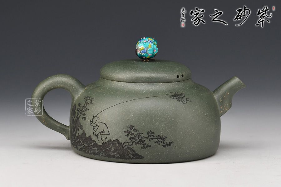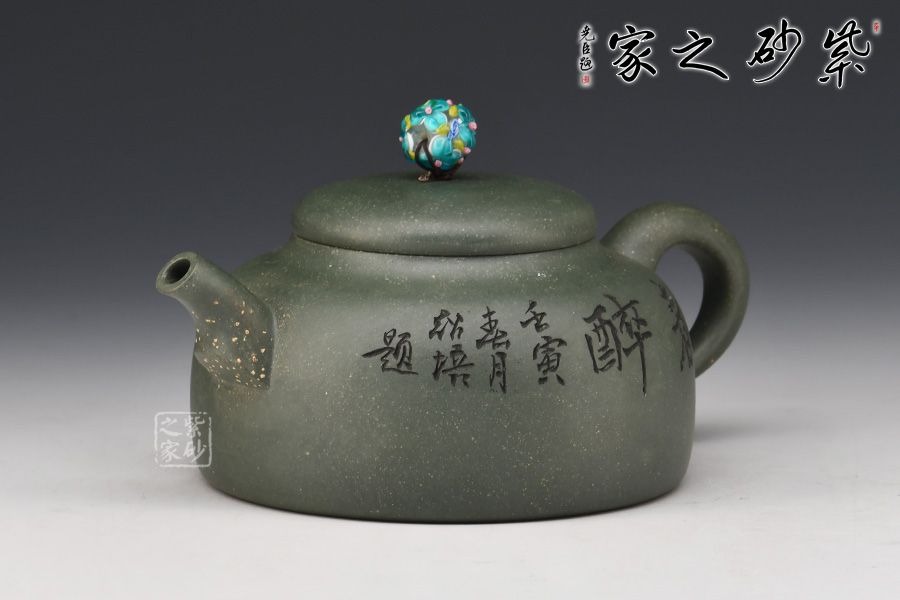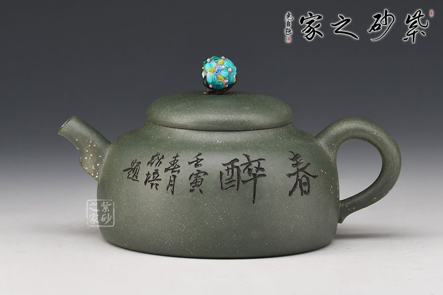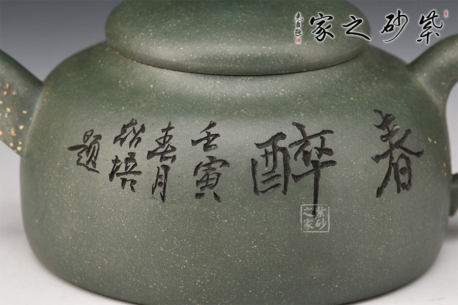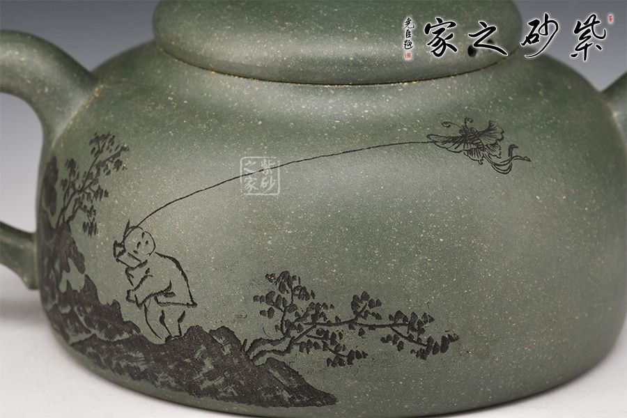 此款春醉壺與顧景舟的雪華壺屬同一配方配制而成,泥中有段砂,燒成后的效果如同雪花似的!器型簡潔大方,繡球壺鈕有畫龍點睛之感,引人注目,壺身正面刻繪“春醉”,反面配以小兒放風箏的畫面,童趣盎然!
