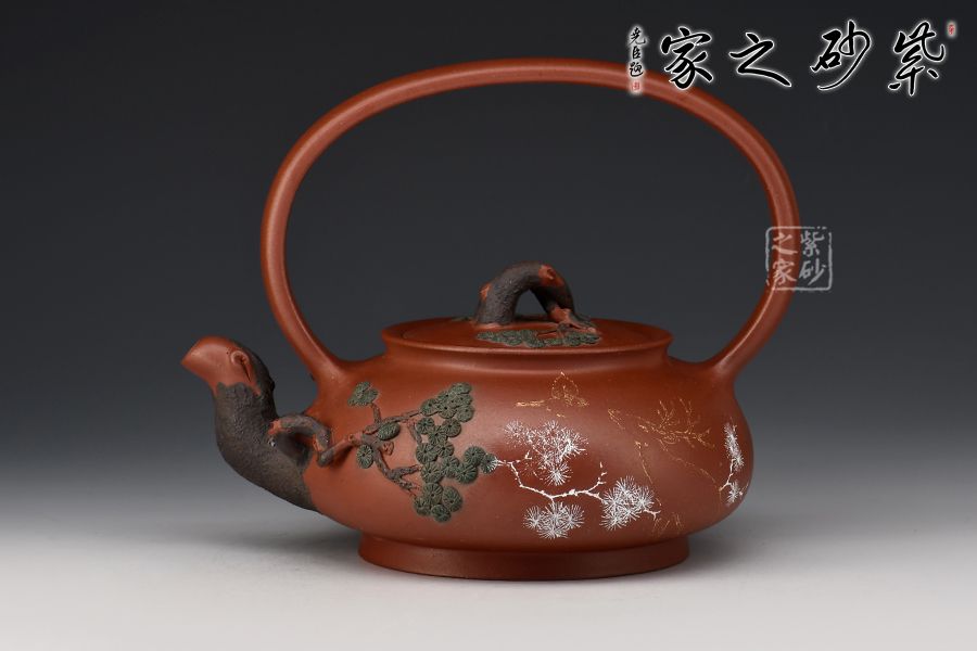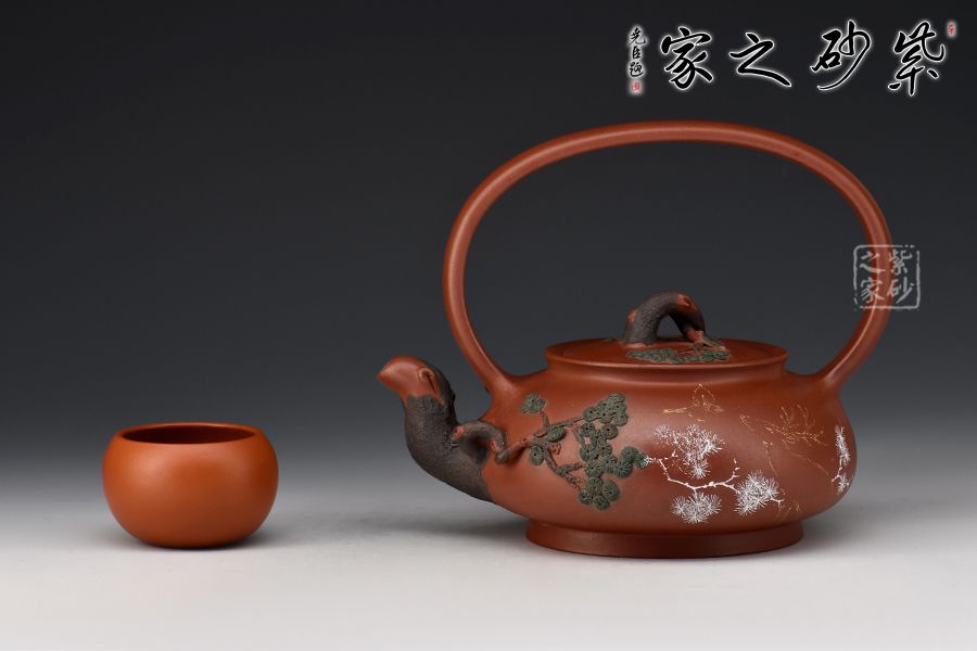 此壺造型新穎奇特,構(gòu)思獨(dú)具匠心。以松鶴延年為靈感進(jìn)行創(chuàng)作,壺身圓潤(rùn)飽滿,刻繪仙鶴,翩翩起舞。壺流、鈕皆仿生梅樁設(shè)計(jì),形象逼真,其上分布若干梅花細(xì)枝,并點(diǎn)綴朵朵梅花。壺把以一枝竹節(jié)由下而向上延伸,拿捏舒適。整壺寓意非常好,適合送禮或者自用。