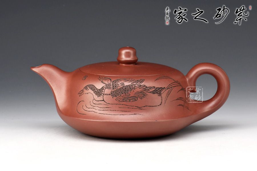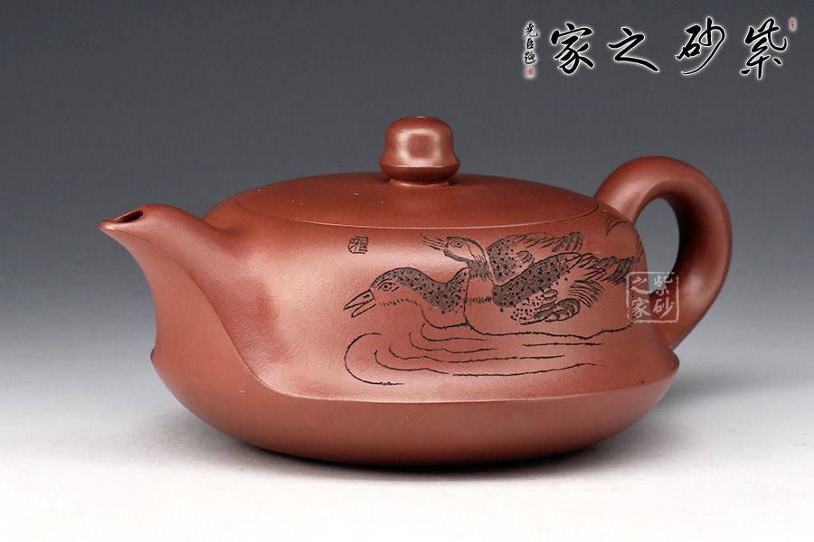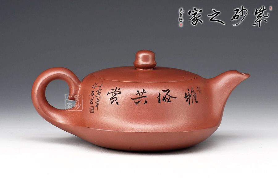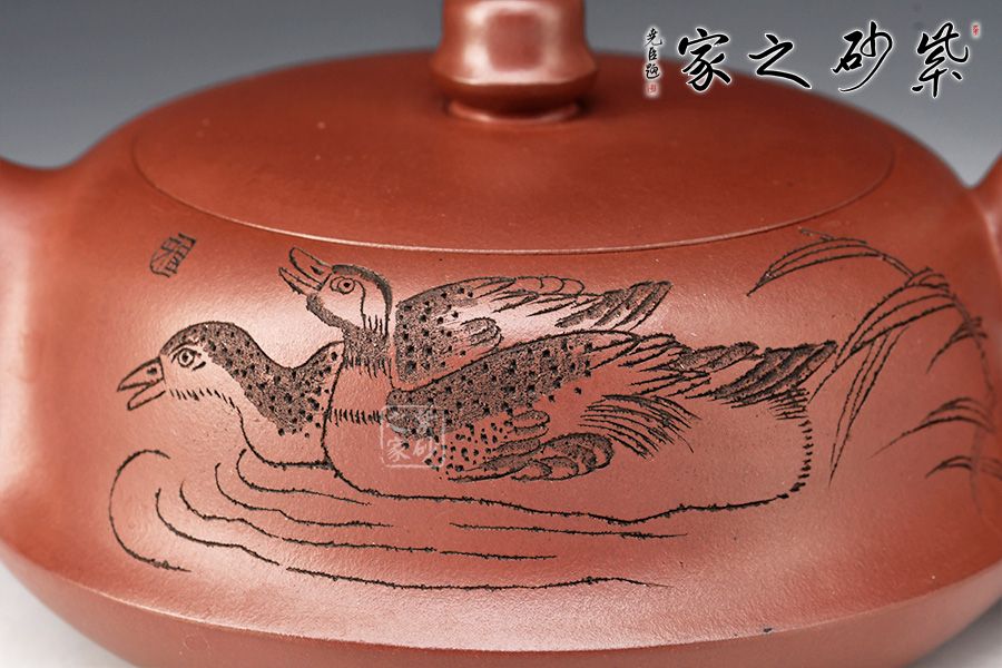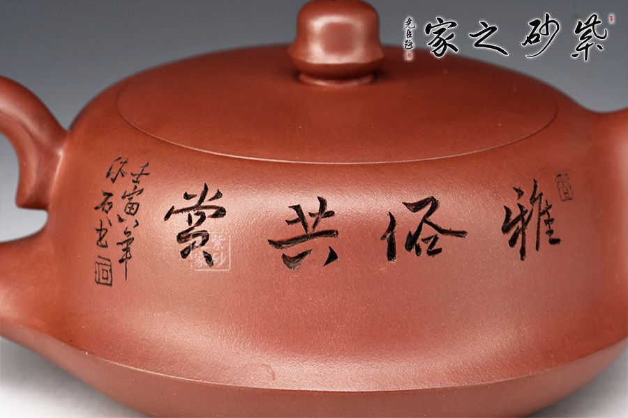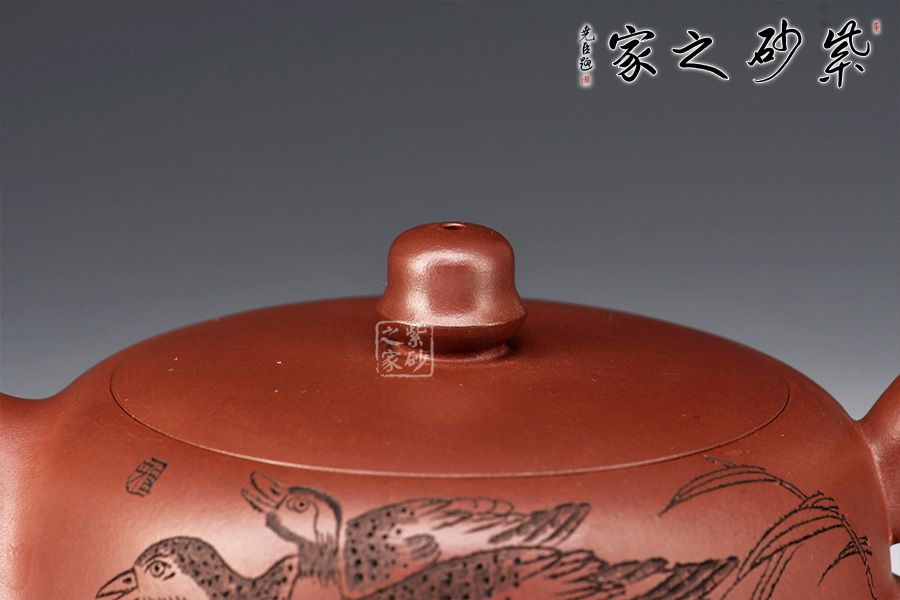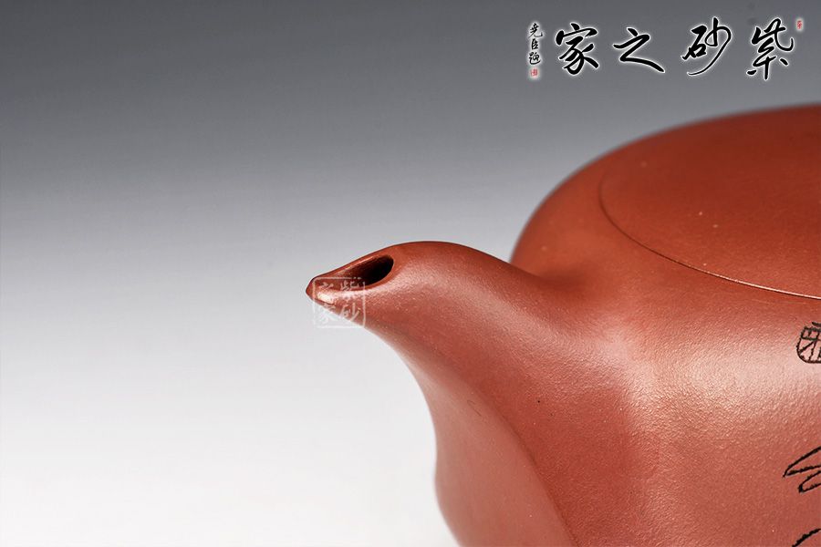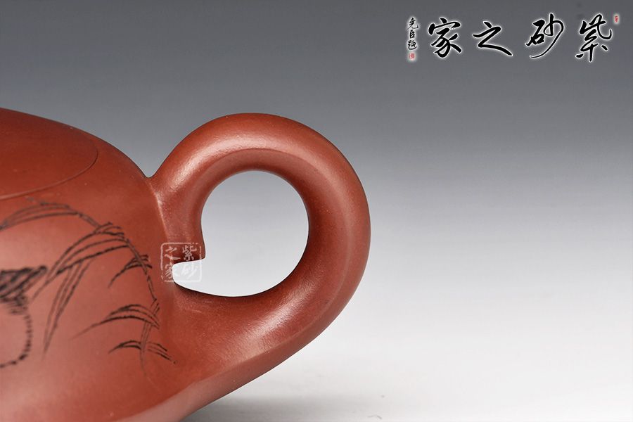 此壺圓潤飽滿,線條流暢,壺底如同一個盤子與壺身相接,相交處可見一條腰線,力蘊十足。壺嘴與壺把皆從底部腰線延伸而出,線條粗礦。壺嘴口朝天,流線微彎,出水短而粗大;壺把從下而上,與壺身相合;柱形鈕,口蓋嚴(yán)密,保溫性好。
